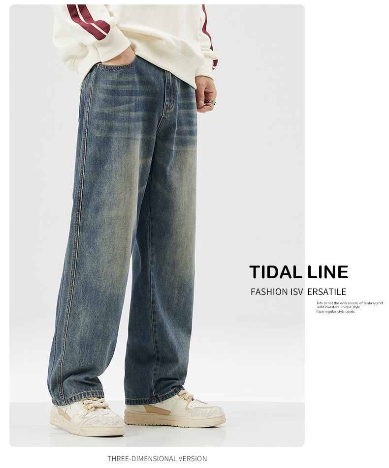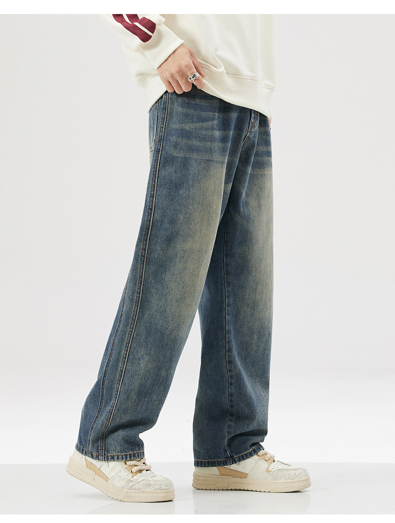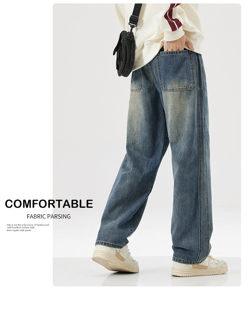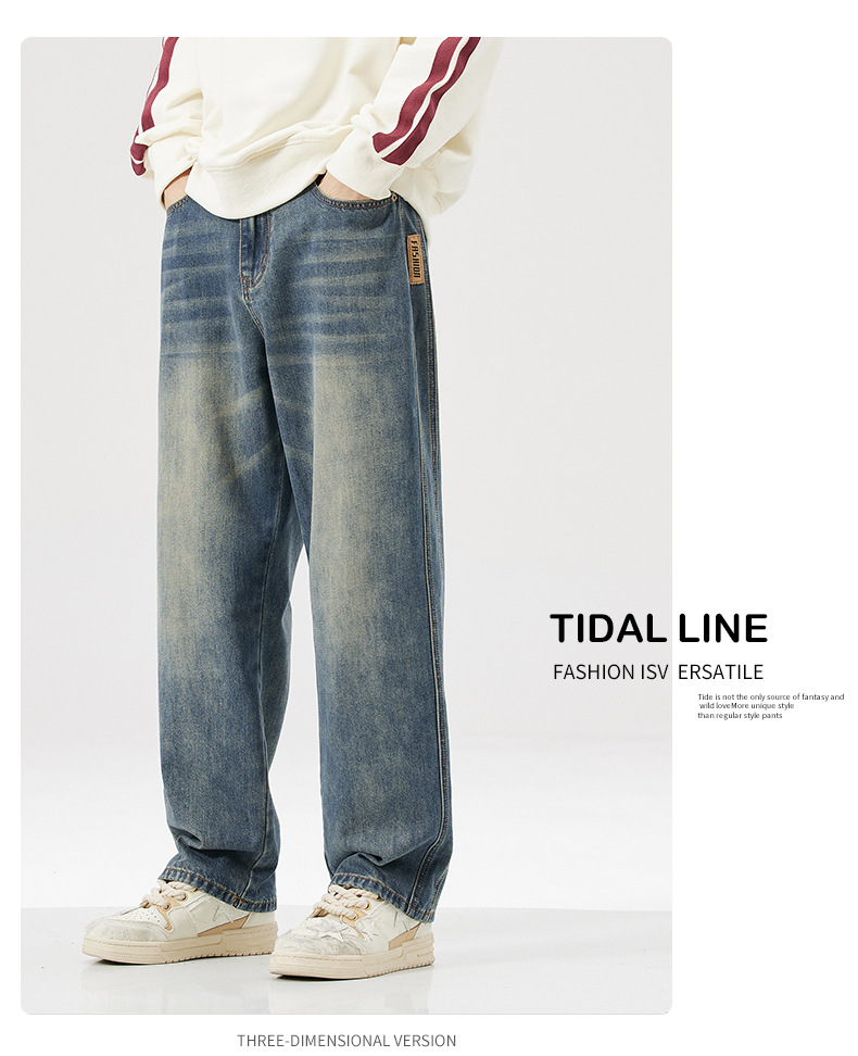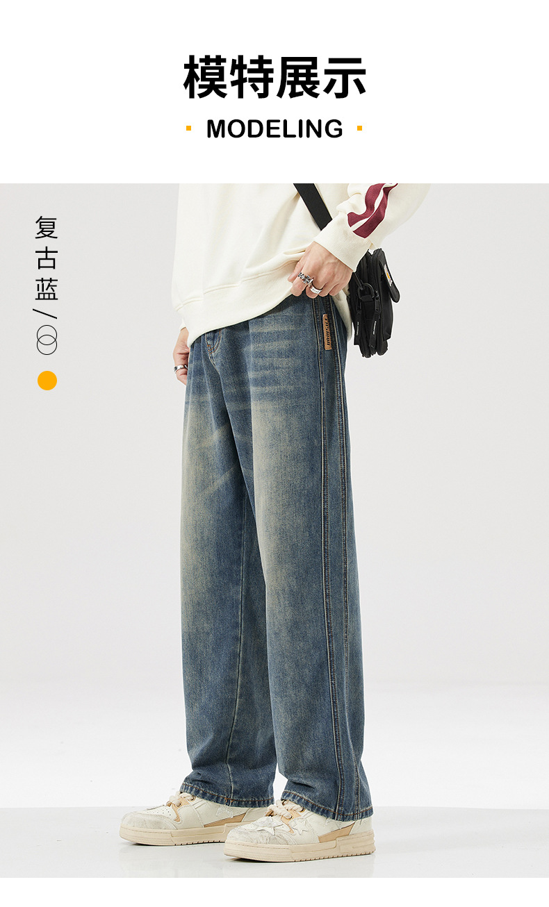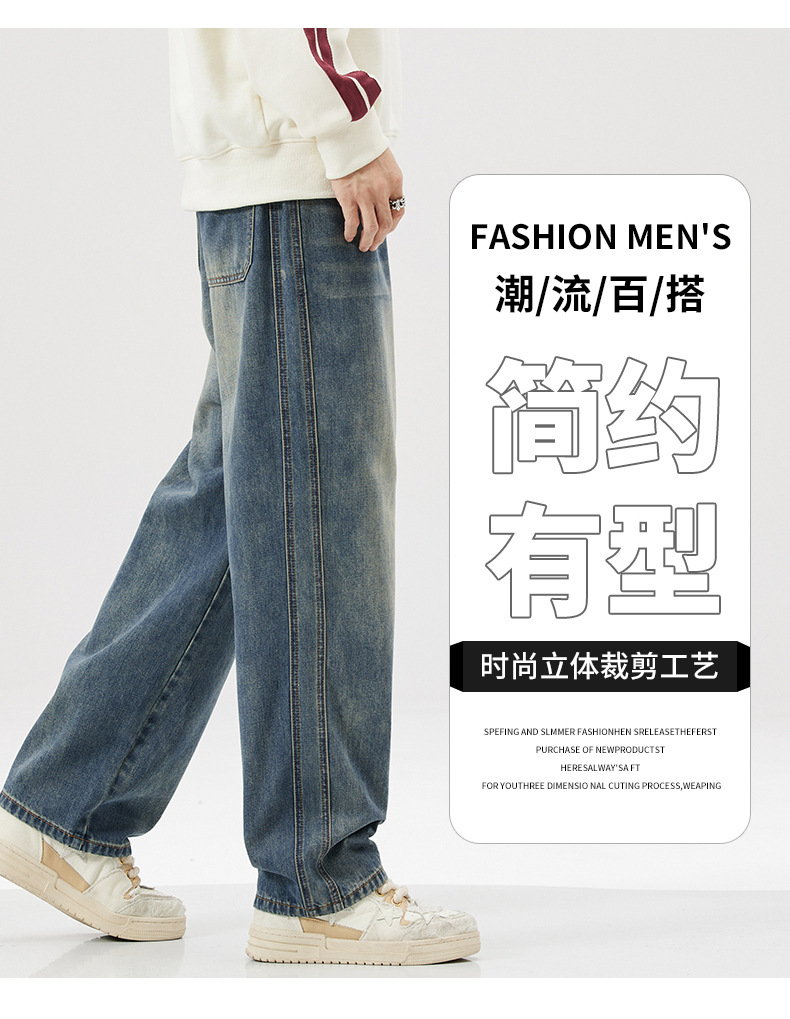 复古水洗男生阔腿牛仔裤宽松直筒2023秋季美式潮牌男士休闲长裤子