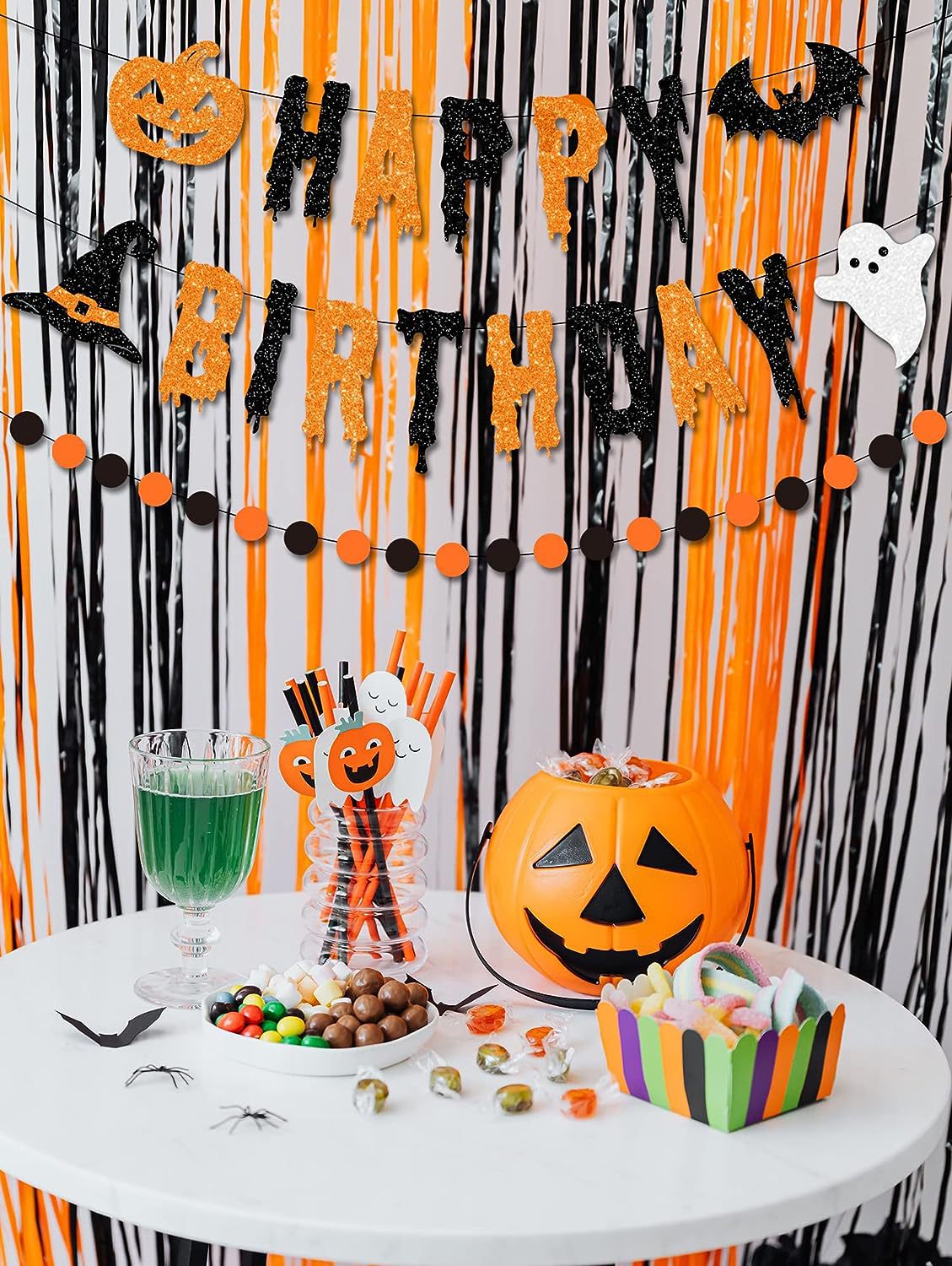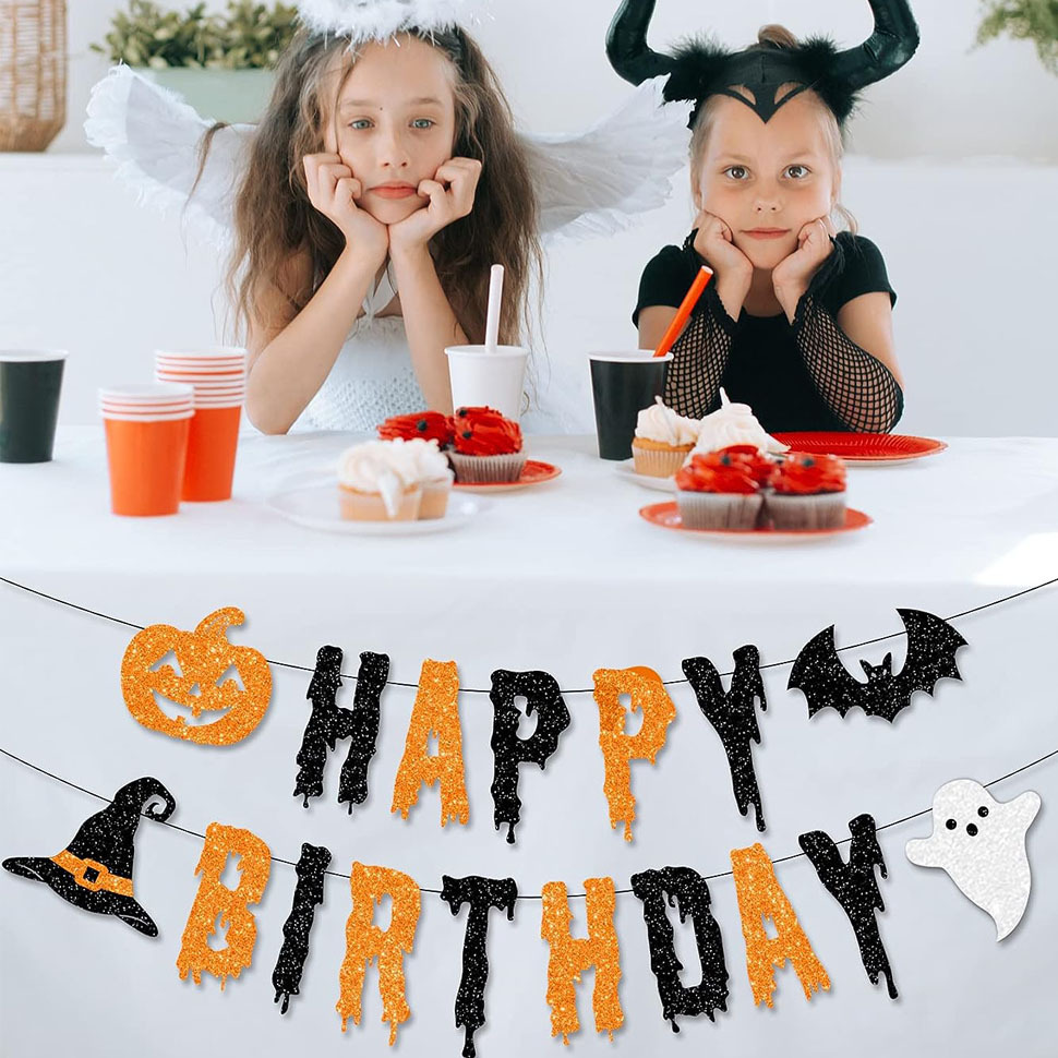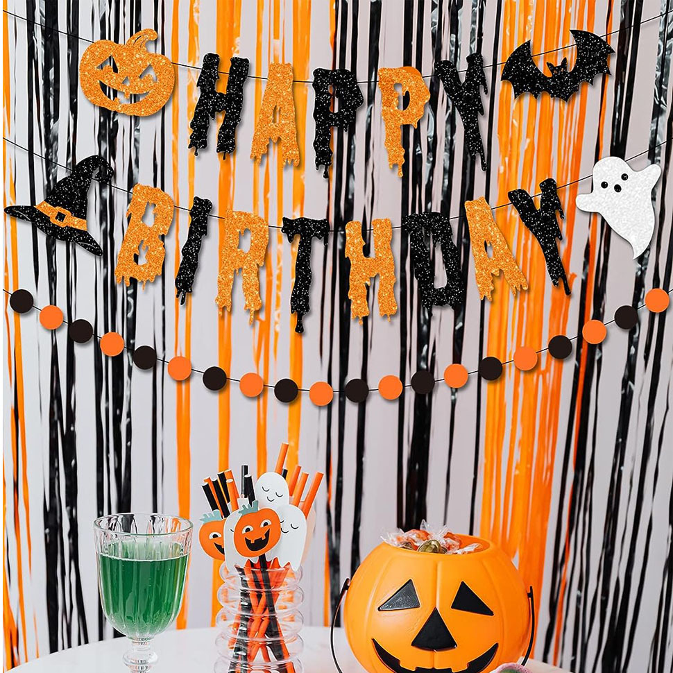 万圣节主题生日快乐纸质横幅 黑橙色万圣节生日彩旗派对墙壁装饰