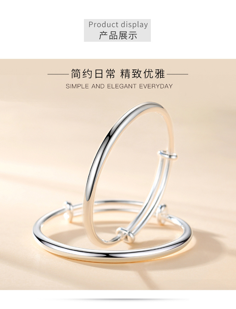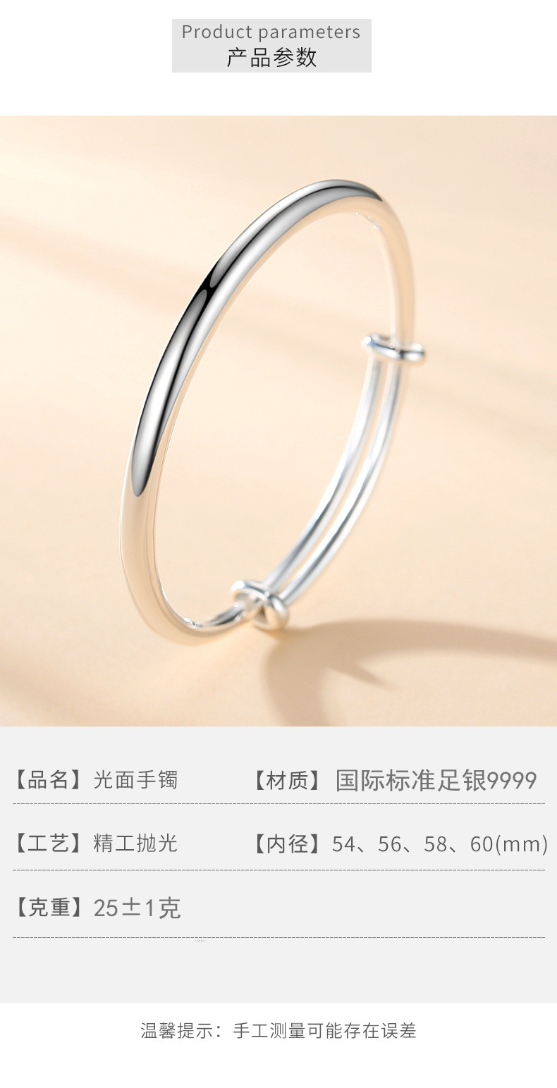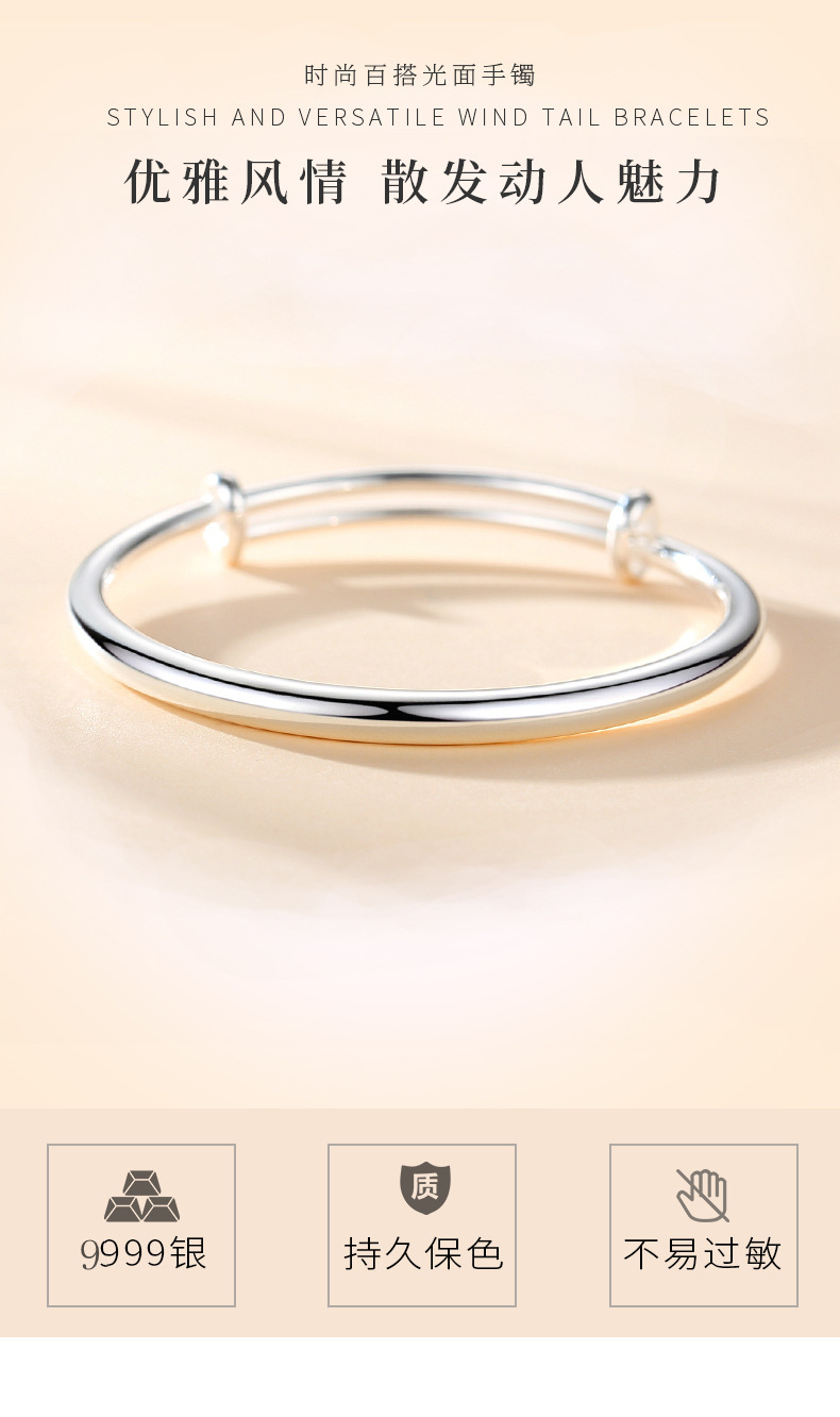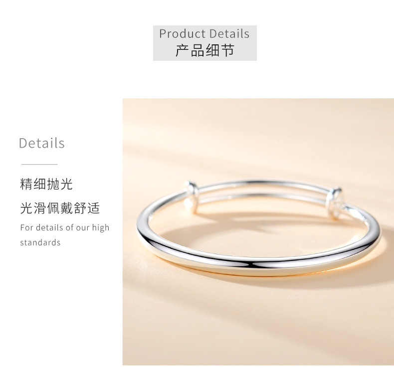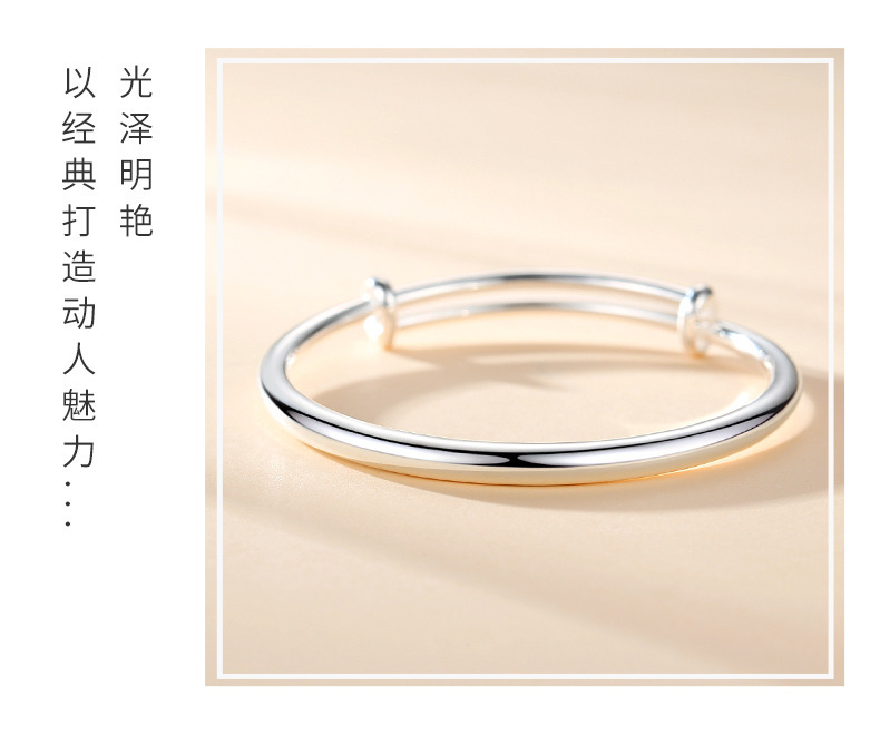 S9999纯银手镯女光面素圈圆棍手环简约百搭推拉小众实心足银镯子
