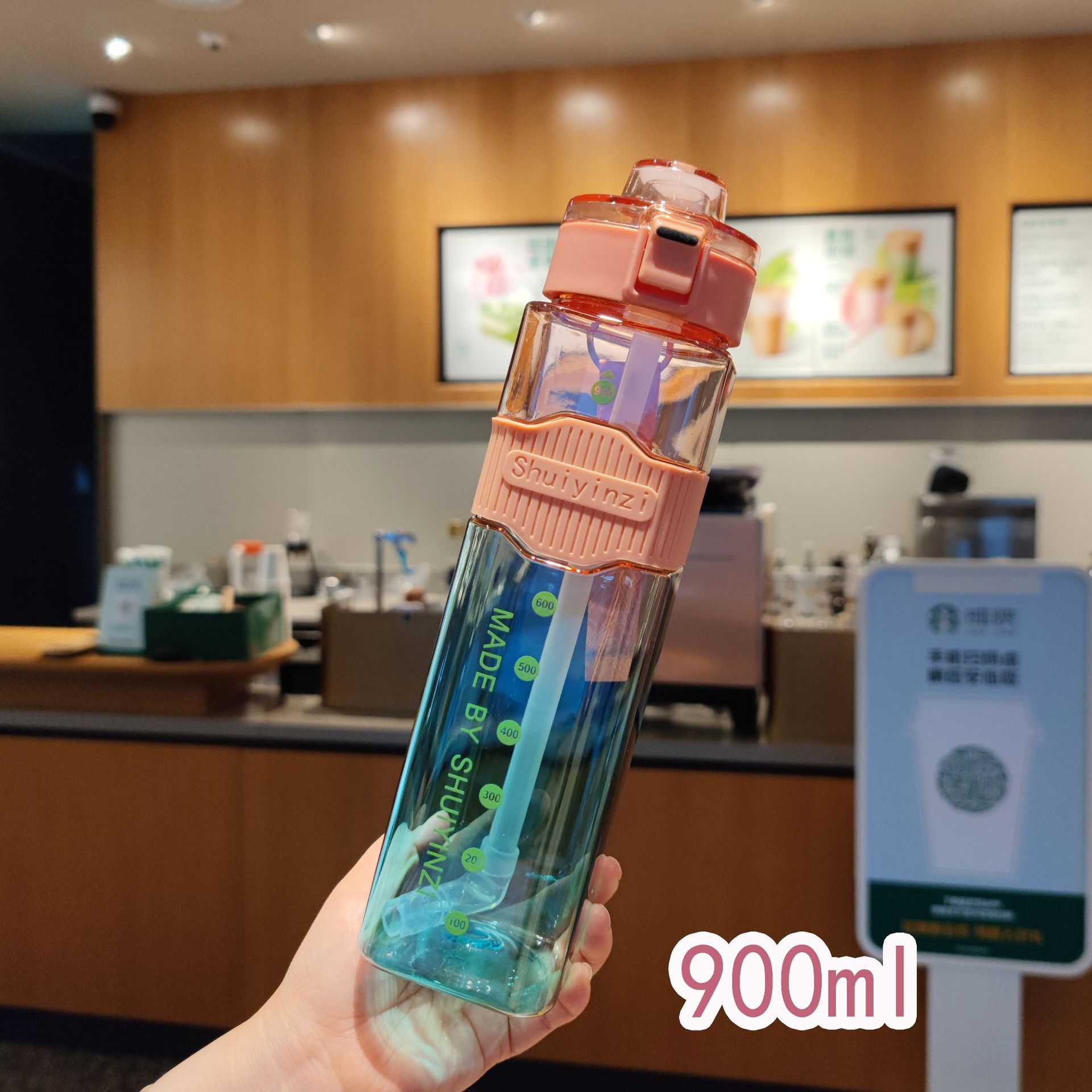 跨境正方形吸管塑料水杯简约炫彩刻度900ml户外便携手提水瓶贴纸