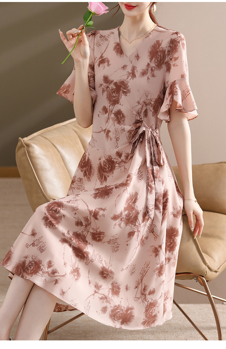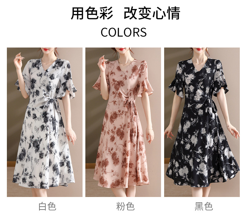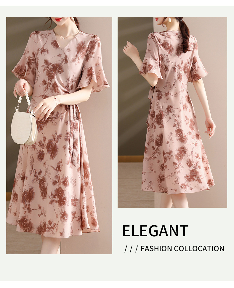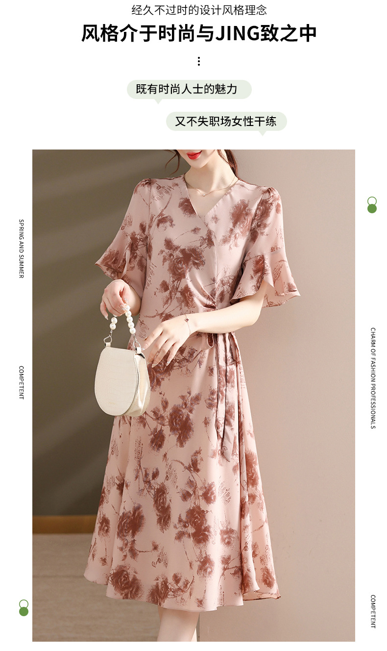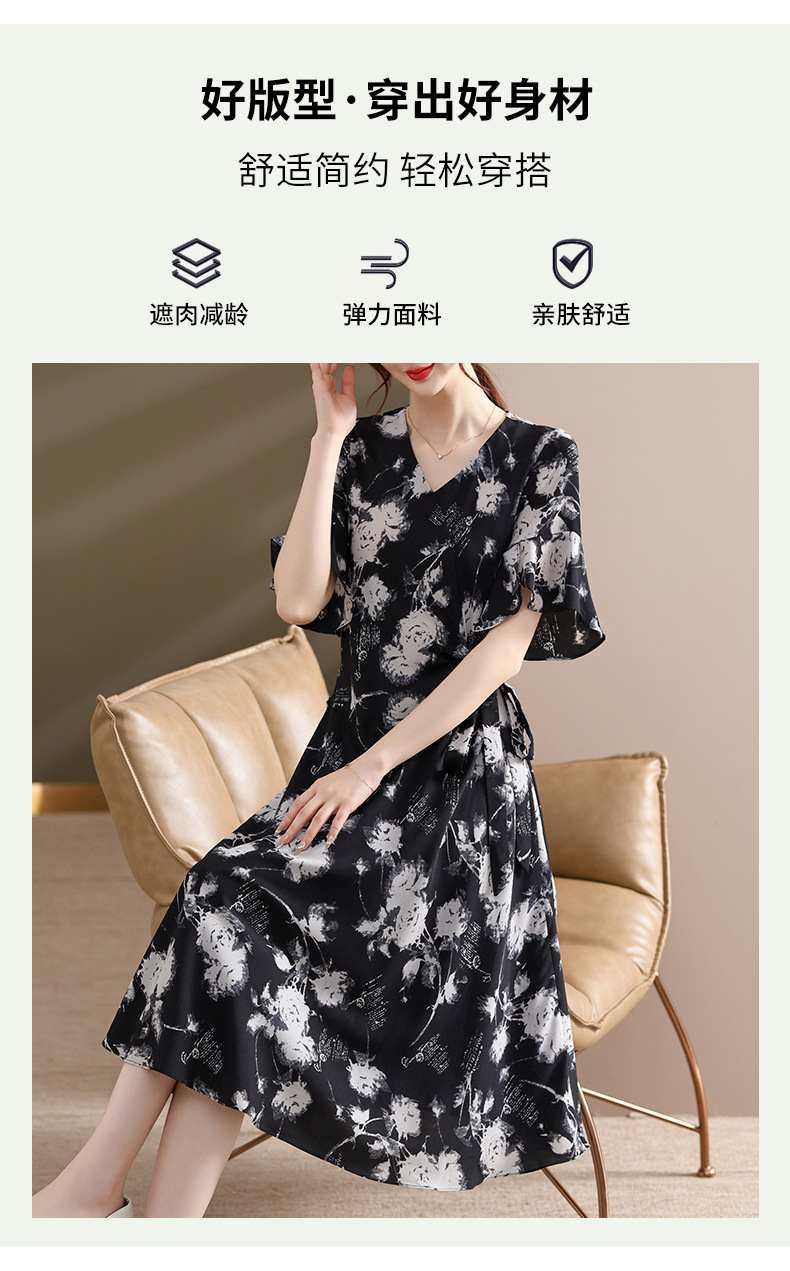 气质优雅连衣裙夏季新款V领系带妈妈装时尚减龄显瘦中老年女装潮