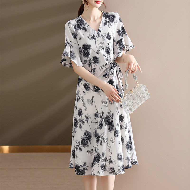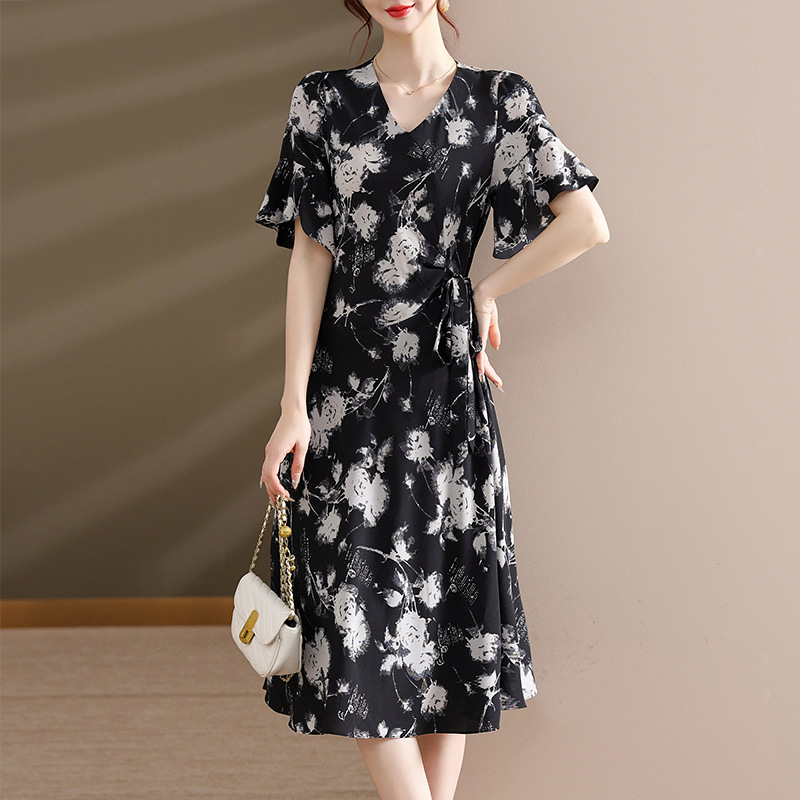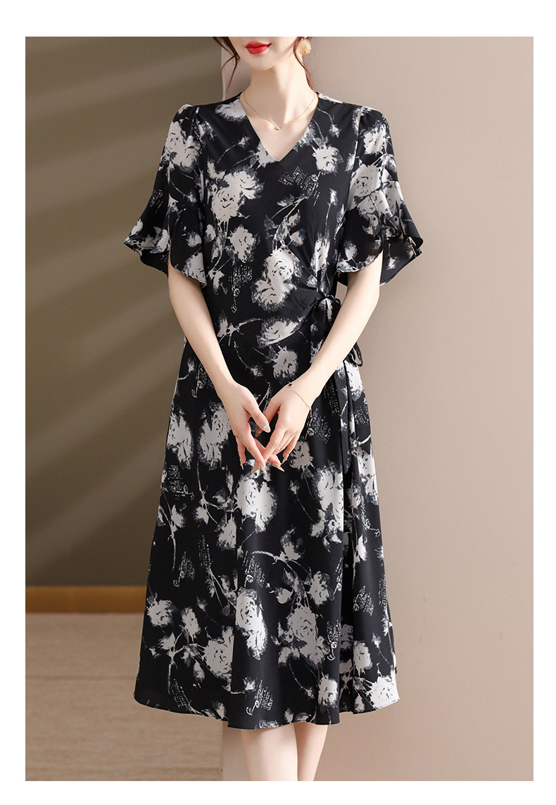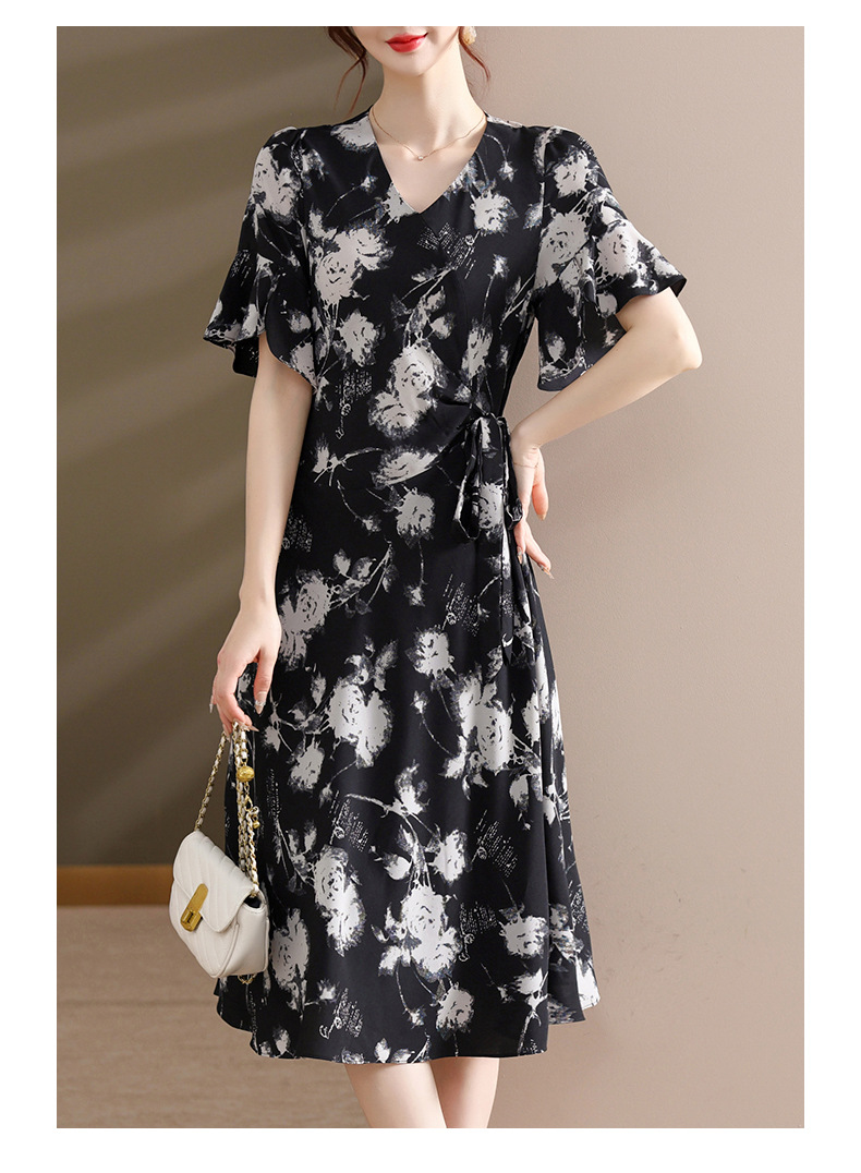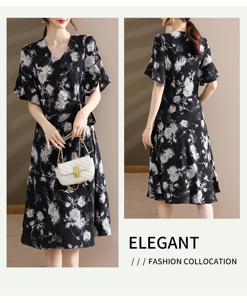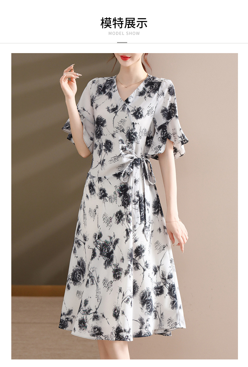 气质优雅连衣裙夏季新款V领系带妈妈装时尚减龄显瘦中老年女装潮