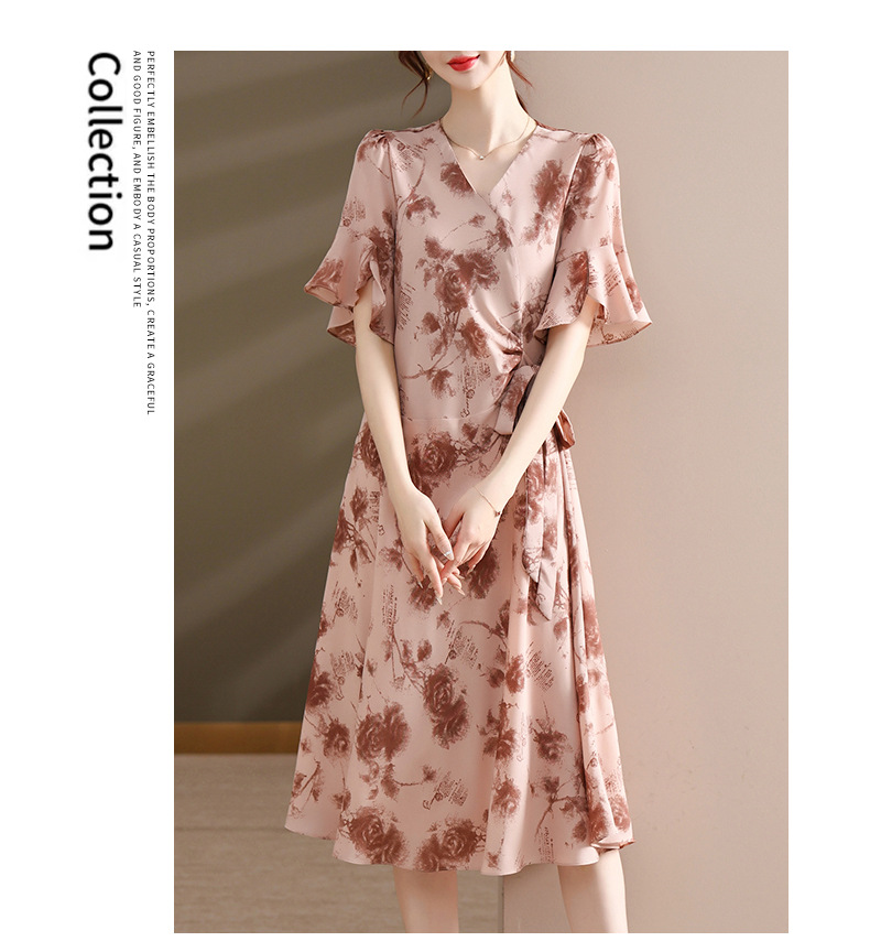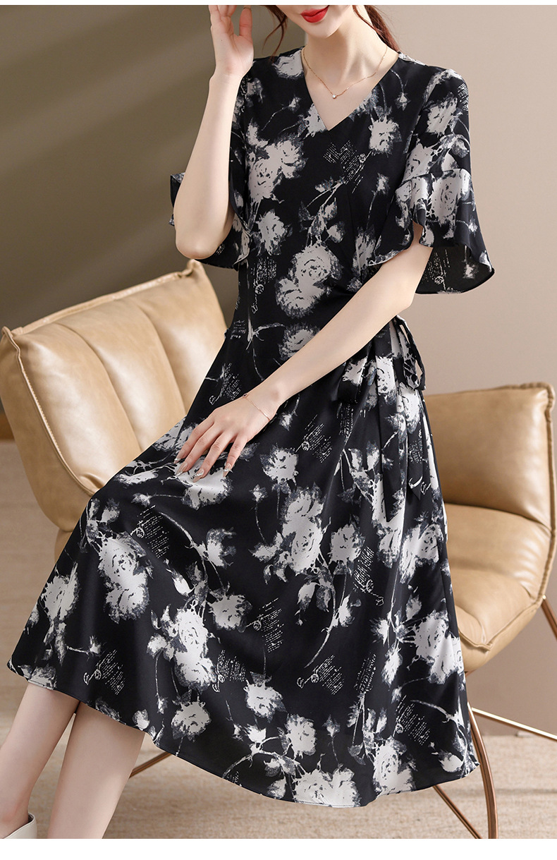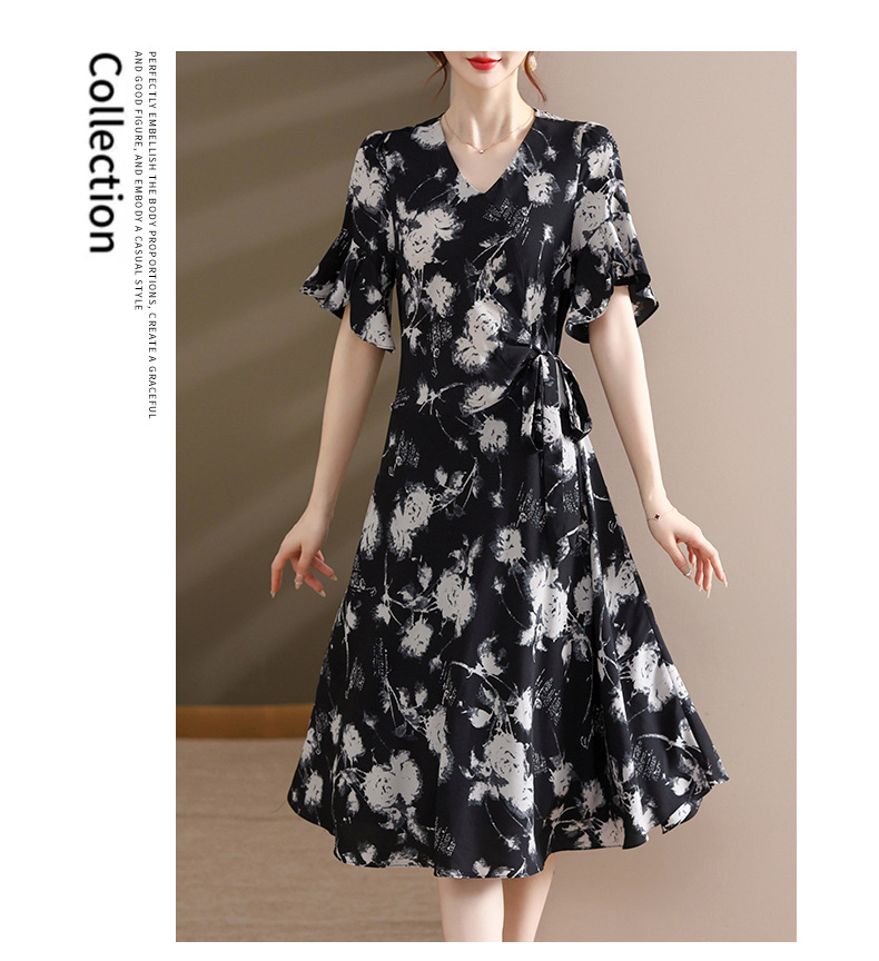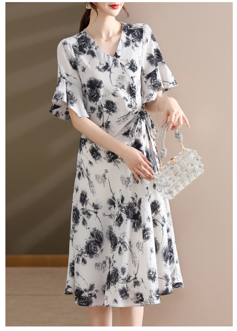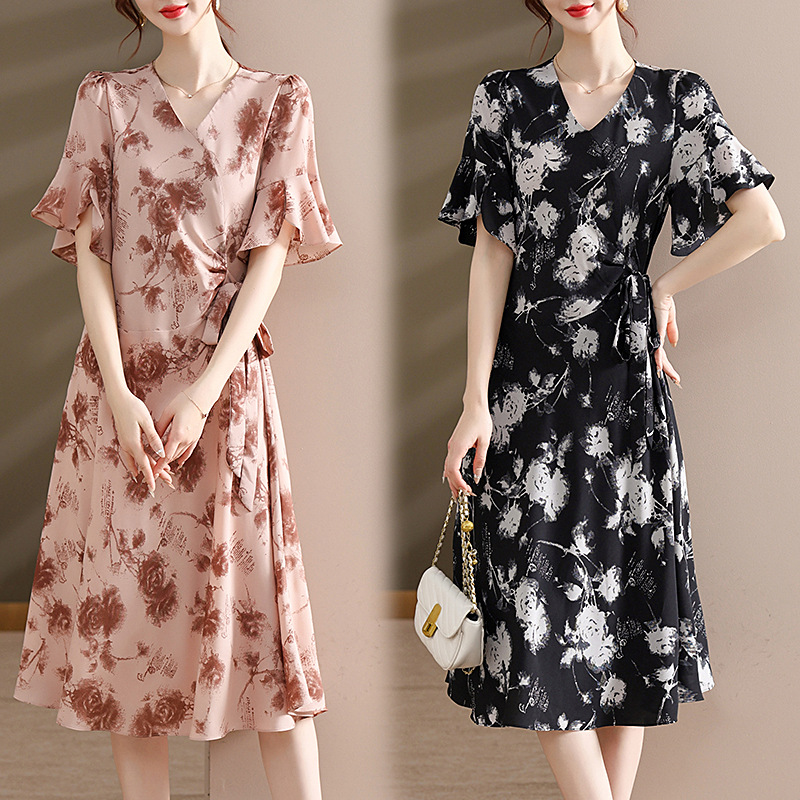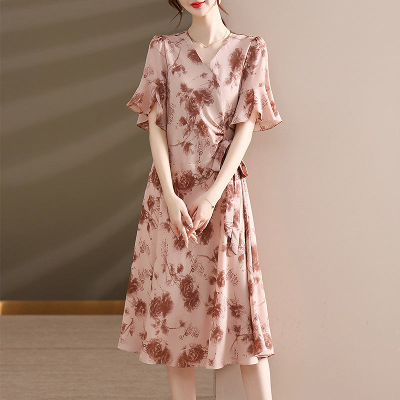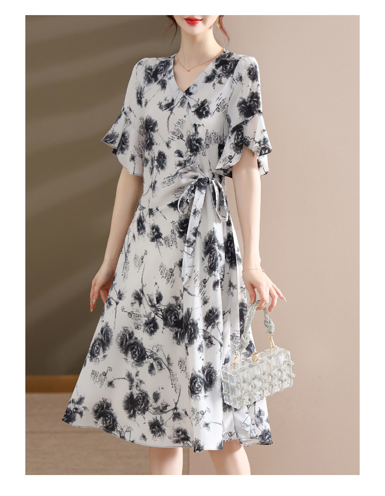 气质优雅连衣裙夏季新款V领系带妈妈装时尚减龄显瘦中老年女装潮