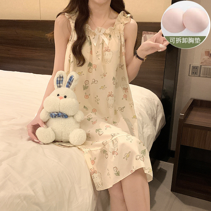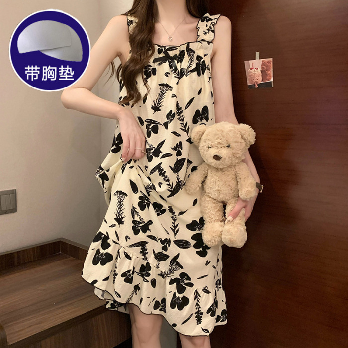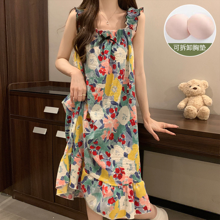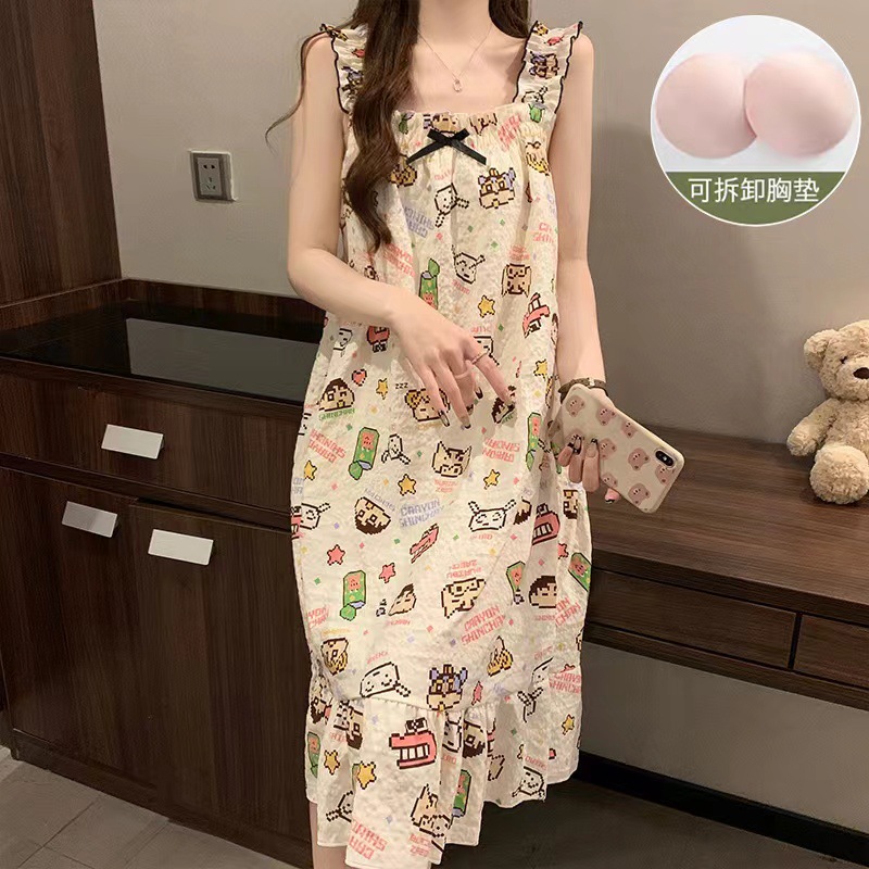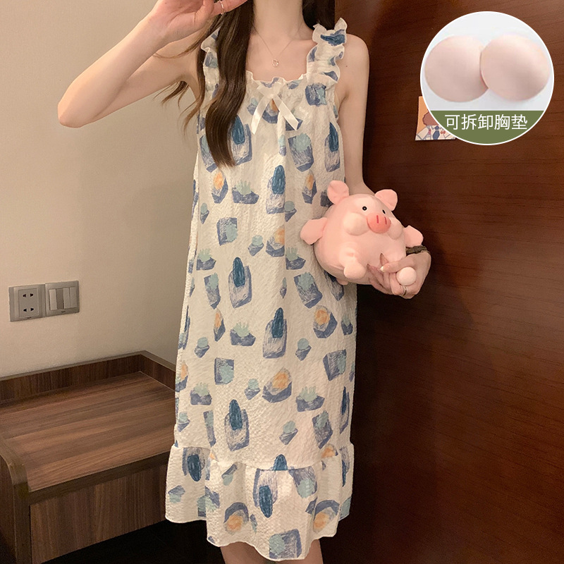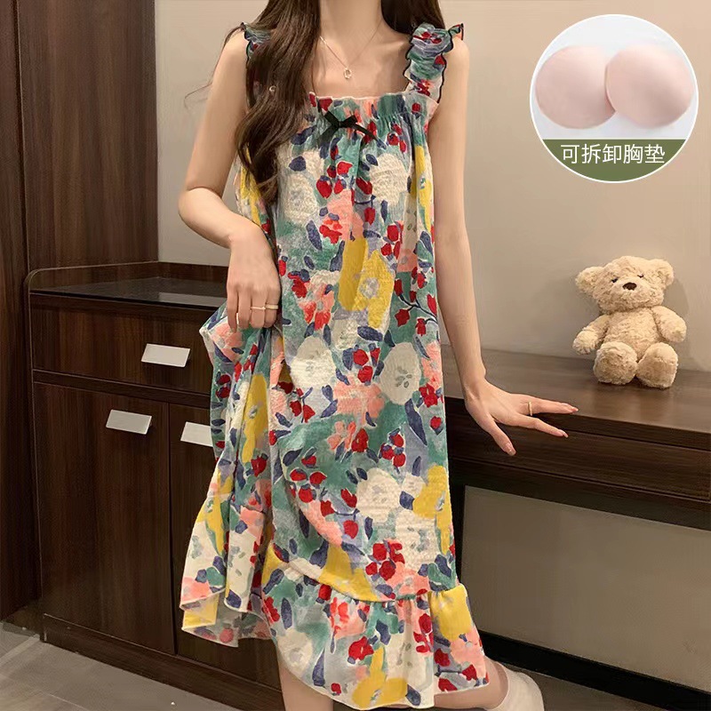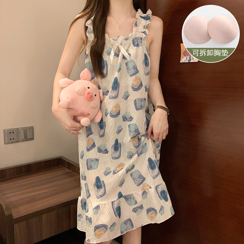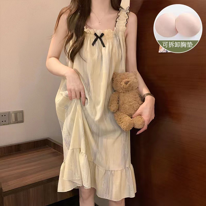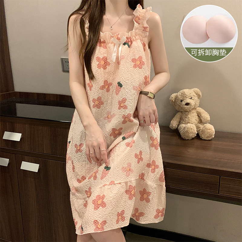 可拆卸带胸垫睡裙夏季女性感吊带薄款甜美连体泡泡棉可外穿家居服