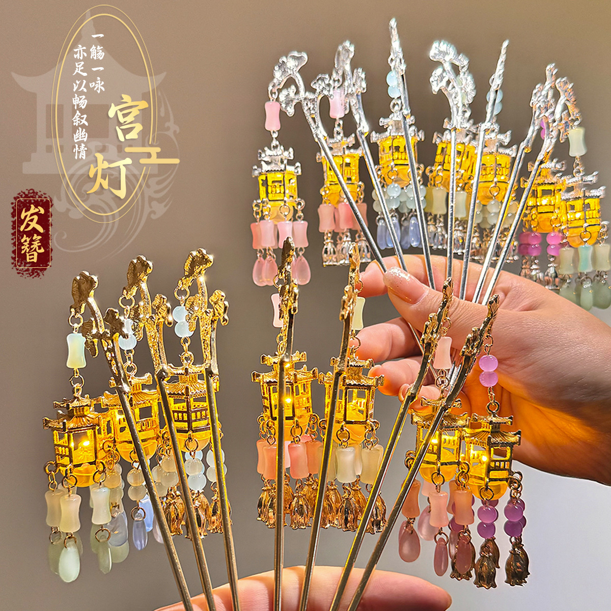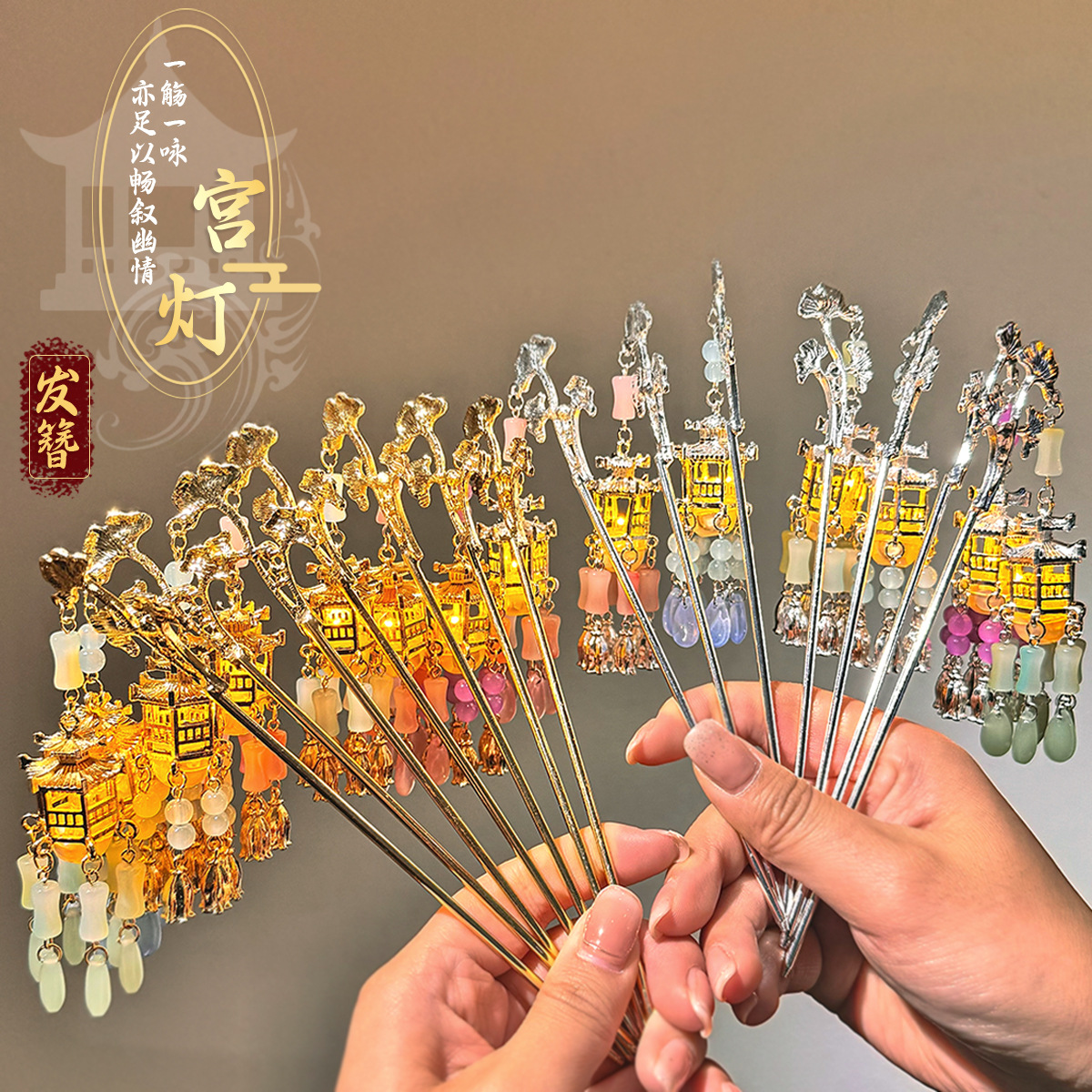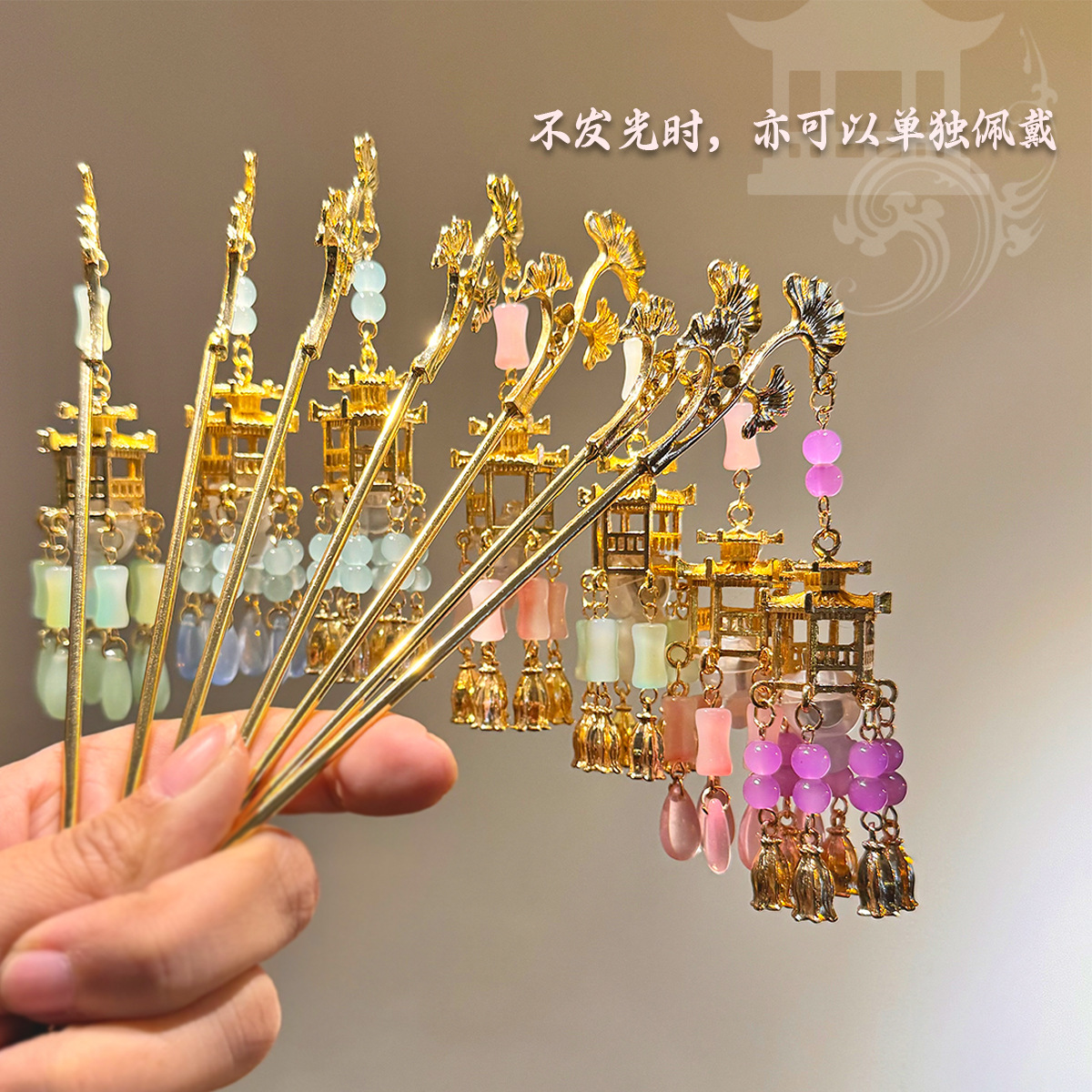 发光发簪古风高级感流苏凉亭宫灯簪子盘发簪花发钗宫廷汉服发饰