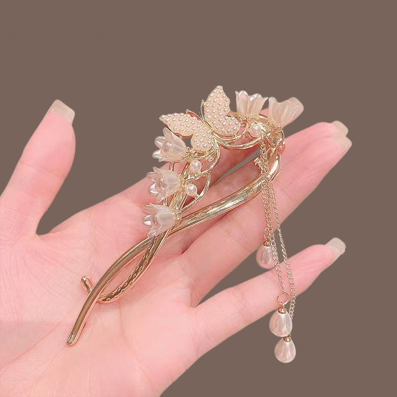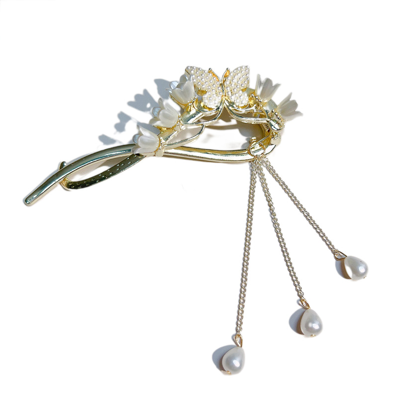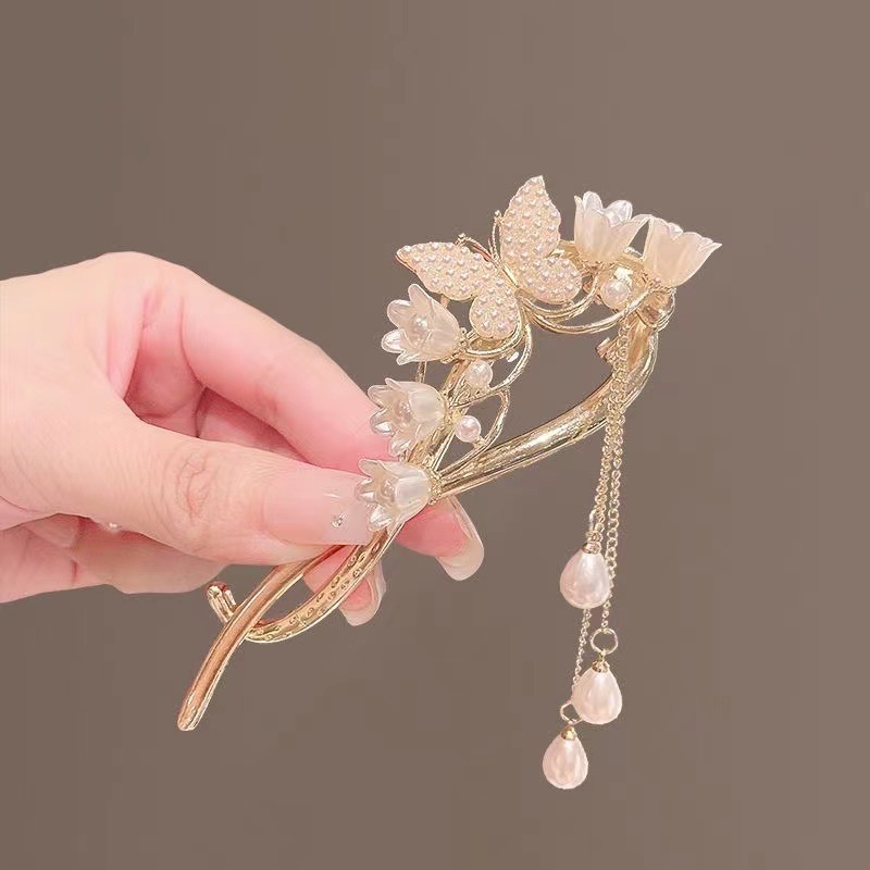 铃兰花蝴蝶珍珠流苏发夹女后脑勺盘发扭扭夹子半扎马尾抓夹发卡