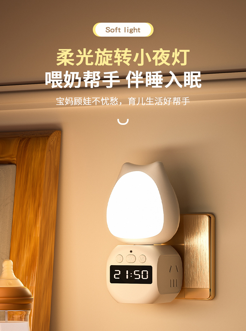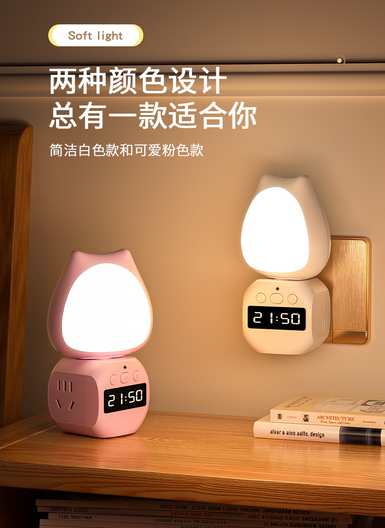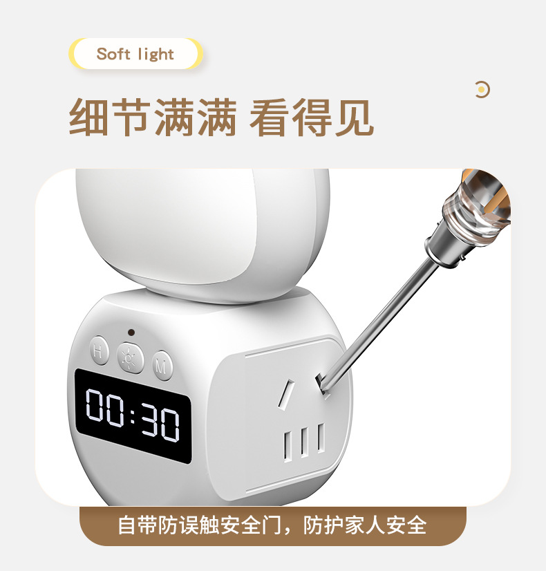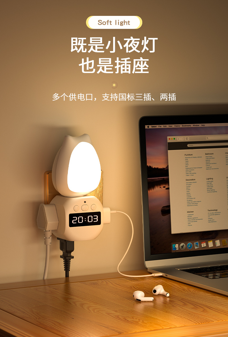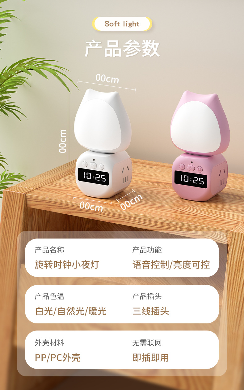 外贸专供【350度旋转】LED护眼智能语音控制带时钟显示排插两用
