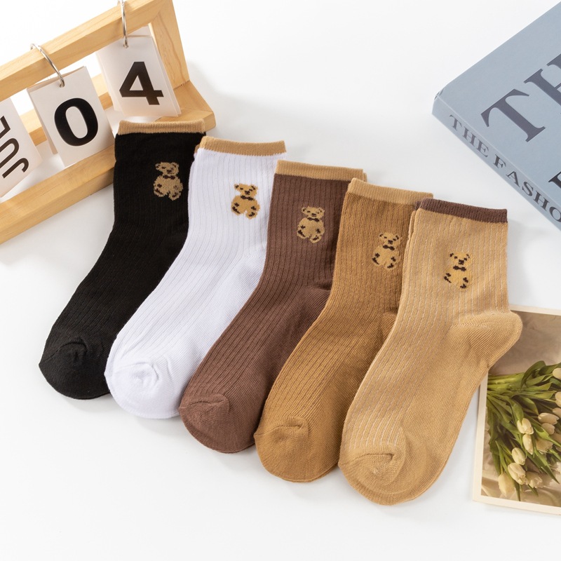 小熊袜子女中筒可爱日系百搭ins潮秋冬季棉袜加厚长袜春秋堆堆袜