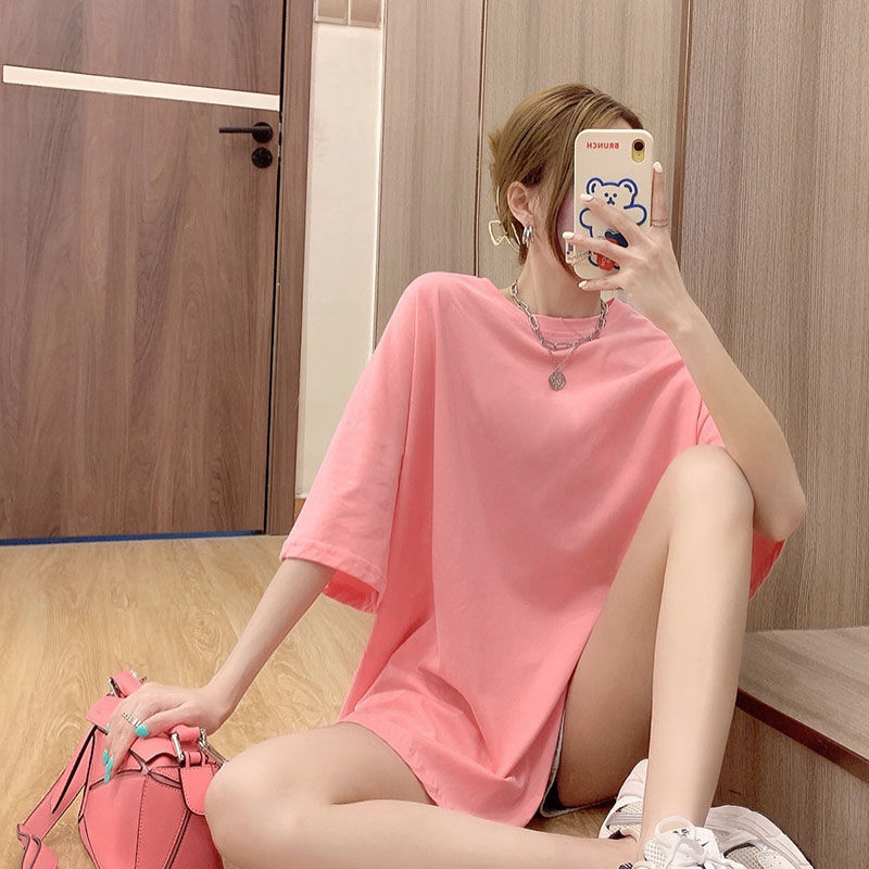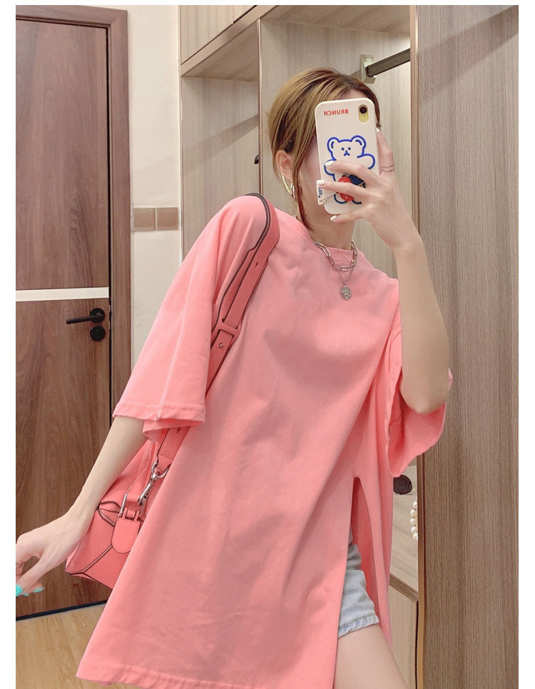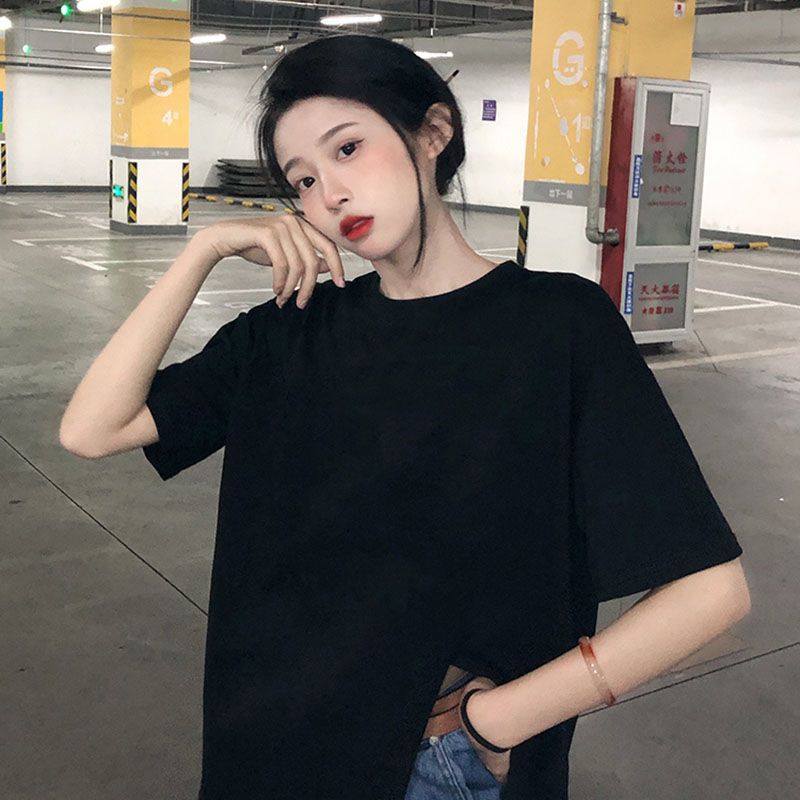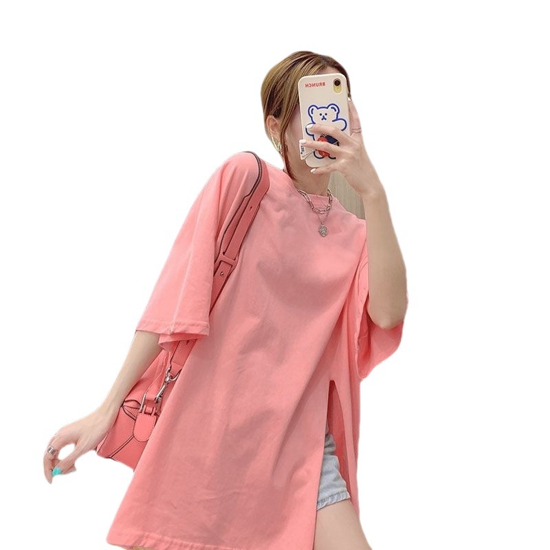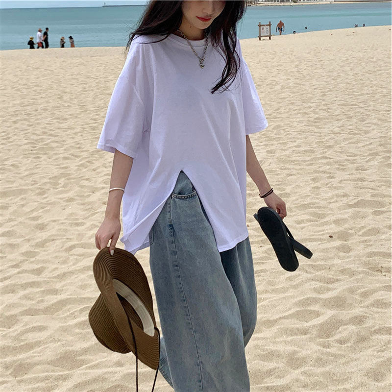 不规则开叉短袖T恤女宽松百搭中长款bf风简约打底衫ins潮