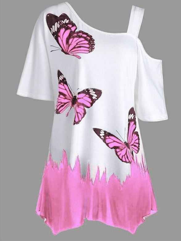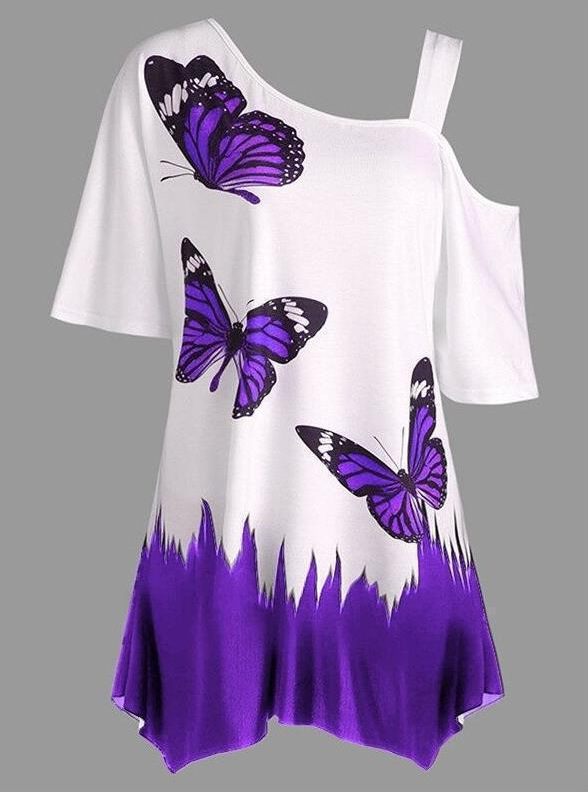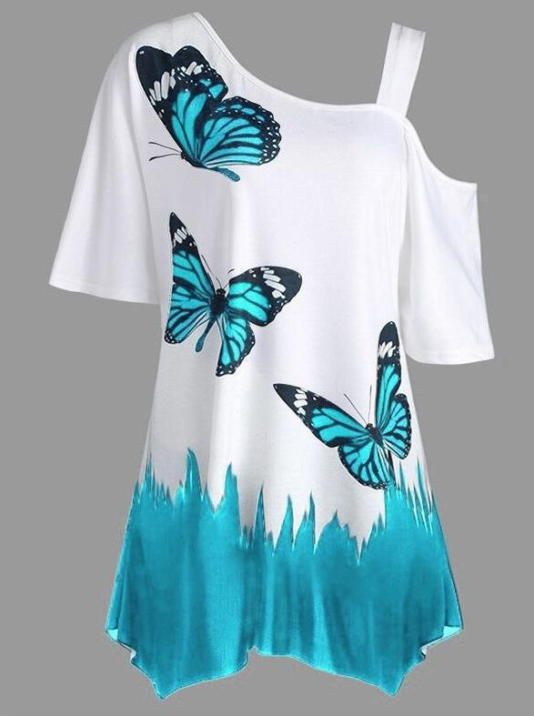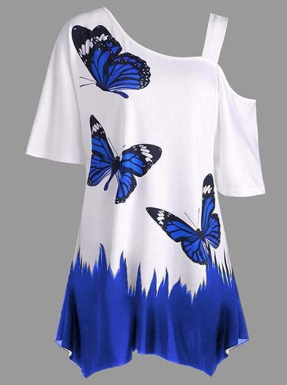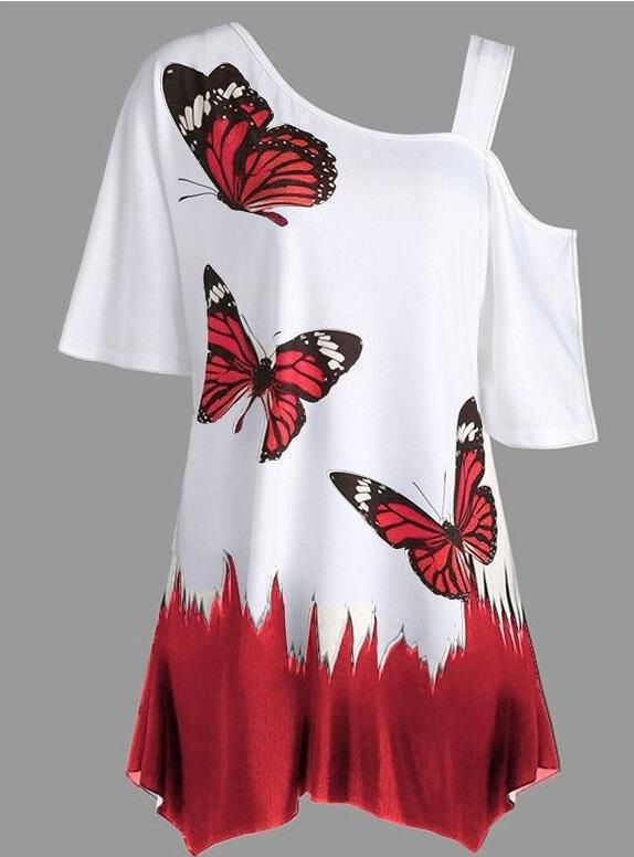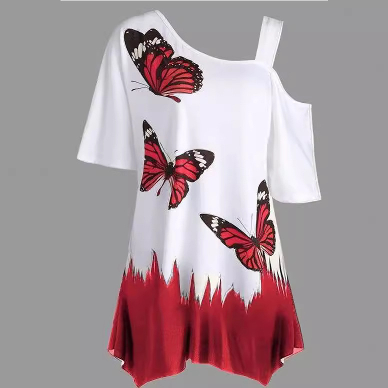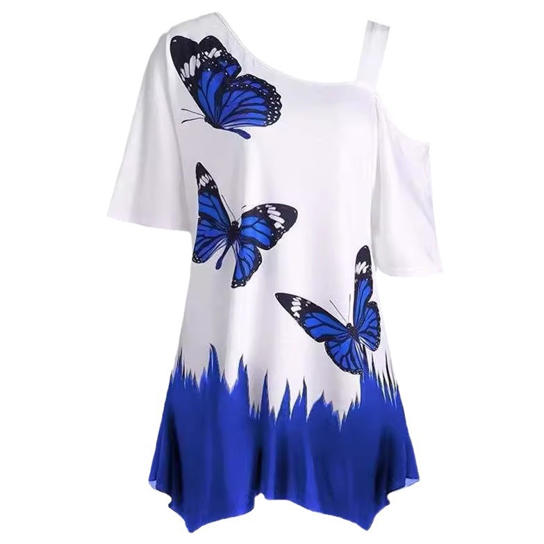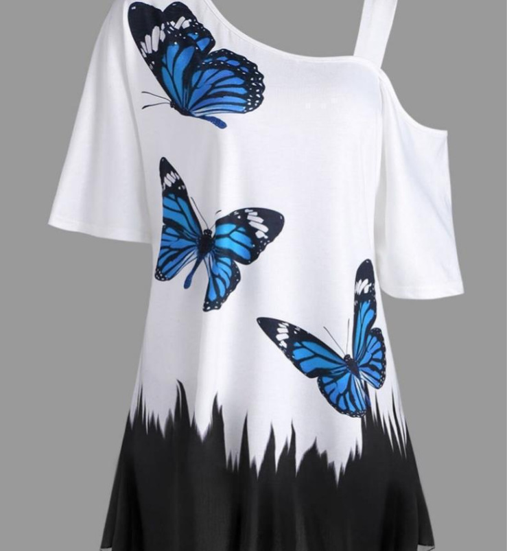 欧美新款蝴蝶数码印花单肩带T恤衫