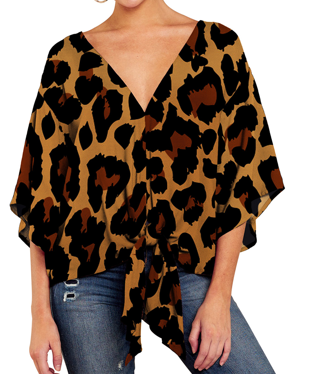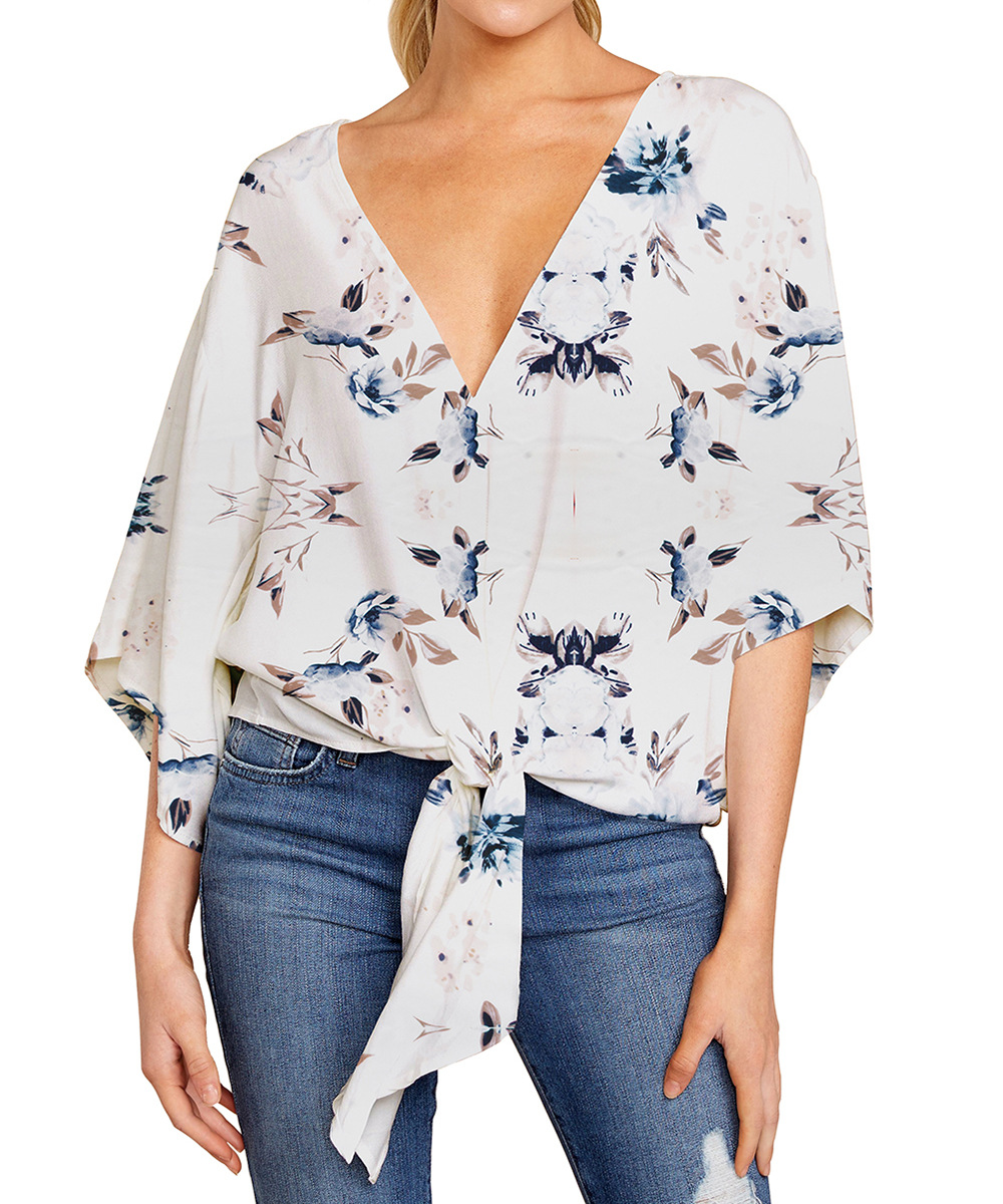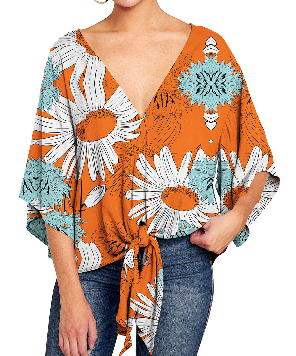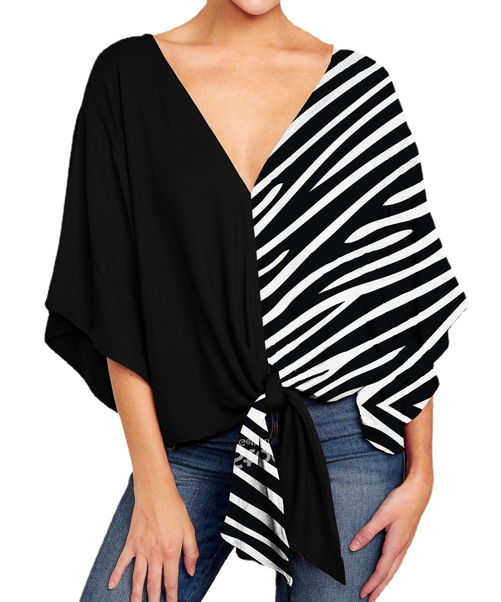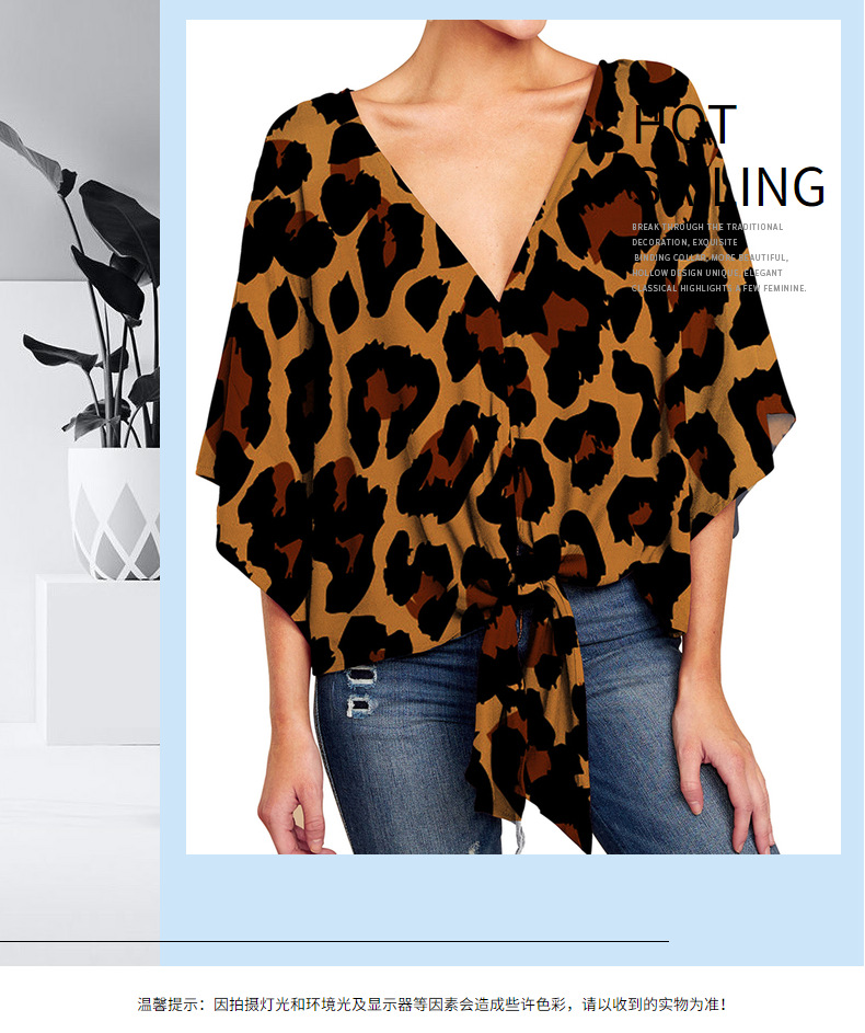 ebay亚马逊V领五分袖印花短款前面系带休闲百搭网红T恤