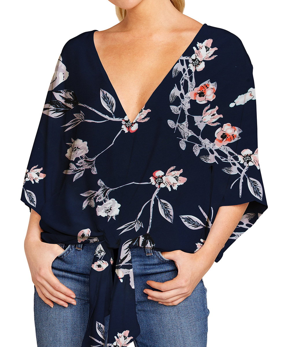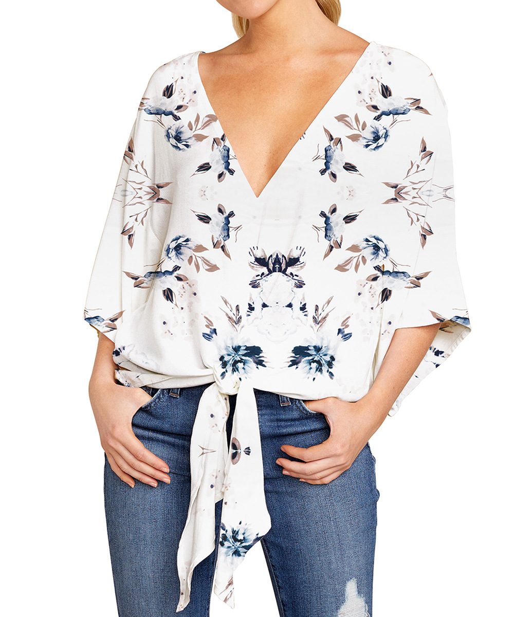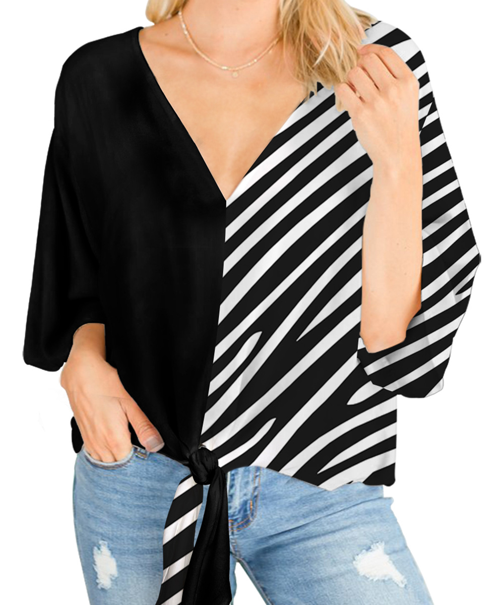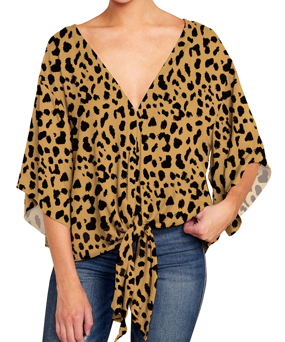 ebay亚马逊V领五分袖印花短款前面系带休闲百搭网红T恤
