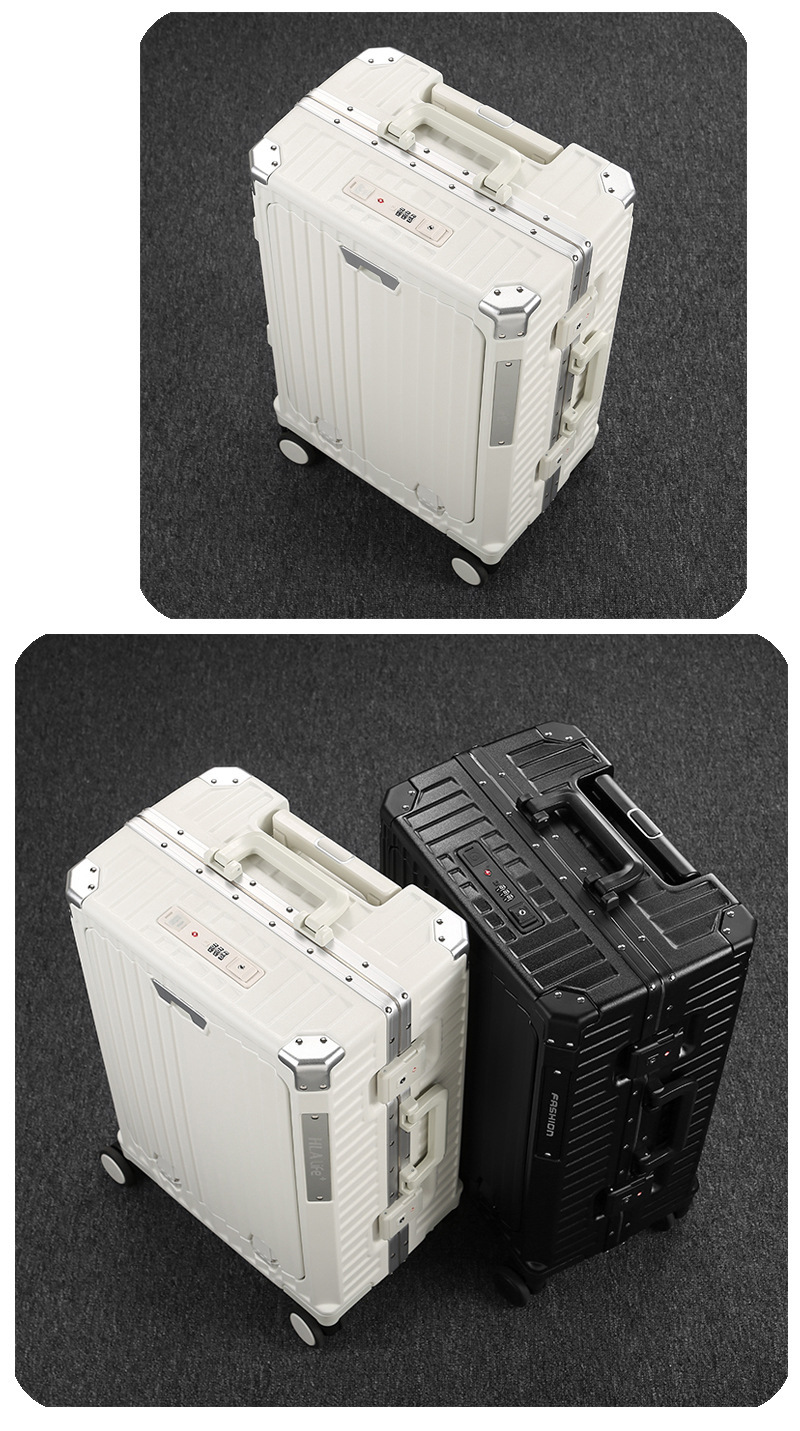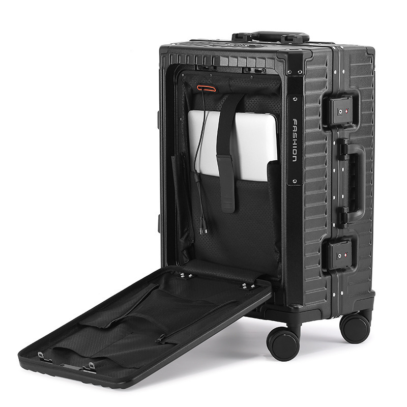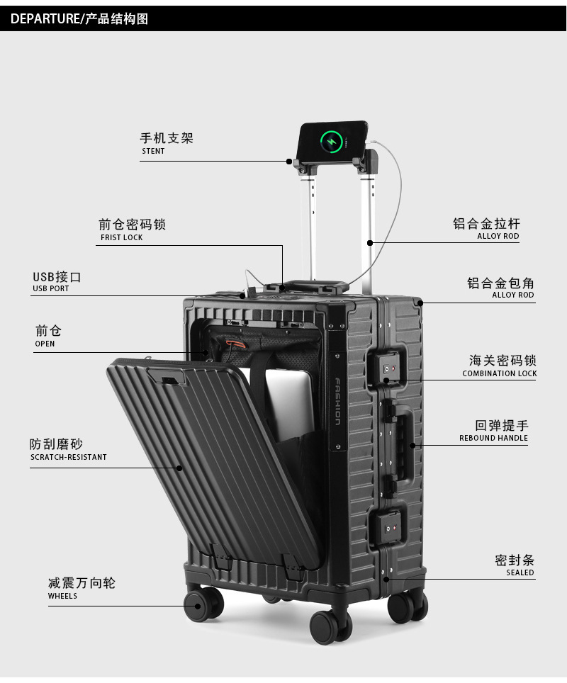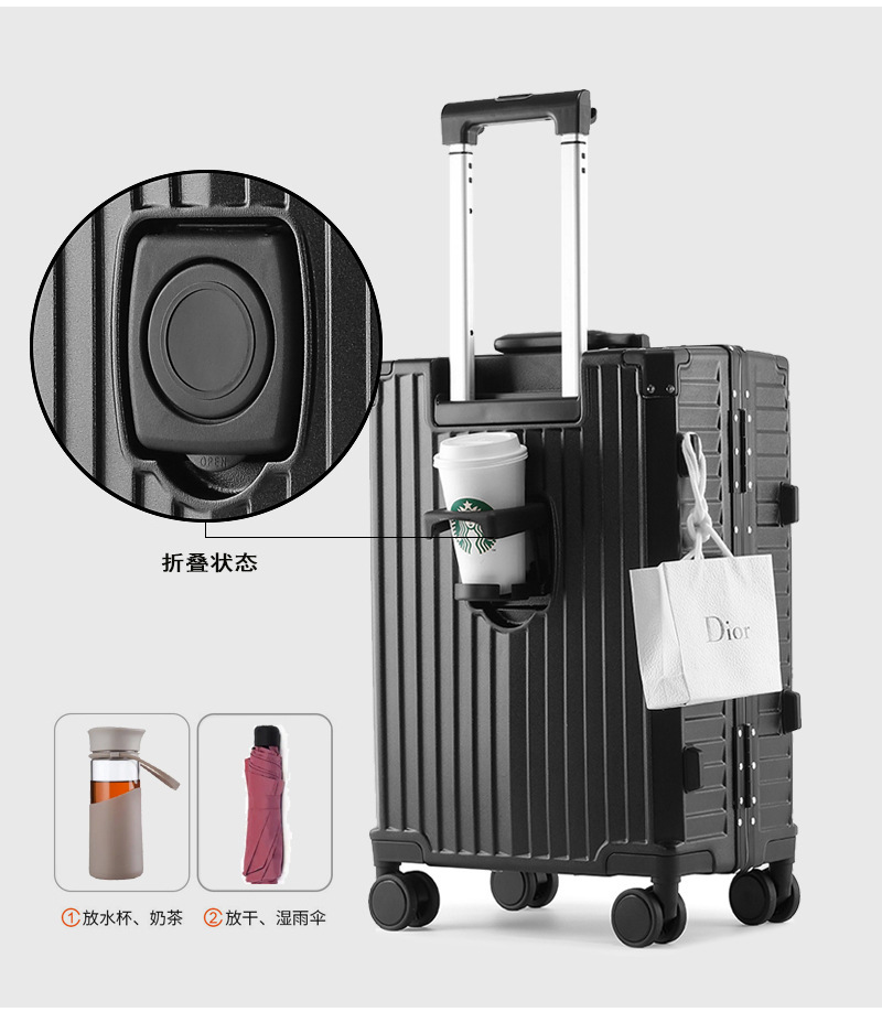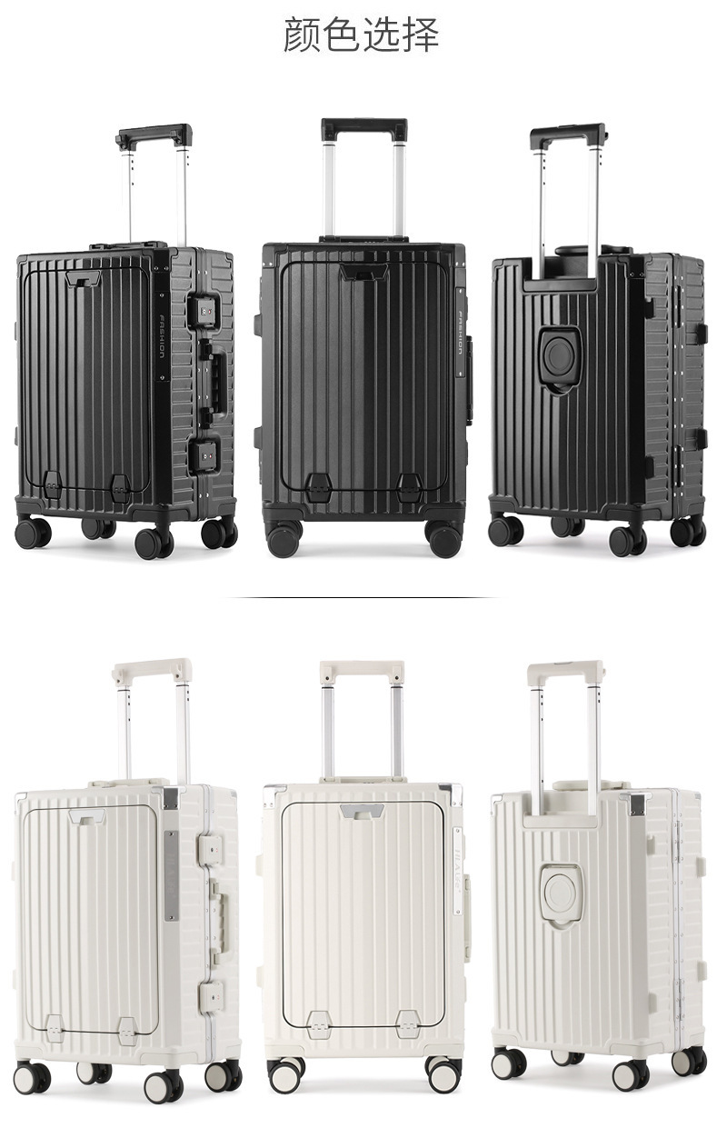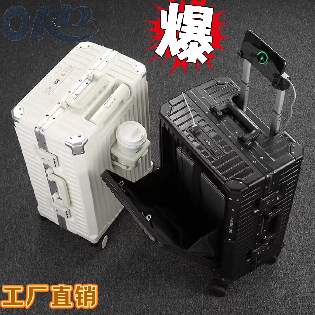 OKD铝框拉杆箱多功能前开盖旅行箱充电带杯架行李箱20寸登机箱
