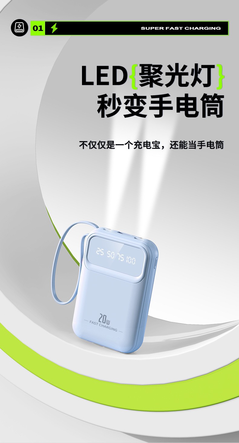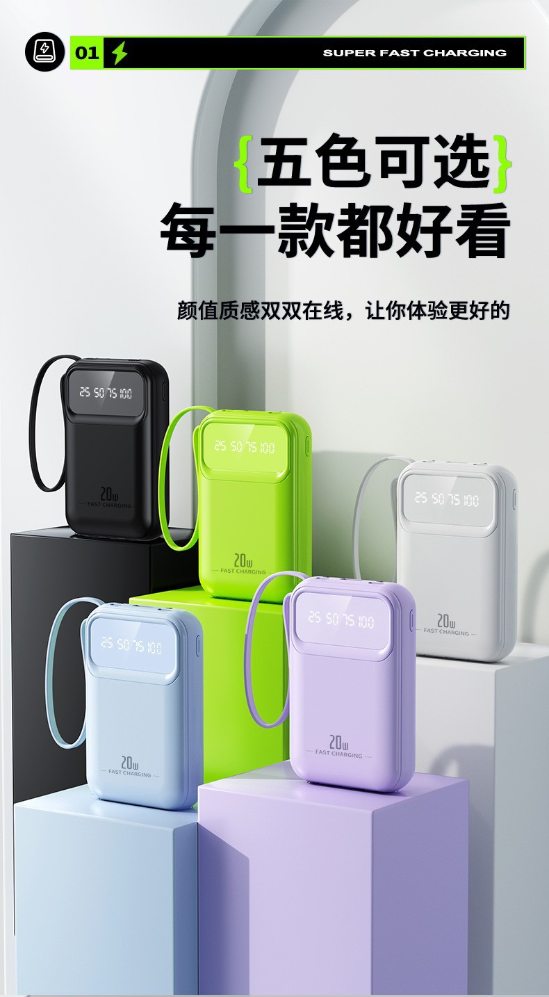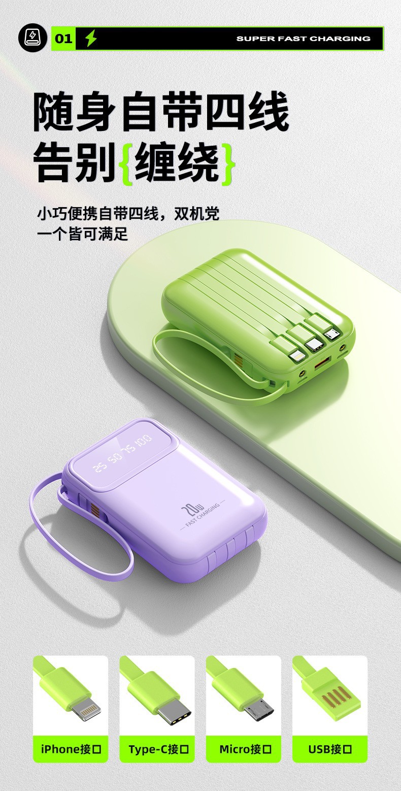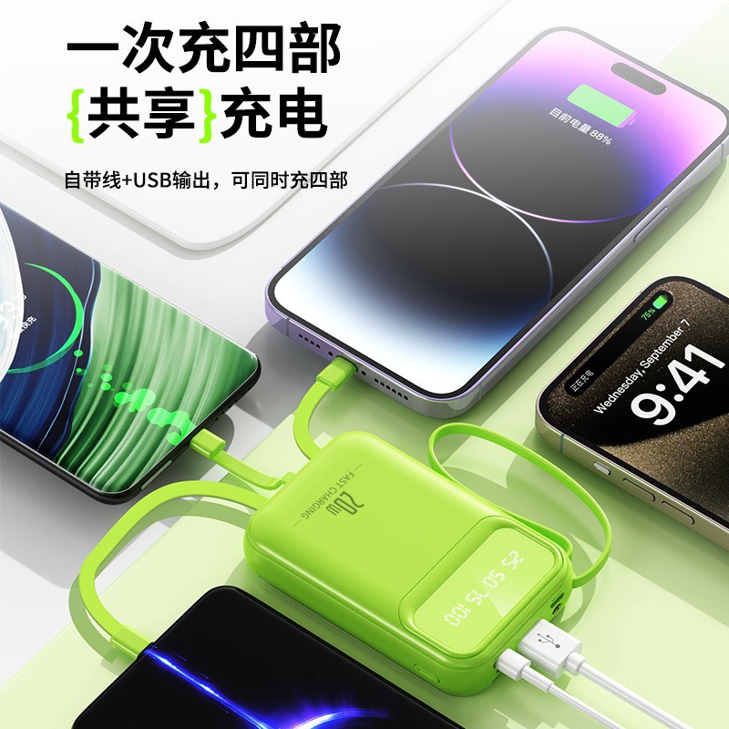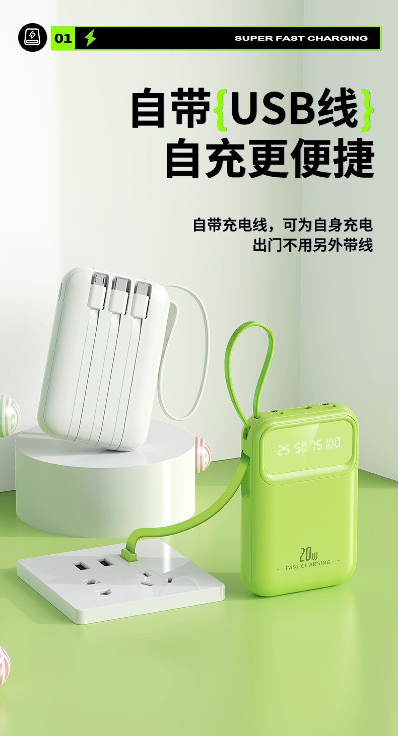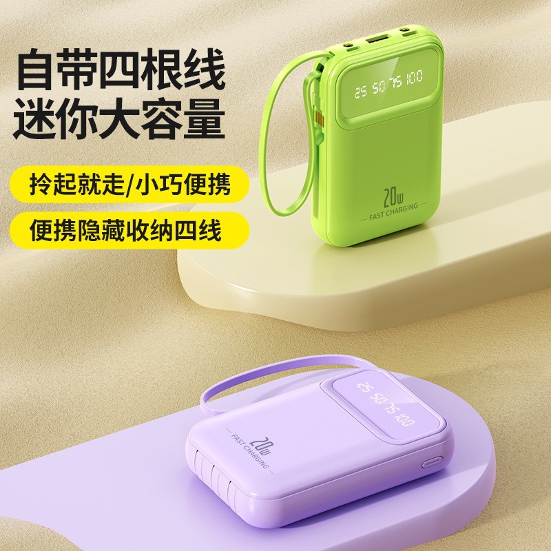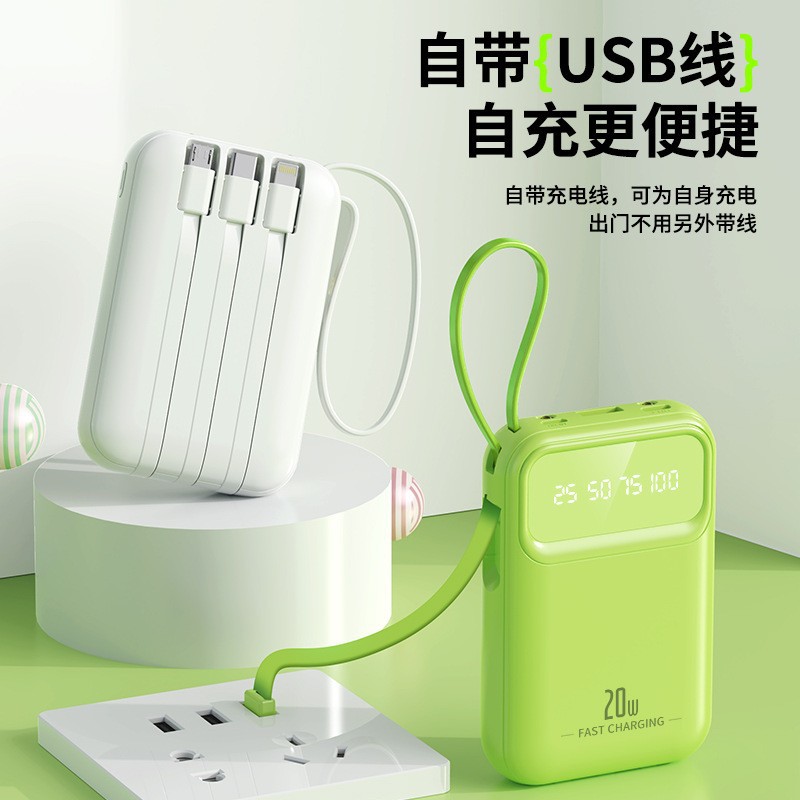 定制新品20000毫安大容量充电宝小巧便携自带线移动电源 LOGO礼品