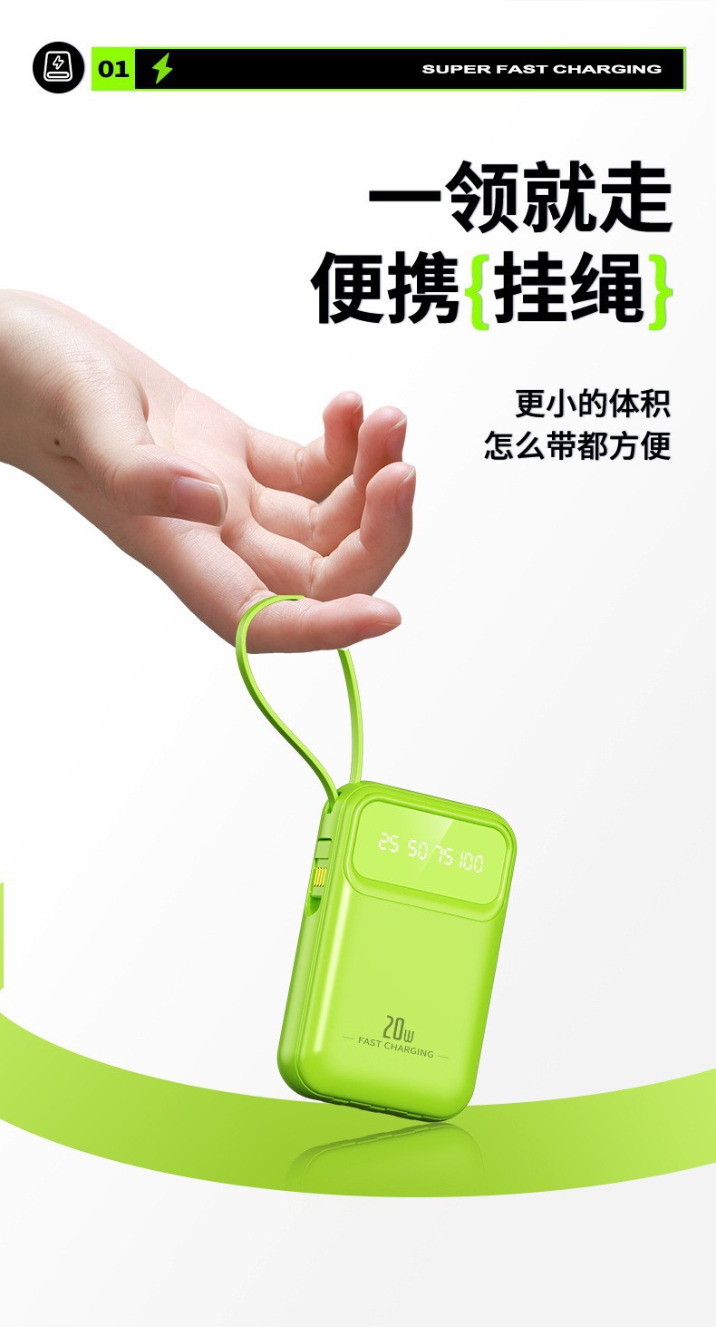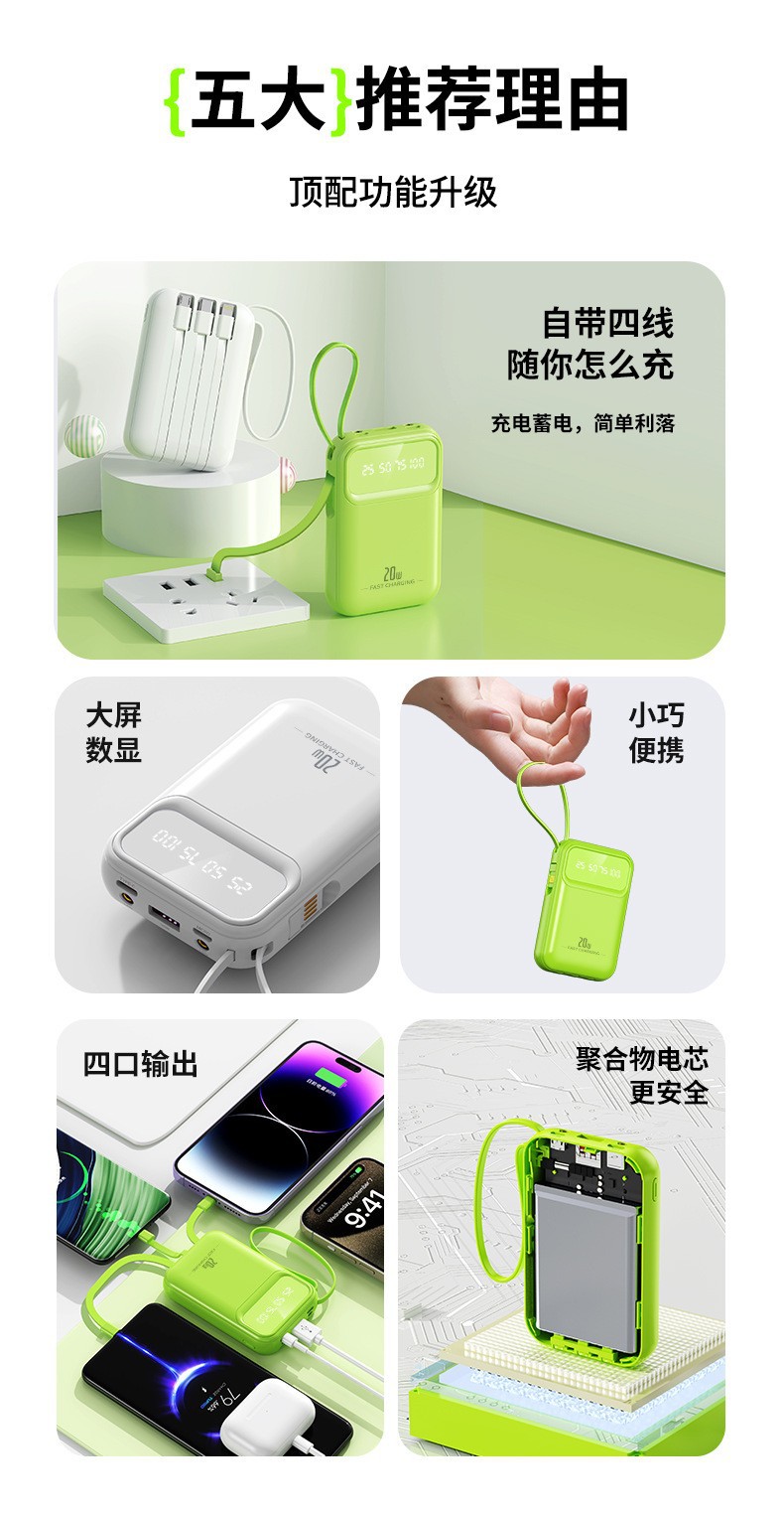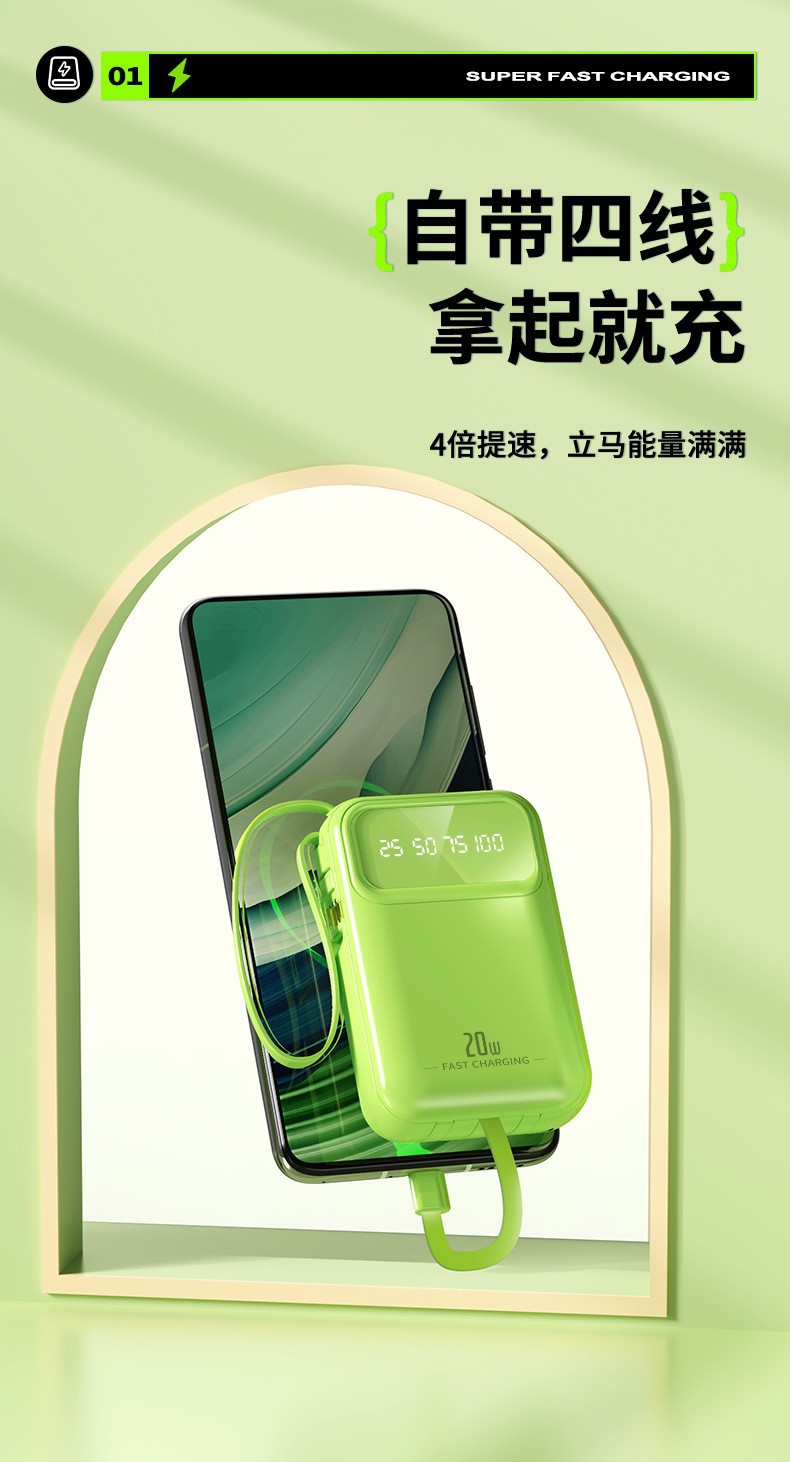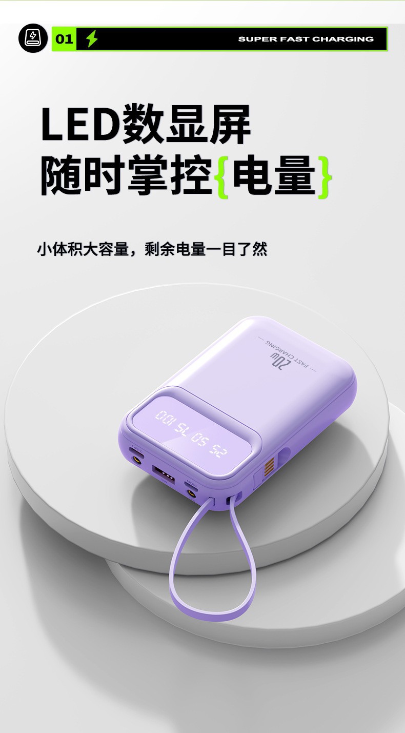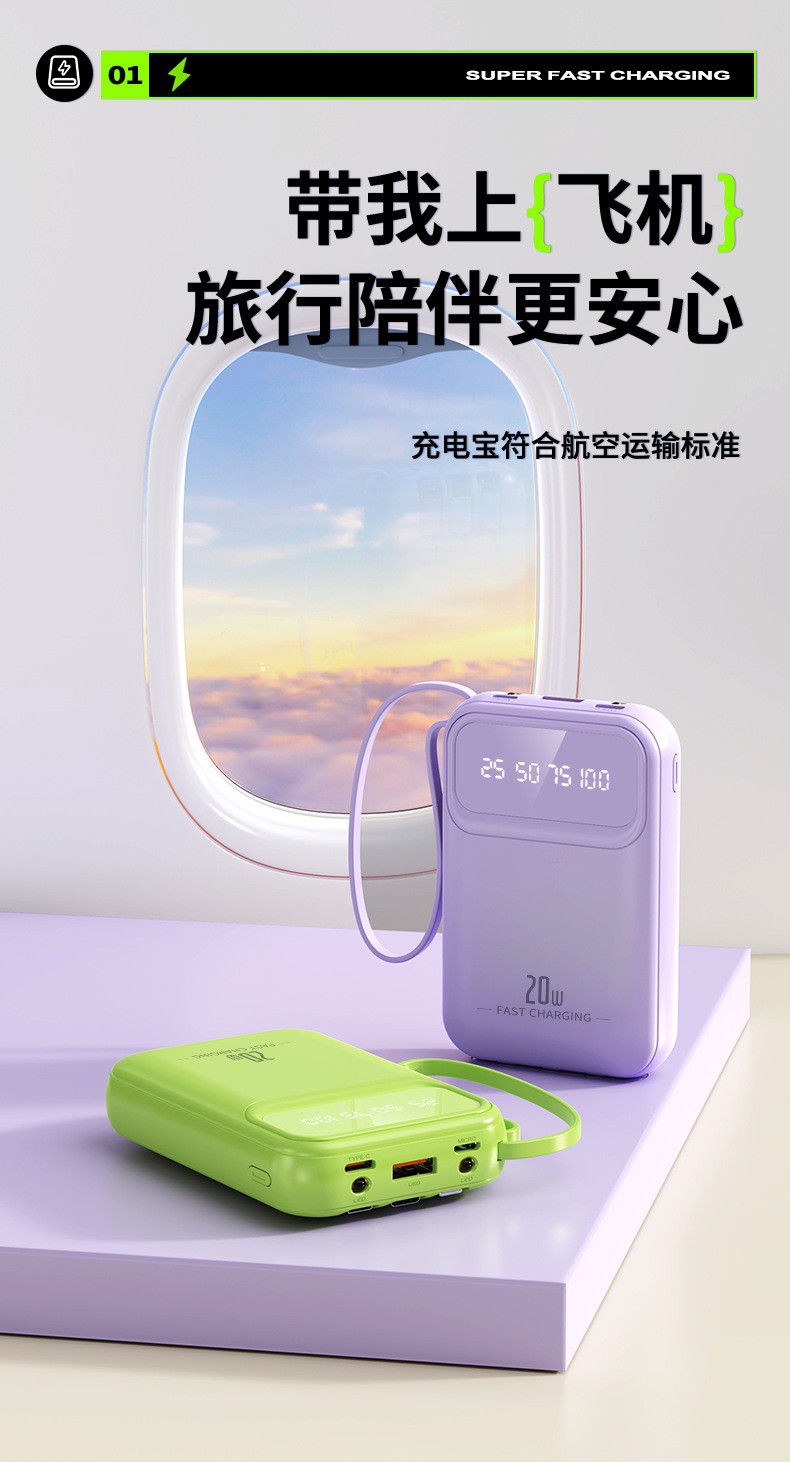 定制新品20000毫安大容量充电宝小巧便携自带线移动电源 LOGO礼品