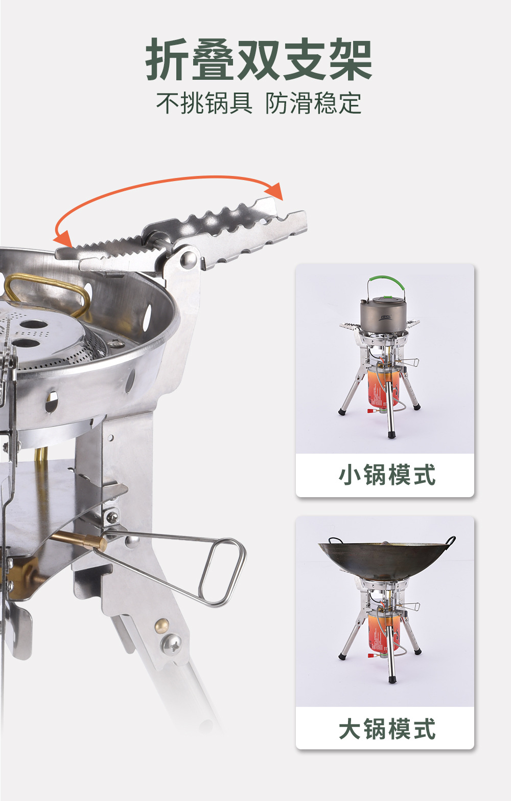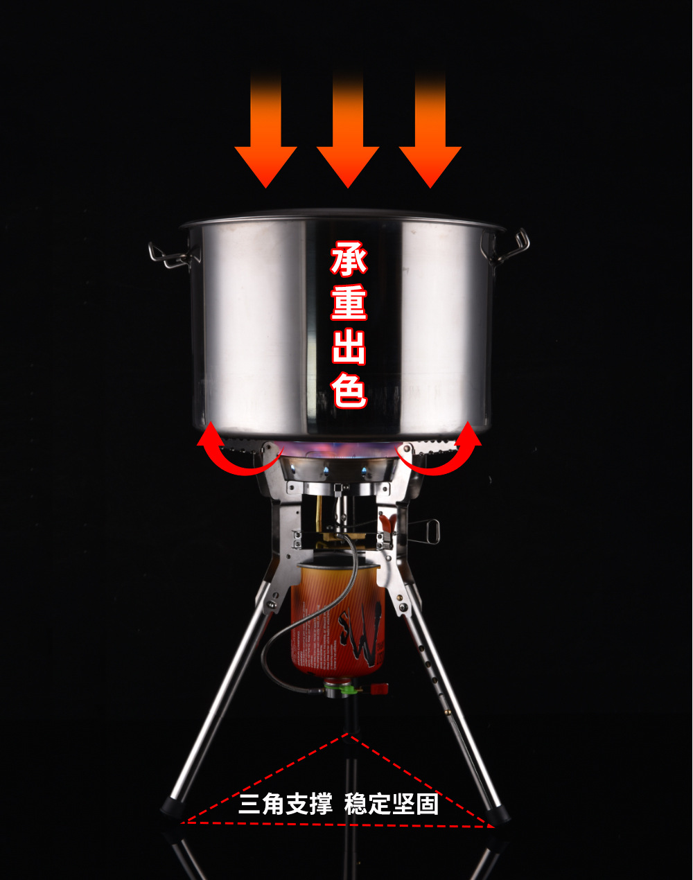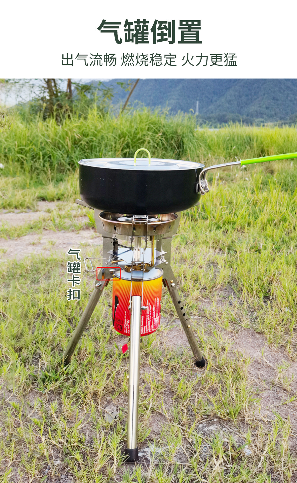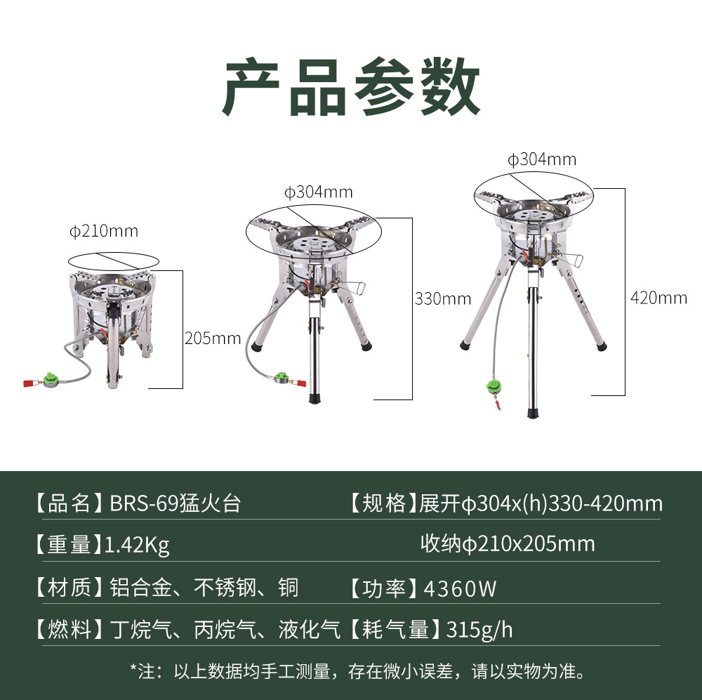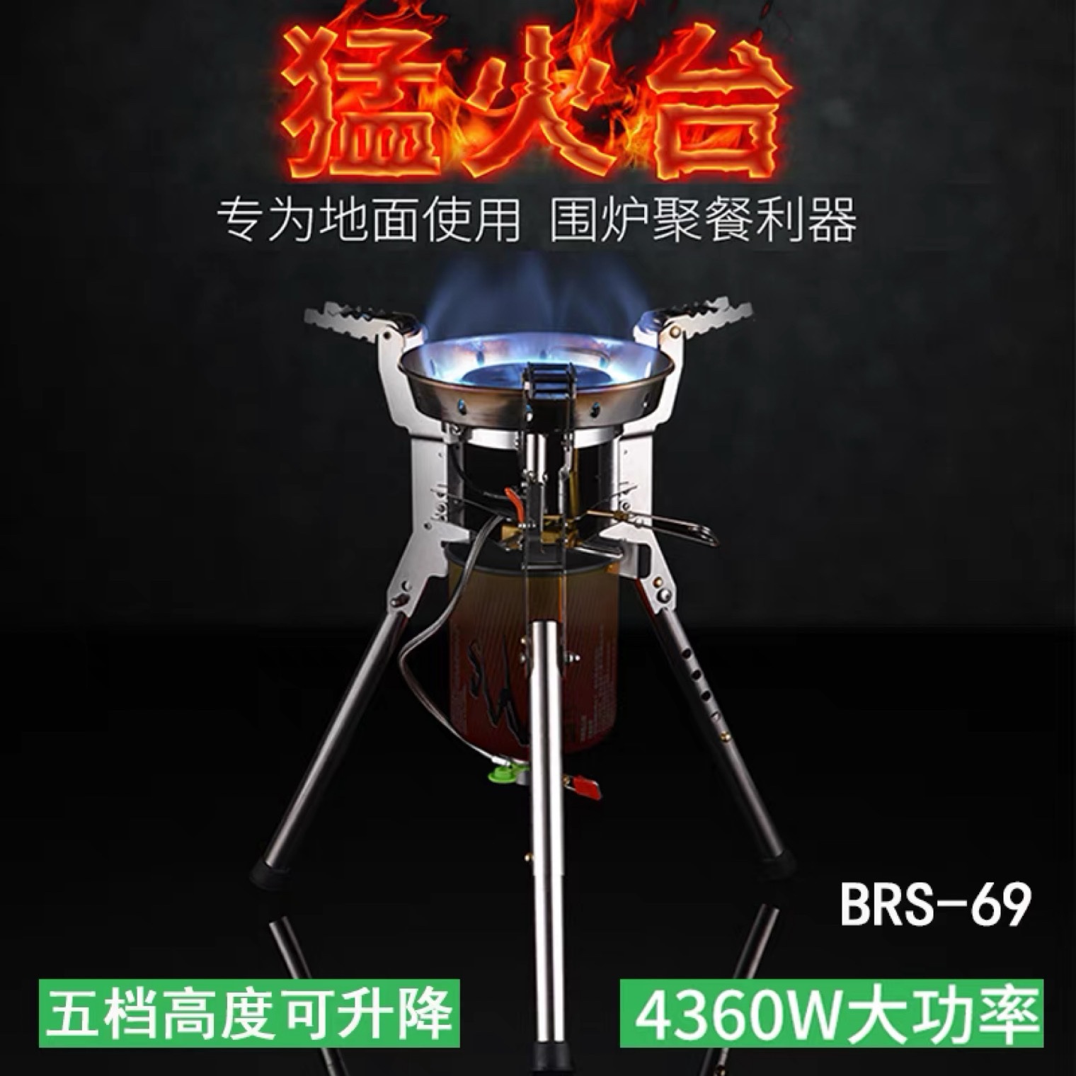 BRS-69 装箱数12个4360W,电子点火,带预热管,可升降高支架猛火炉,气罐可倒置,火力更猛,专为地面使用设计,可免带桌子。