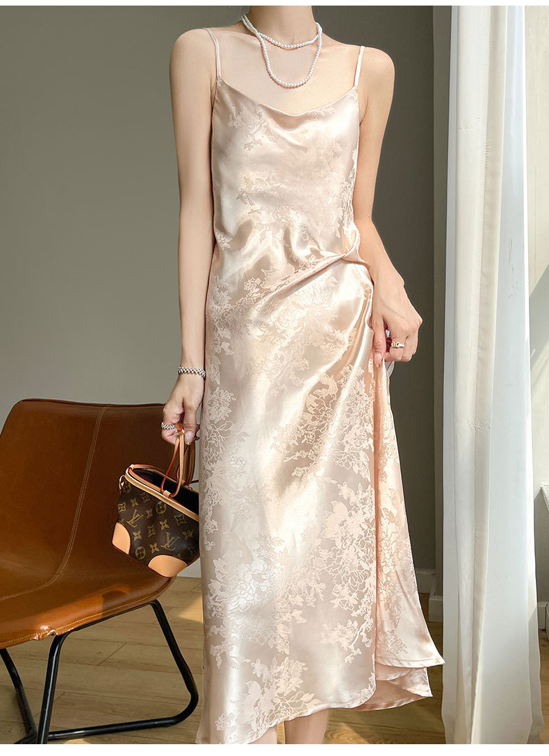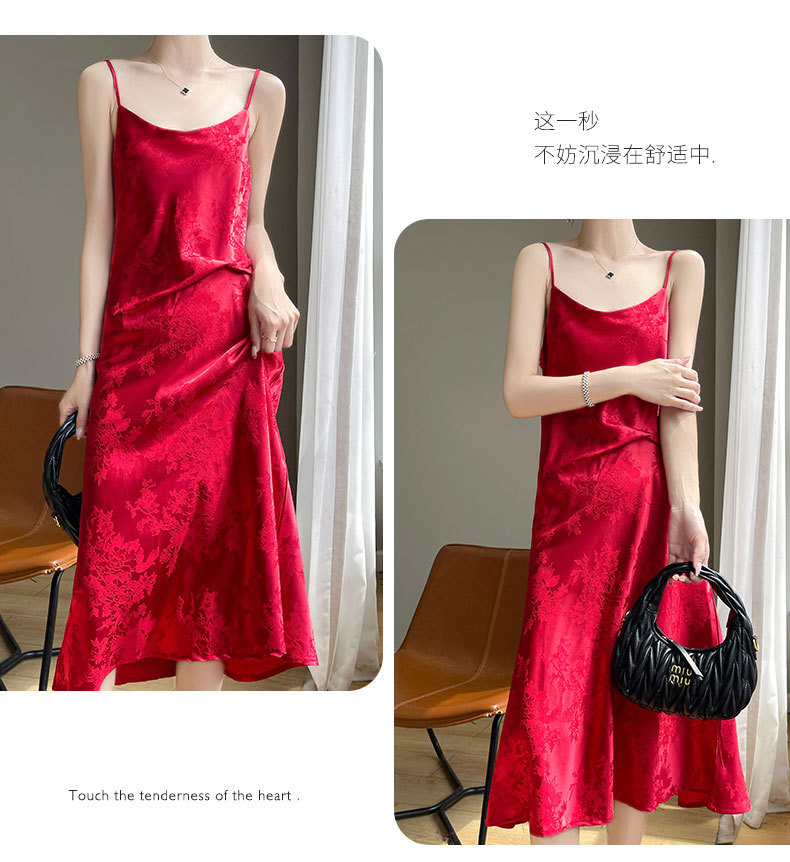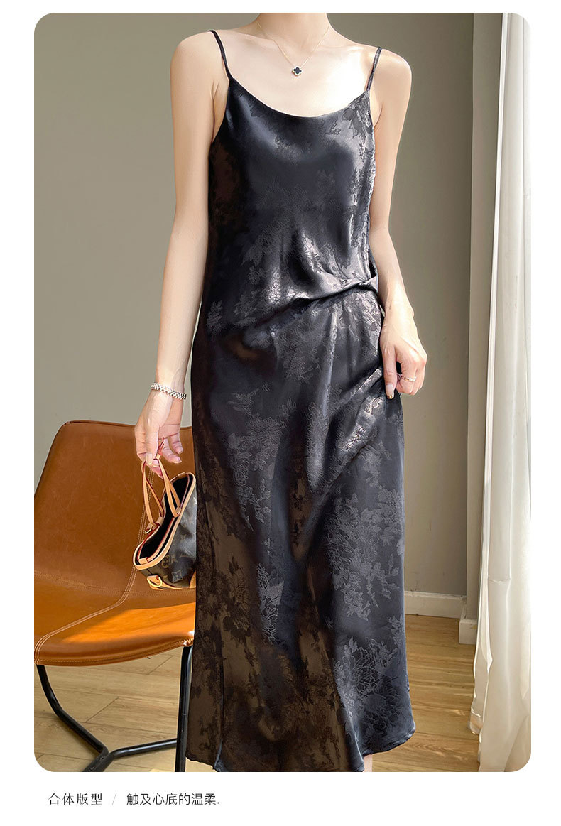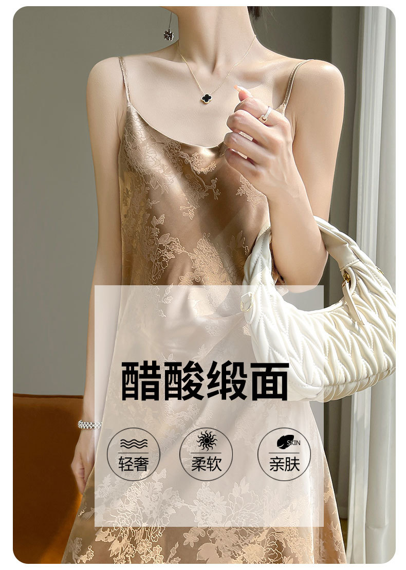 吊带连衣裙女夏季缎面内搭外穿一字领长裙背心裙子国风压花打底裙