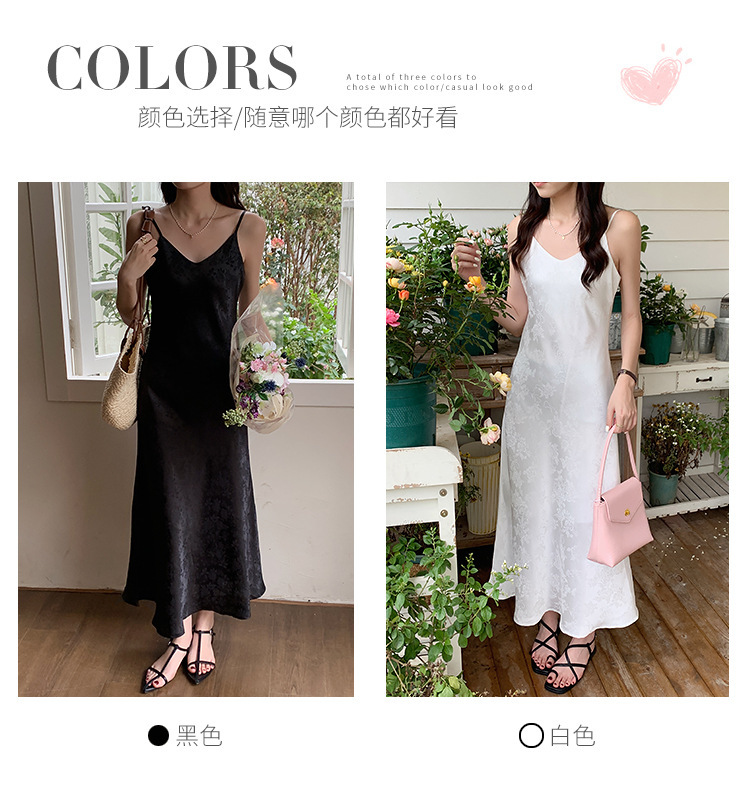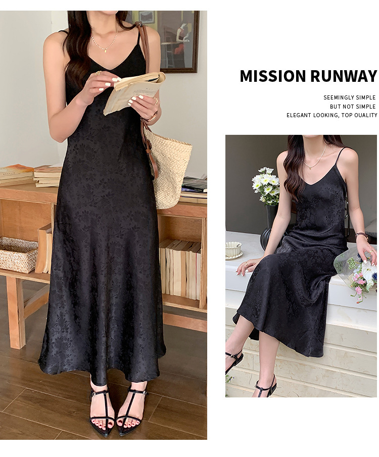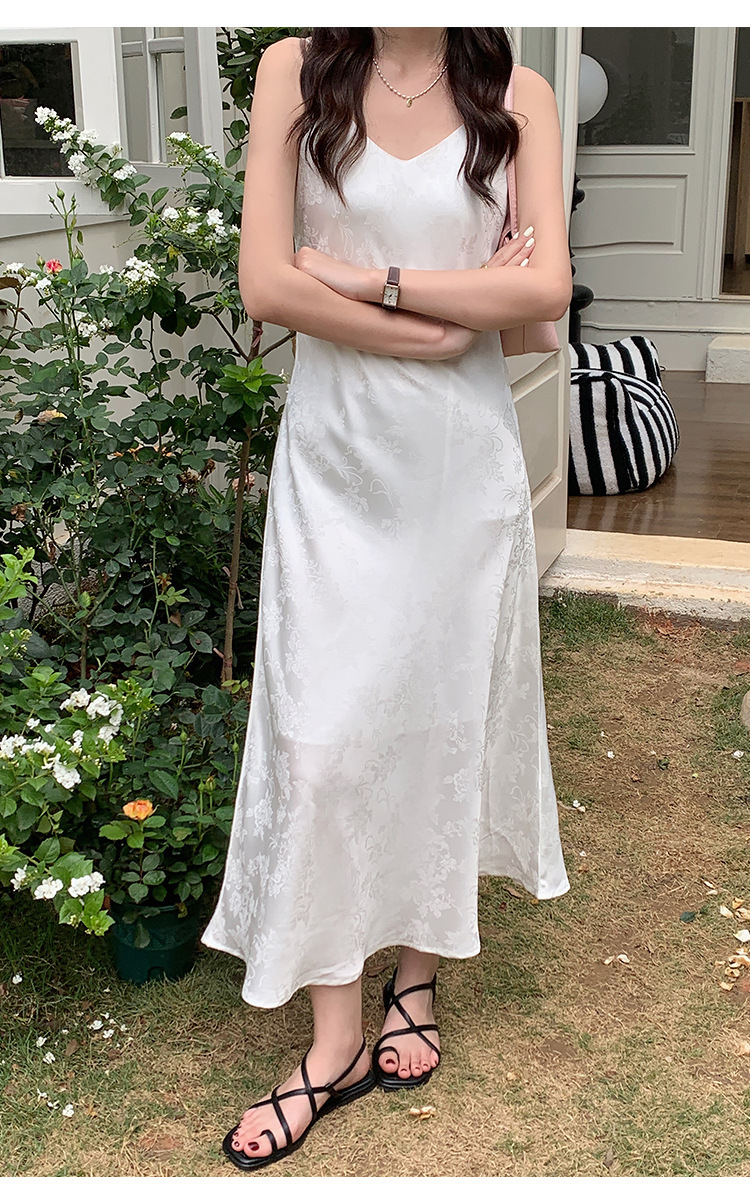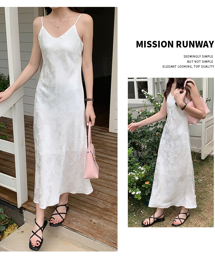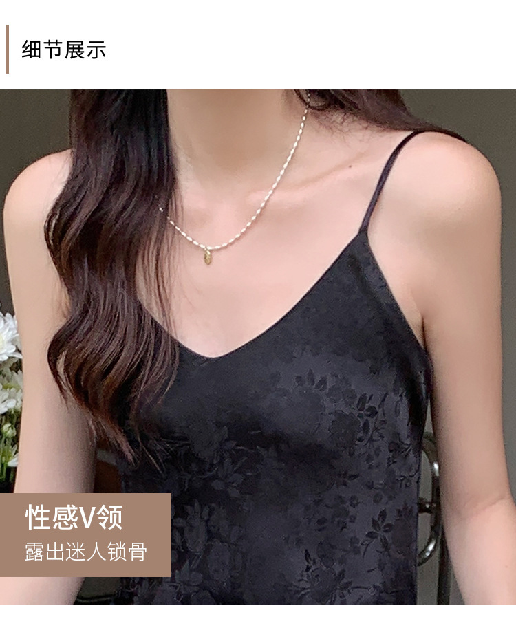 夏季长款吊带连衣裙女V领过膝内搭打底裙子提花气质收腰显瘦长裙