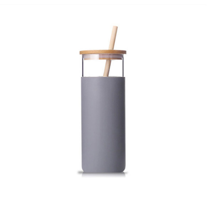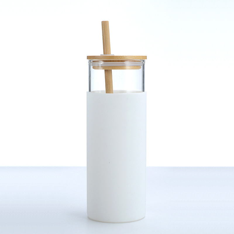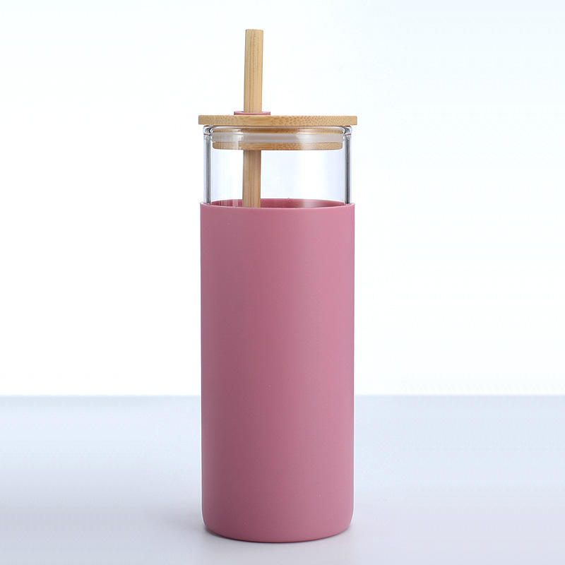 吸管单层竹盖玻璃杯高硼硅刻度大容量水杯子加厚硅胶套隔热冷饮杯