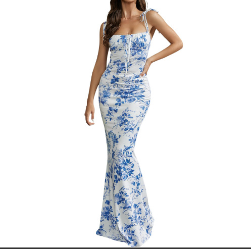 2024外贸Tiktok热卖夏季女装波西米亚无袖面条系带褶皱长款连衣裙