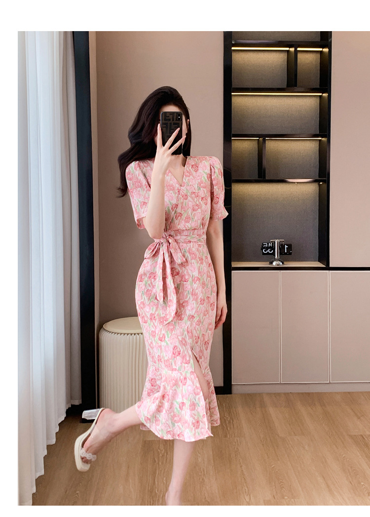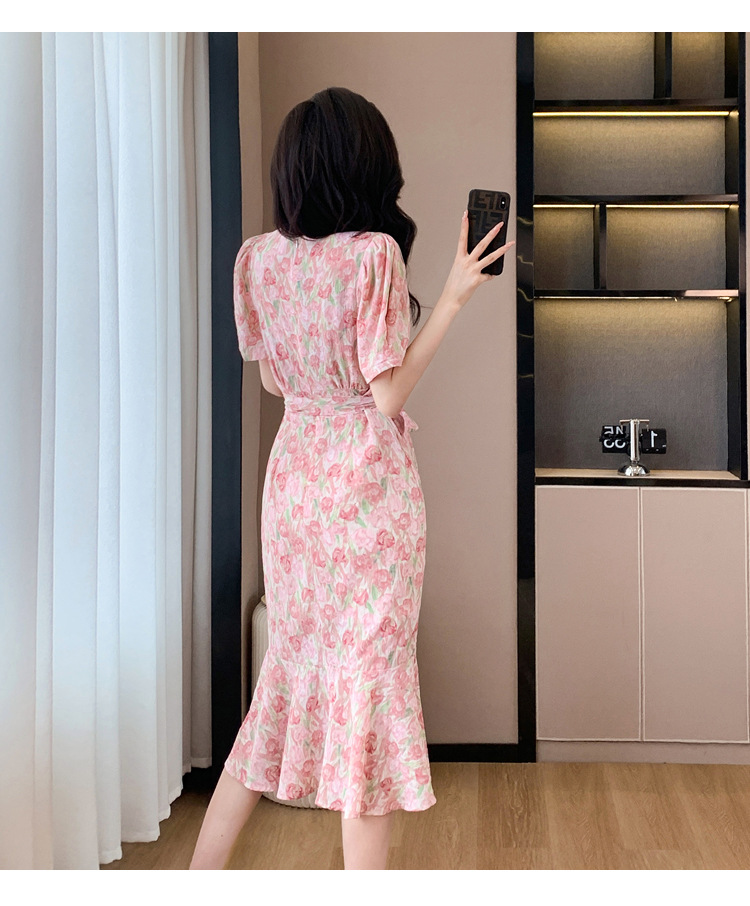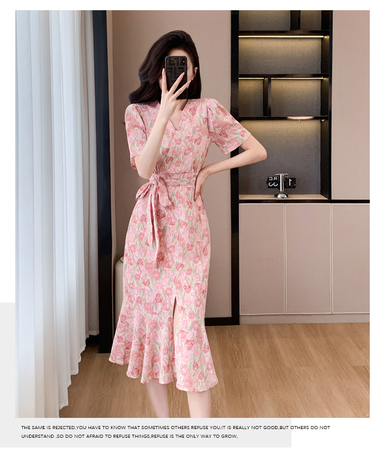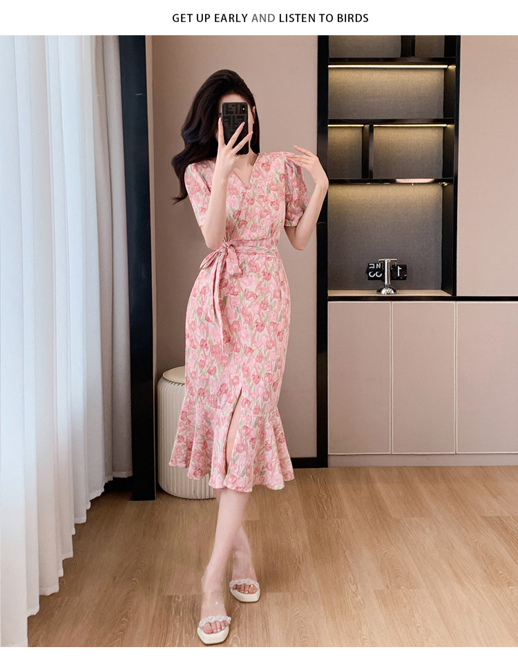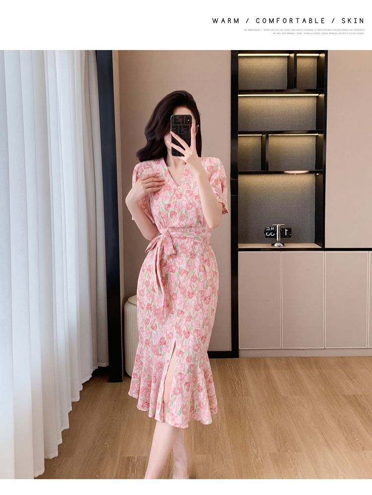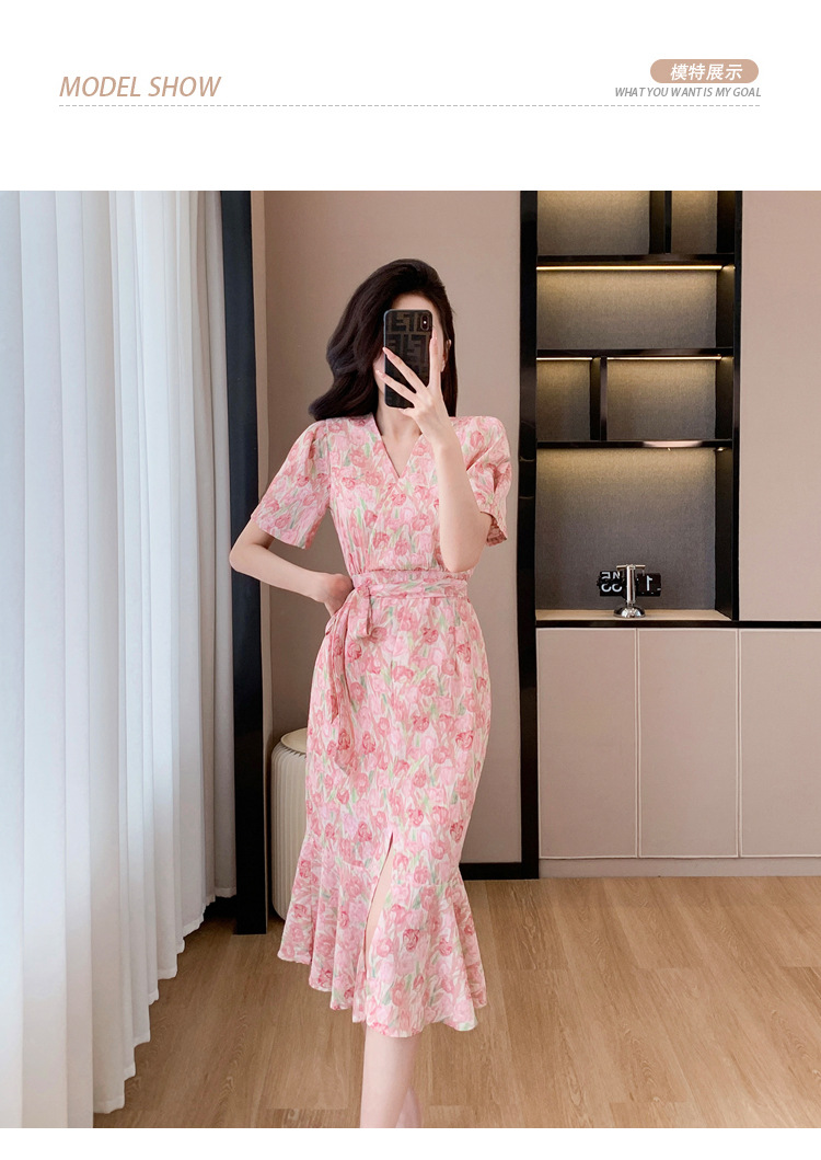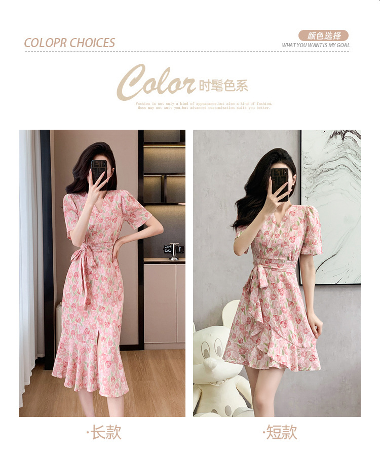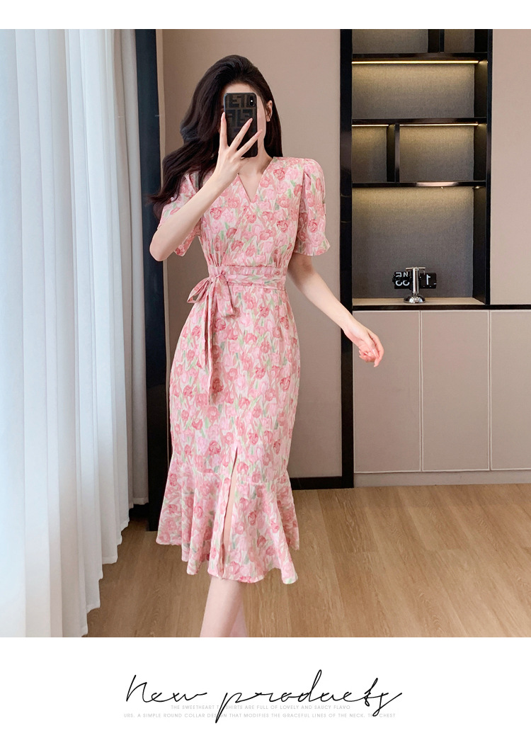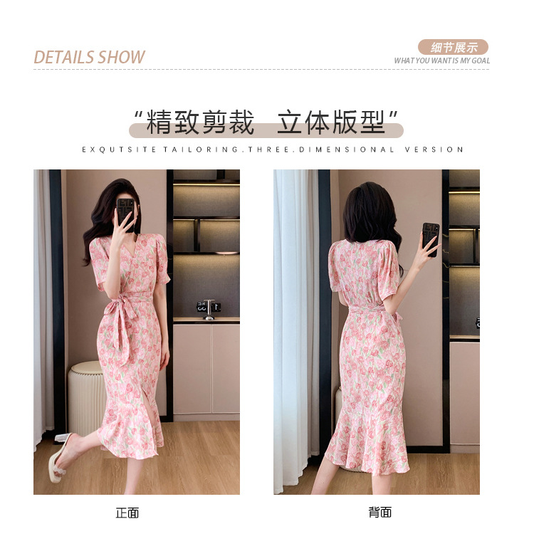 高端碎花不规则V领鱼尾裙女夏温柔气质名媛风优雅减龄雪纺连衣裙