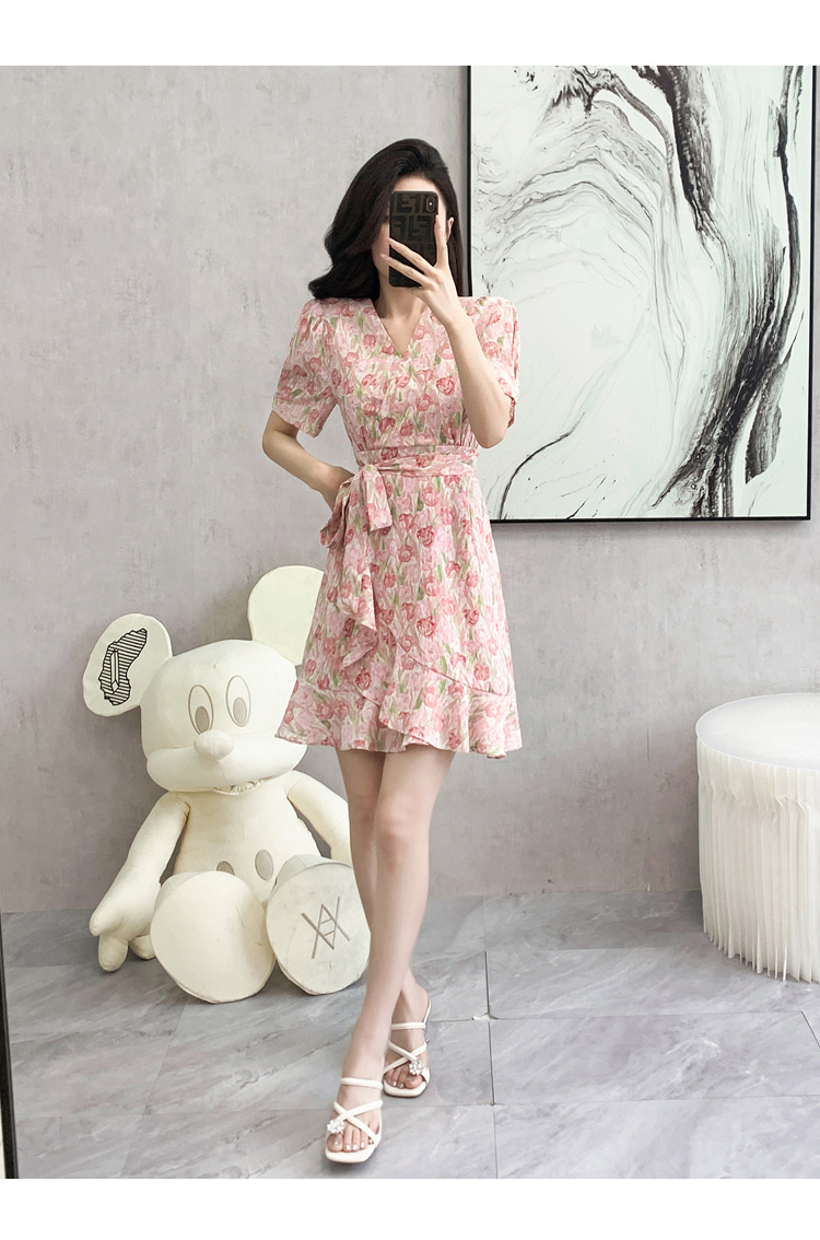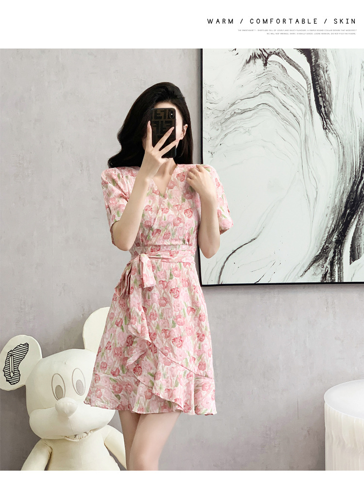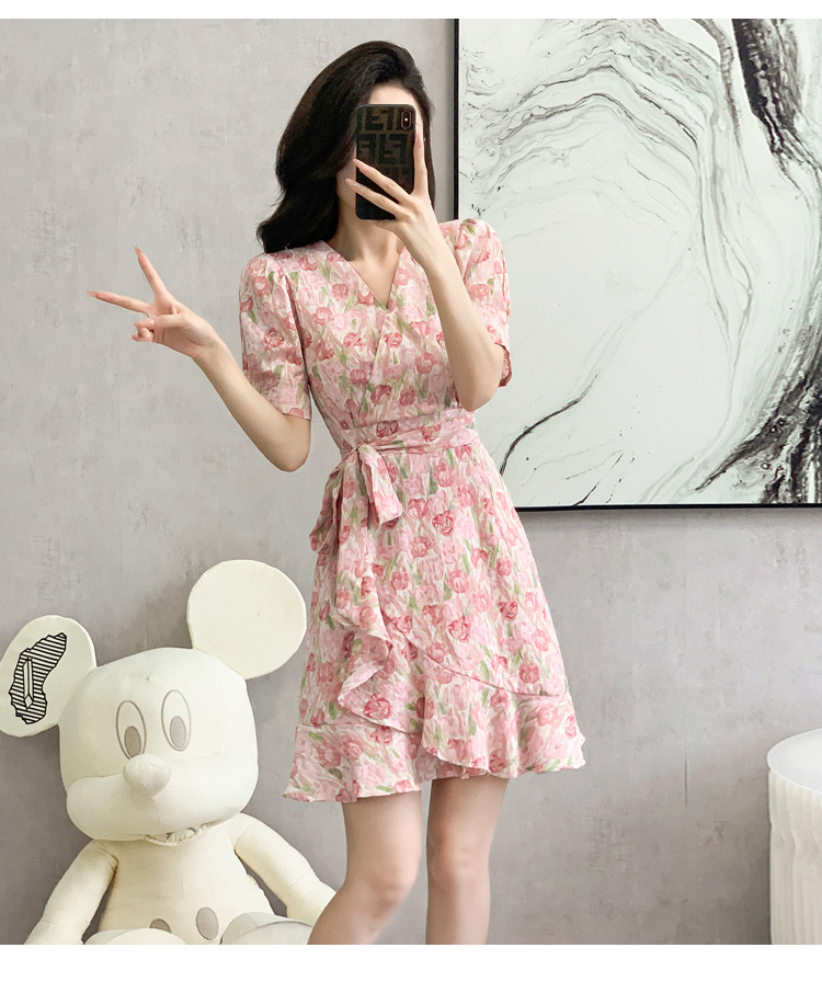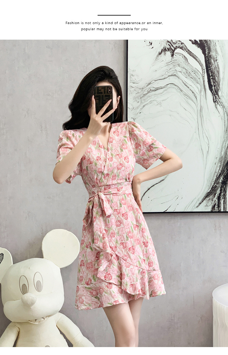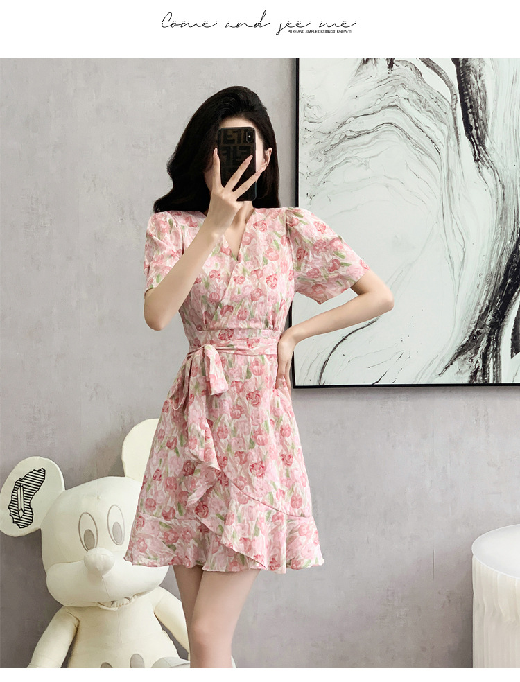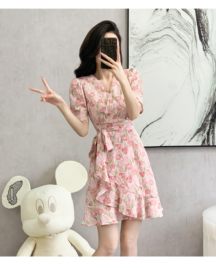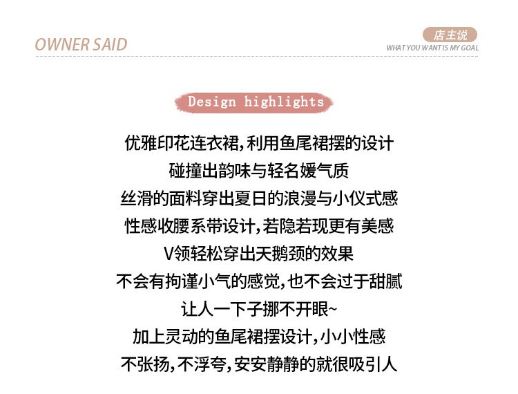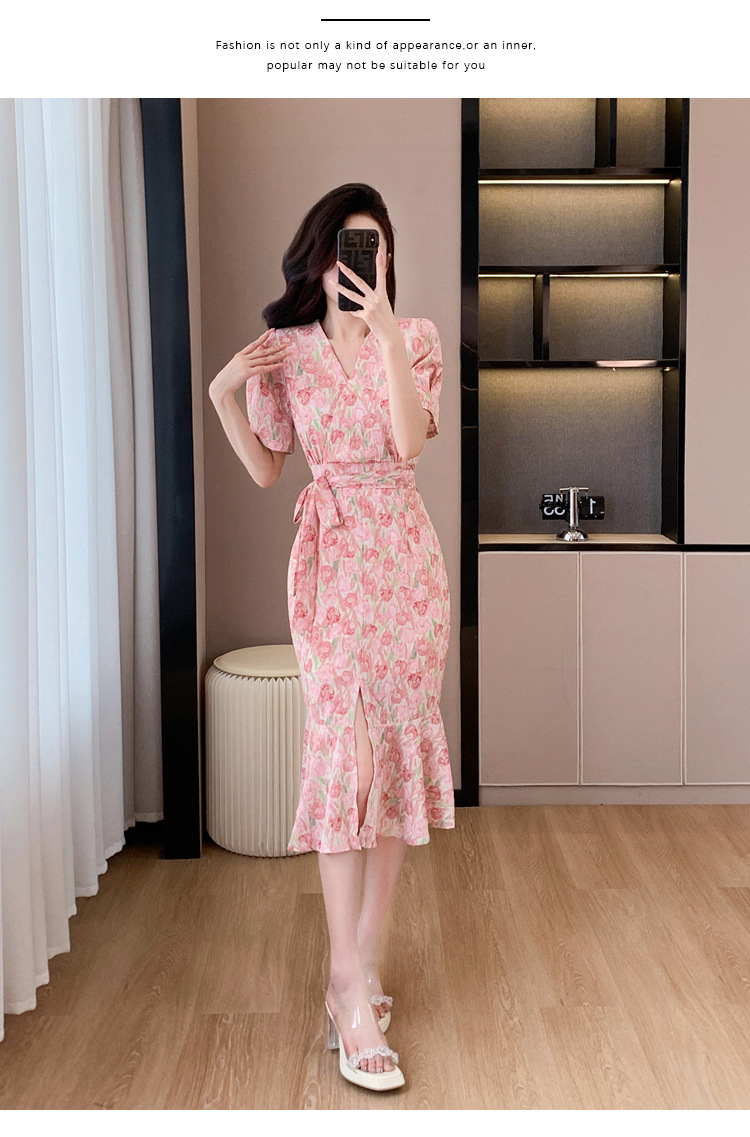 高端碎花不规则V领鱼尾裙女夏温柔气质名媛风优雅减龄雪纺连衣裙
