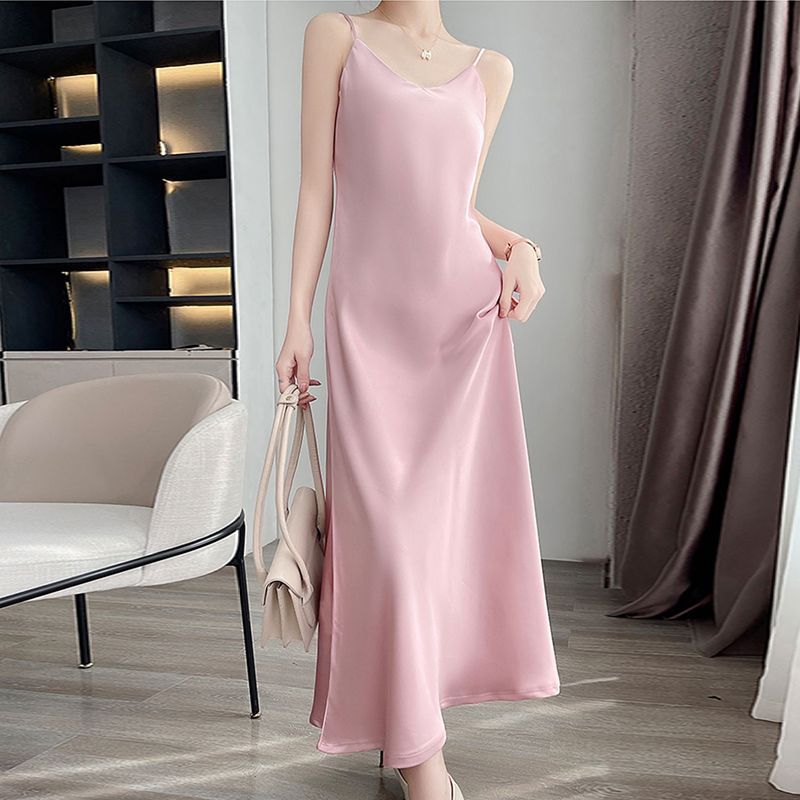 连衣裙新款气质过膝加长大码显瘦百搭缎面a字吊带纯色鱼尾长裙女