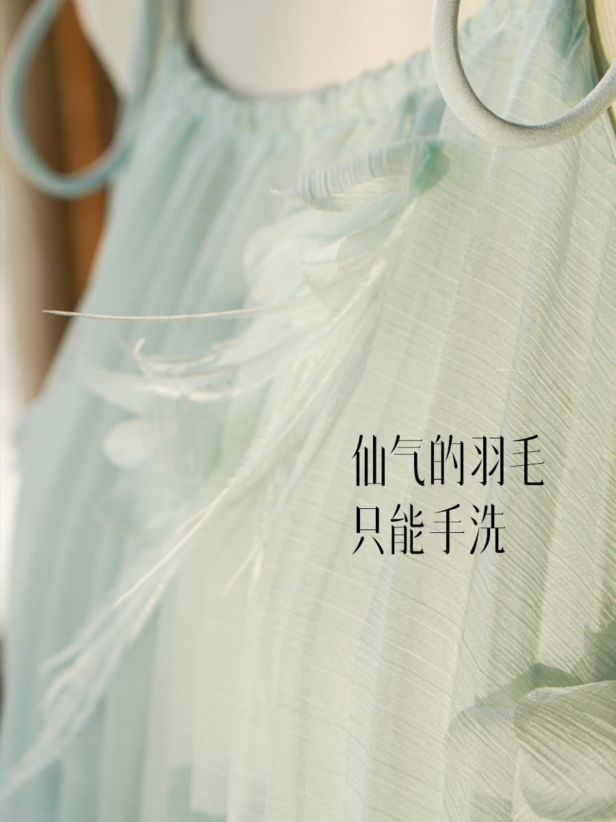 重工纯手工羽毛立体装饰渡假仙女吊带长裙婚礼晨拍宽松压折连衣裙