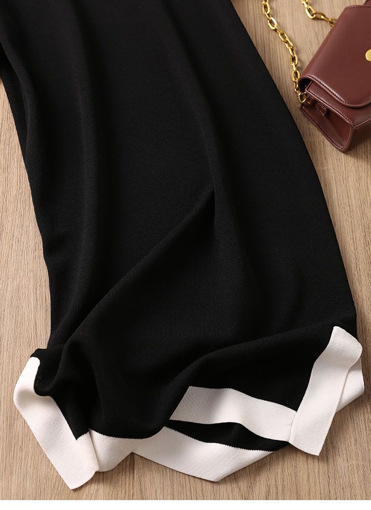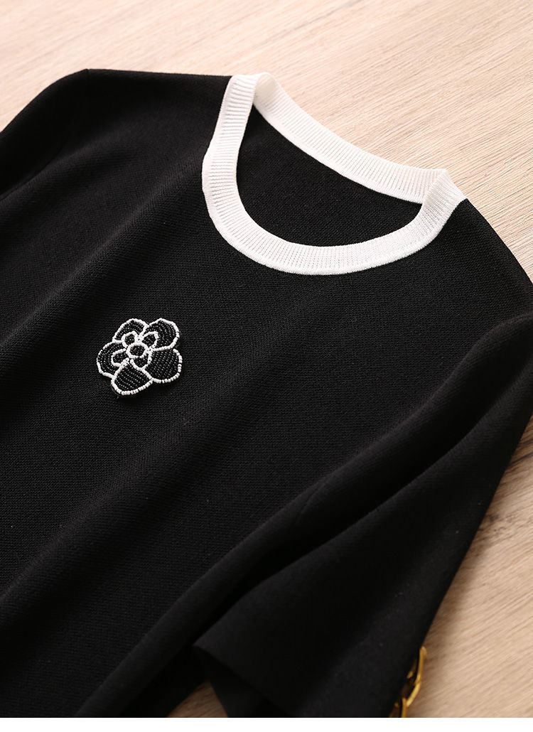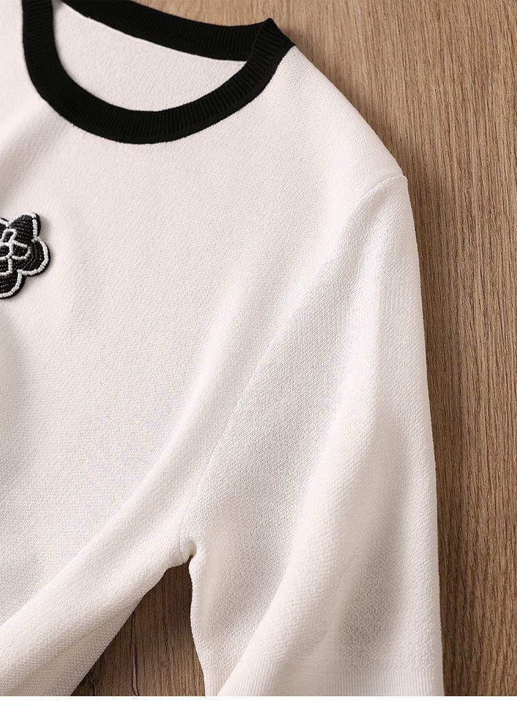 2024夏赫本风山茶花钉珠开叉冰丝针织短袖连衣裙女气质修身包臀裙