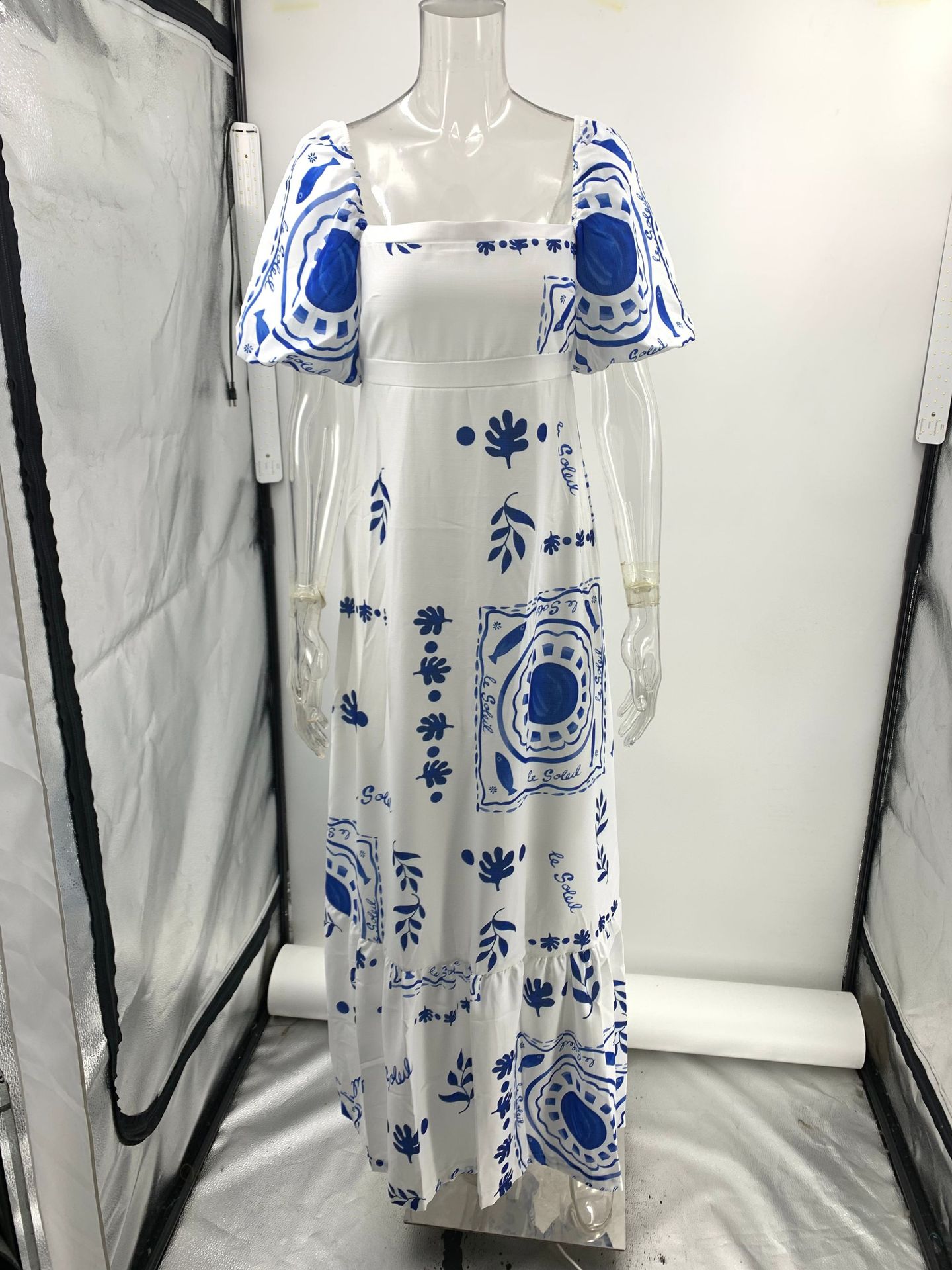 跨境独立站2024新款欧美休闲一字领印花灯笼袖修身大摆棉麻连衣裙