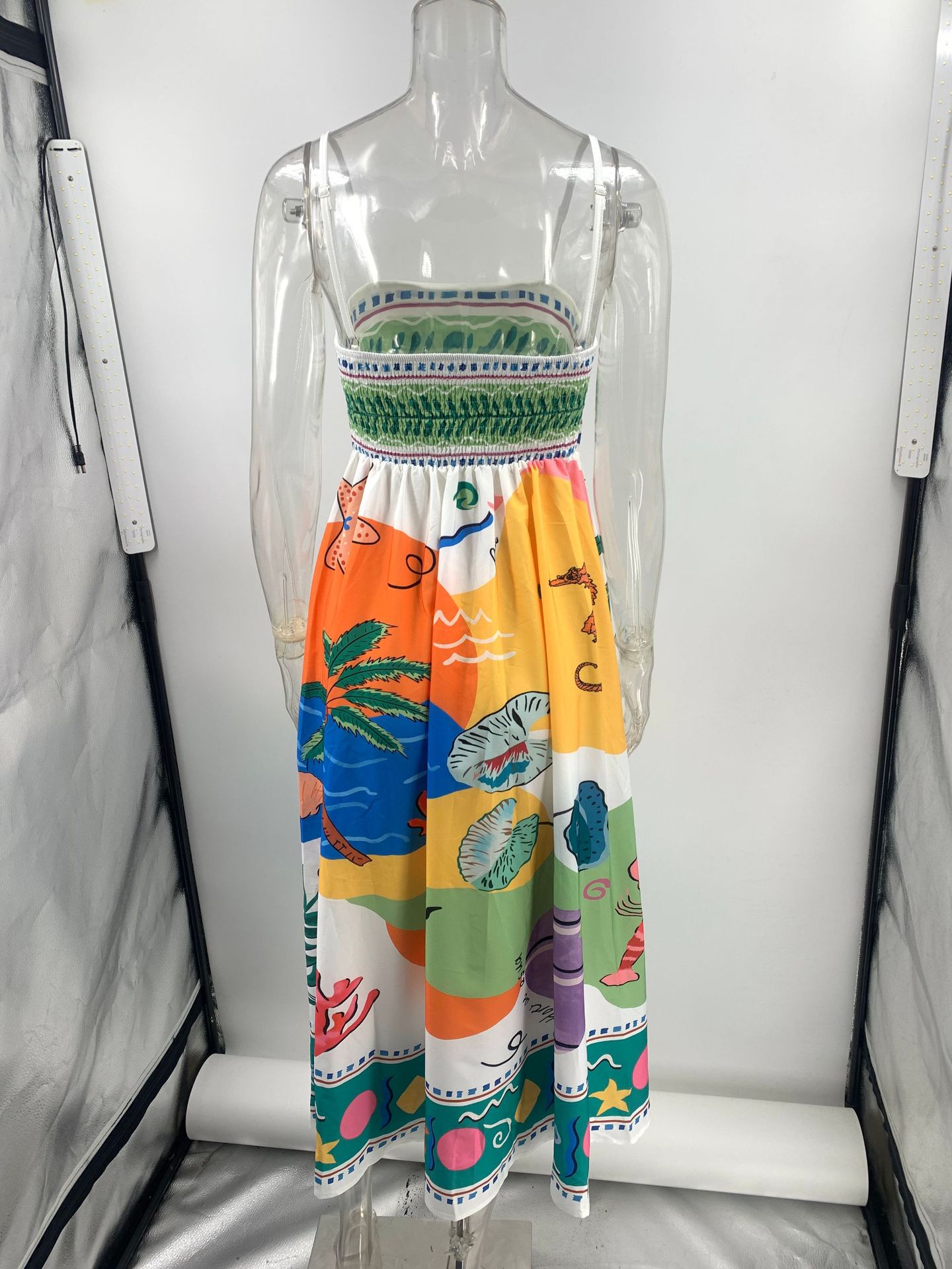 跨境亚马逊新款欧美2024夏季女装性感定位印花吊带无袖大摆连衣裙
