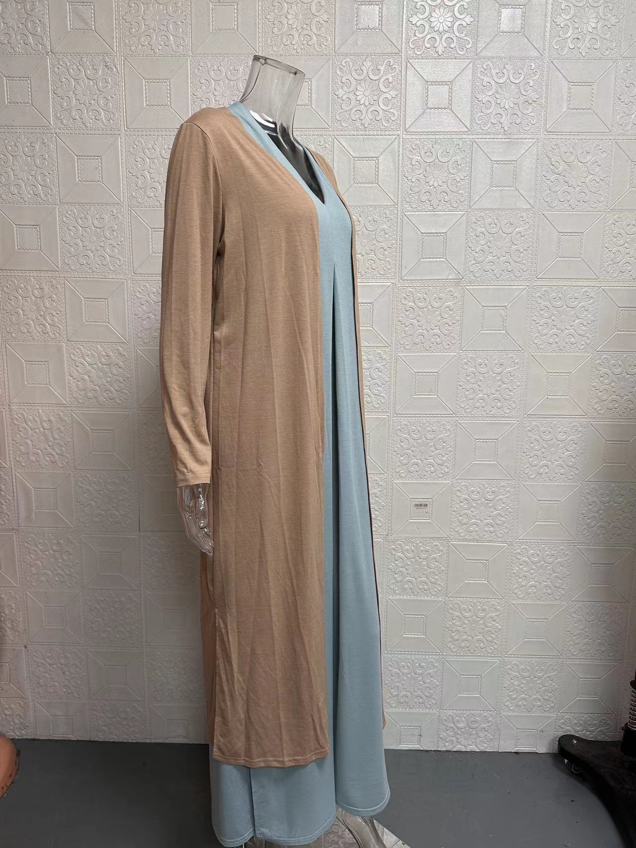 跨境亚马逊独立站欧美 2024新款纯色套头V领连衣裙开衫外套套装女