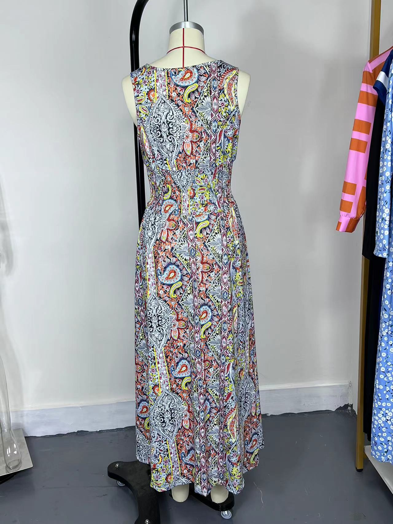 2024新款跨境欧美女装亚马逊独立站速卖通印花v领时尚高腰连衣裙