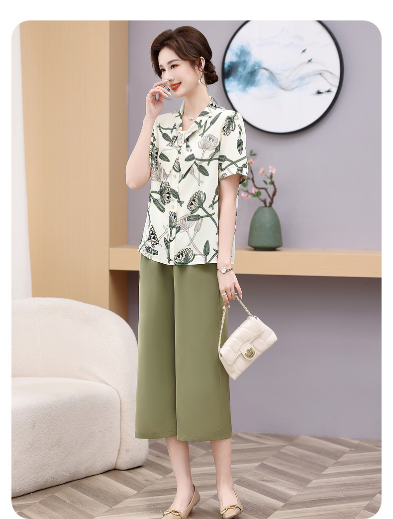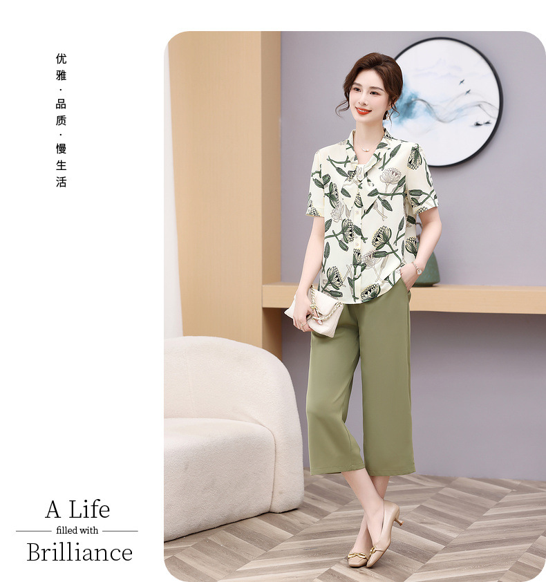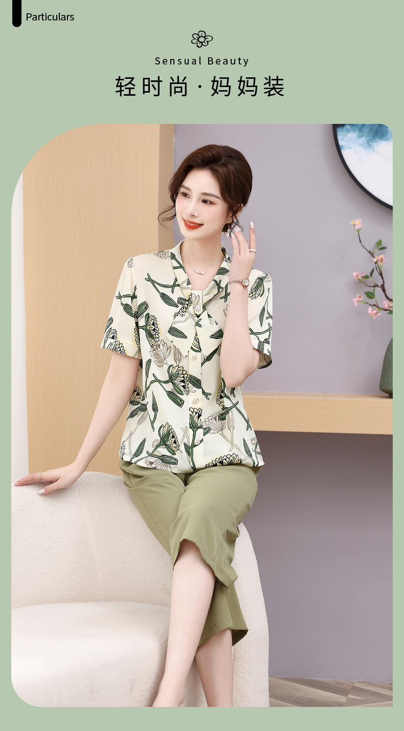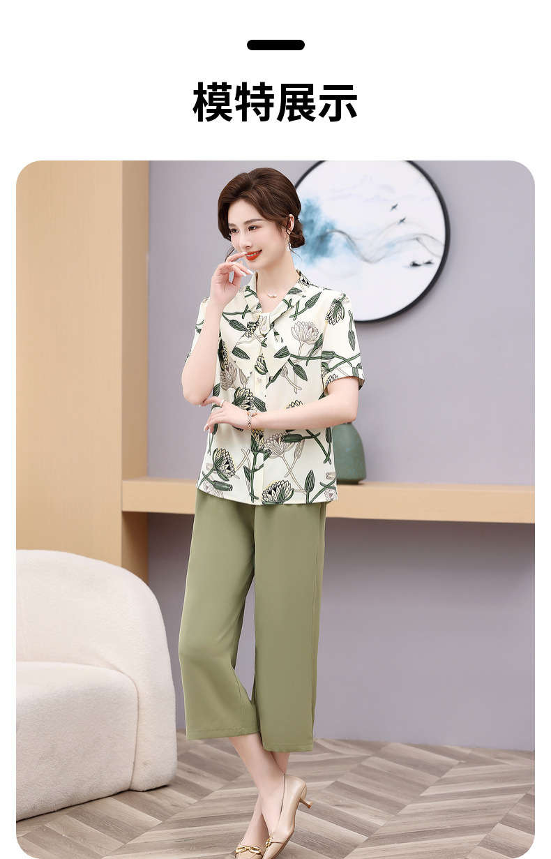 年轻妈妈装套装短袖印花t恤小衫上衣2024新款中老年女装夏季衣服