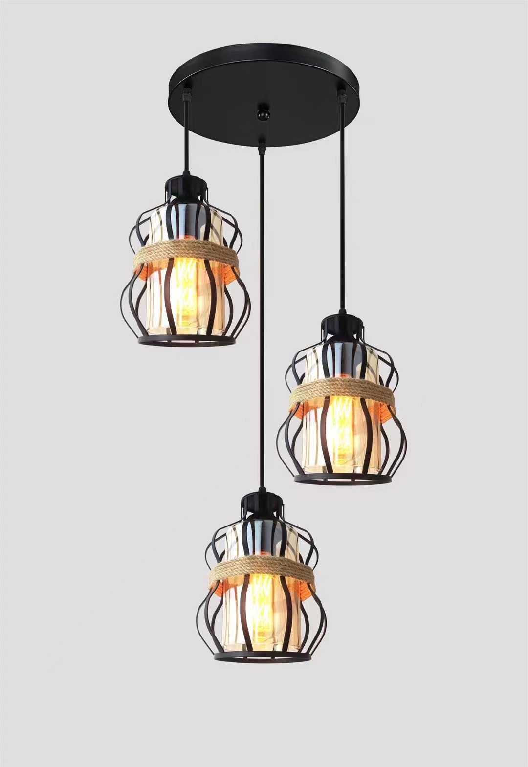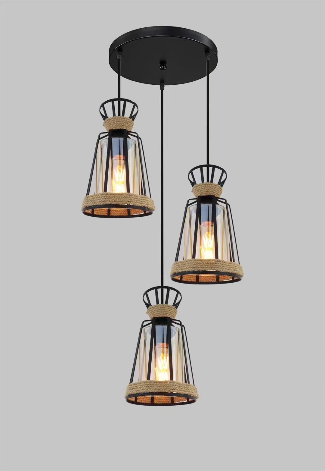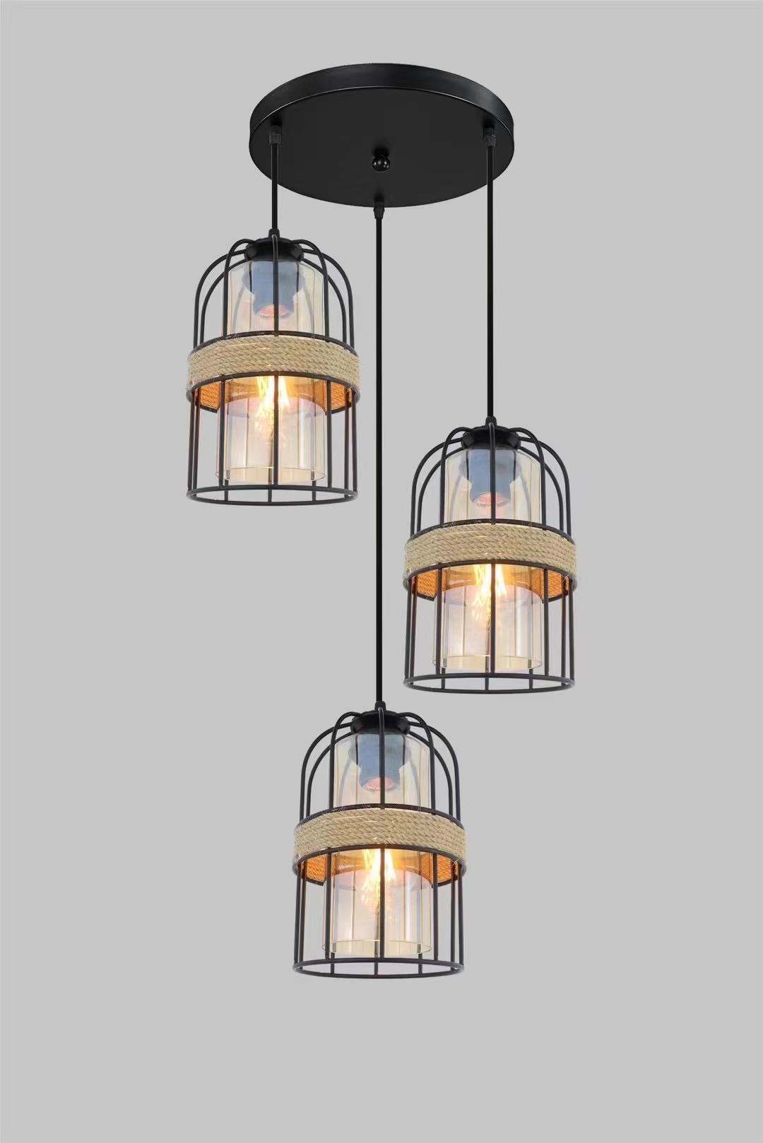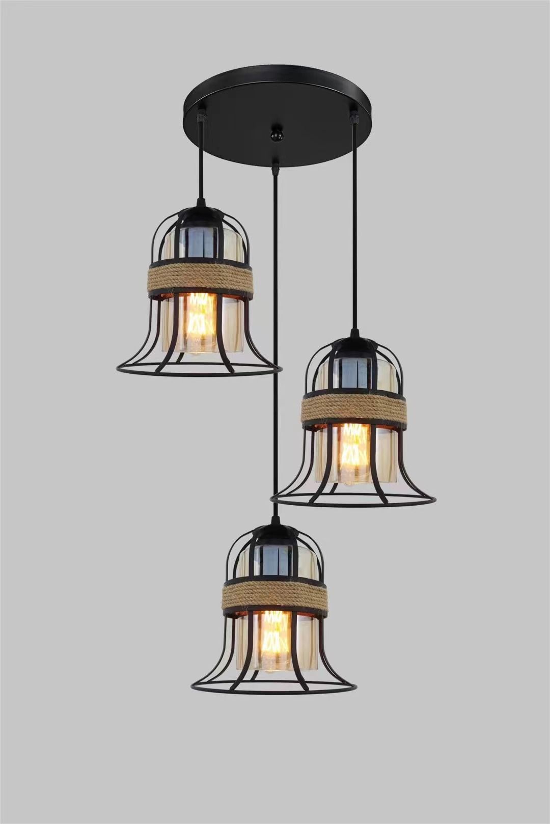 外贸专供loft怀旧工业风三头吧台灯具美式酒吧厅网咖麻绳吊灯