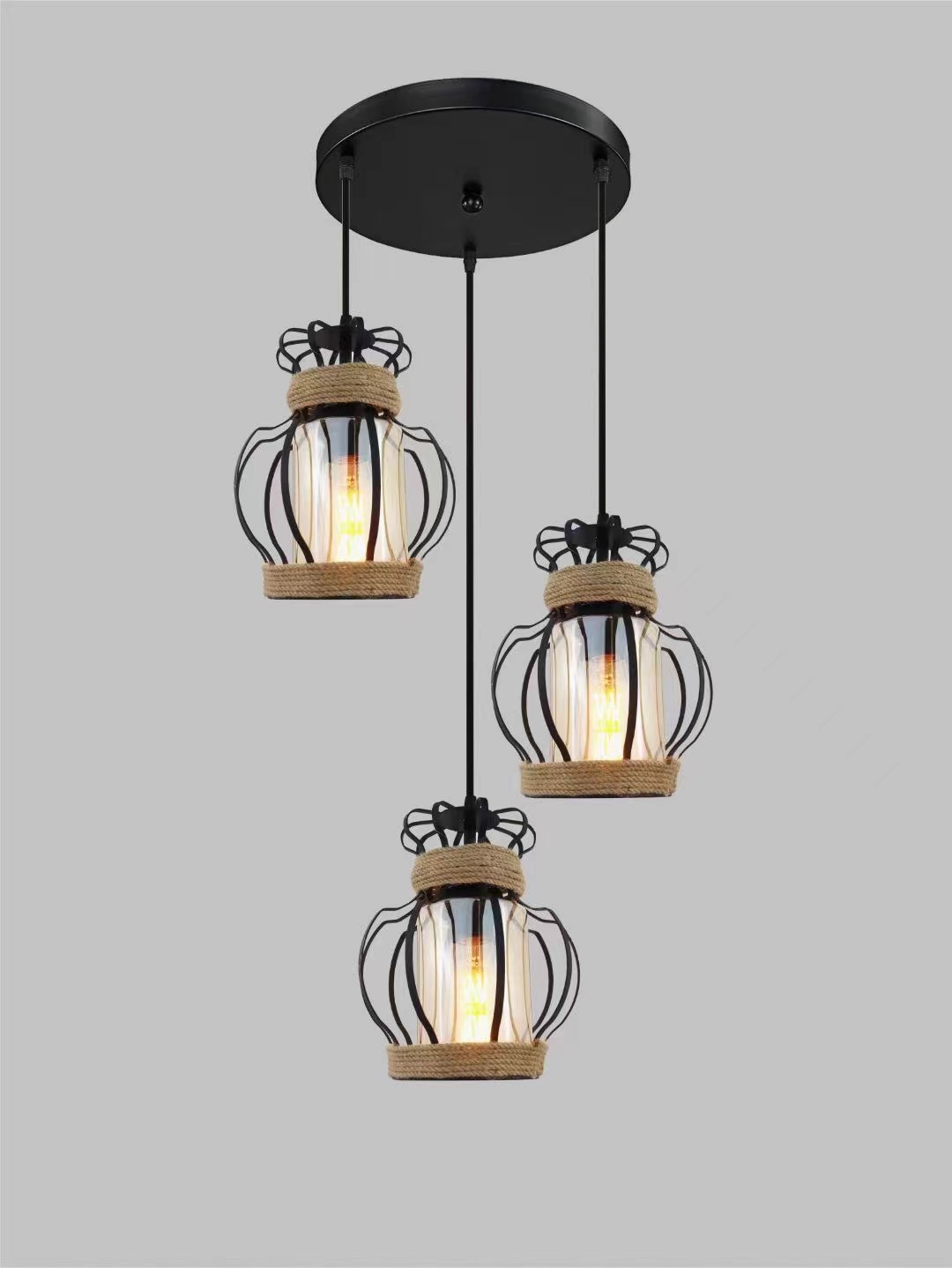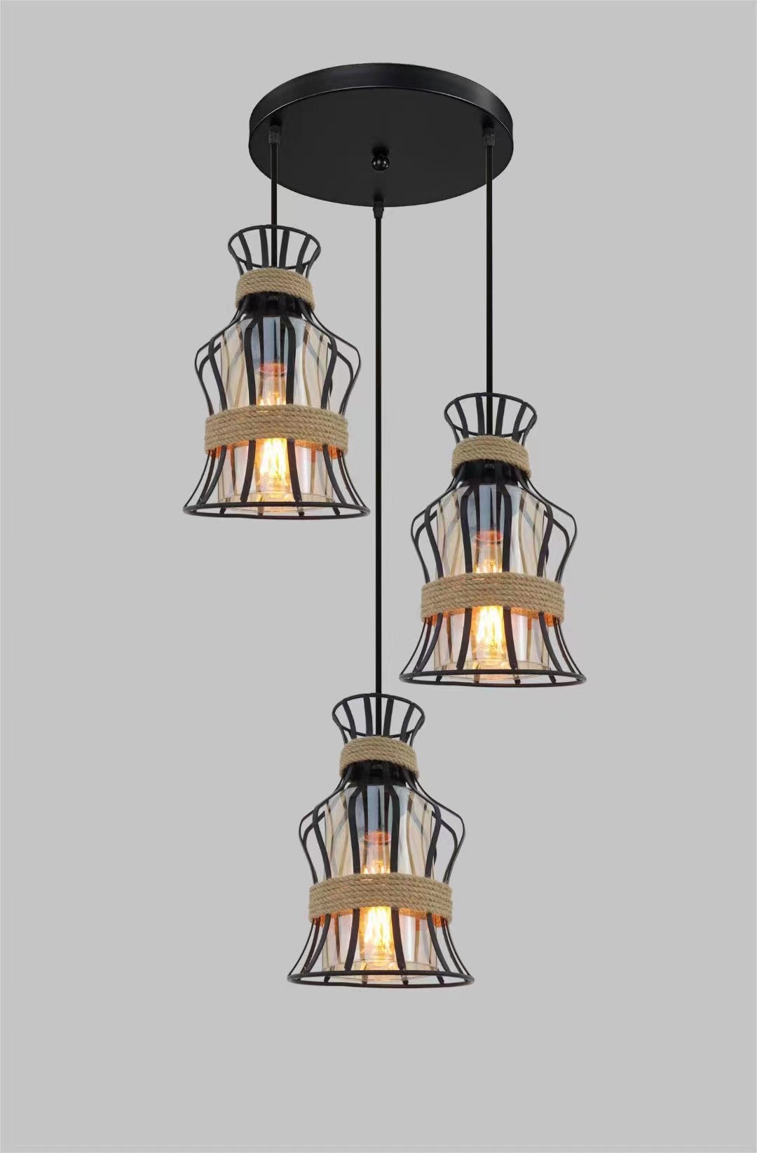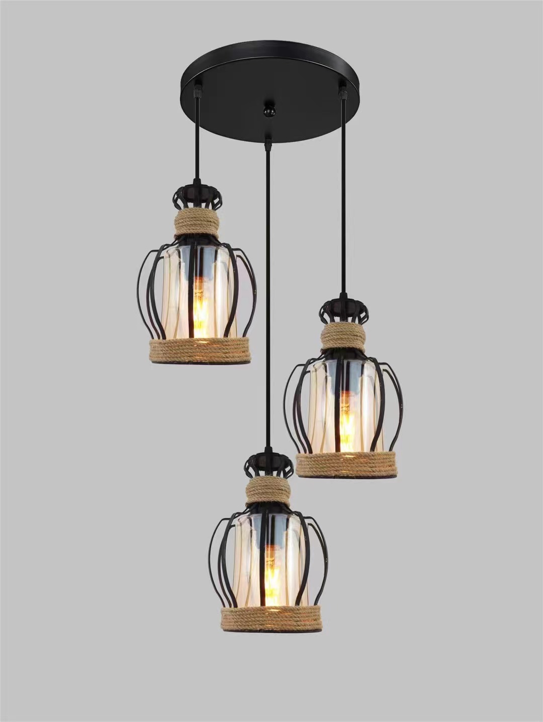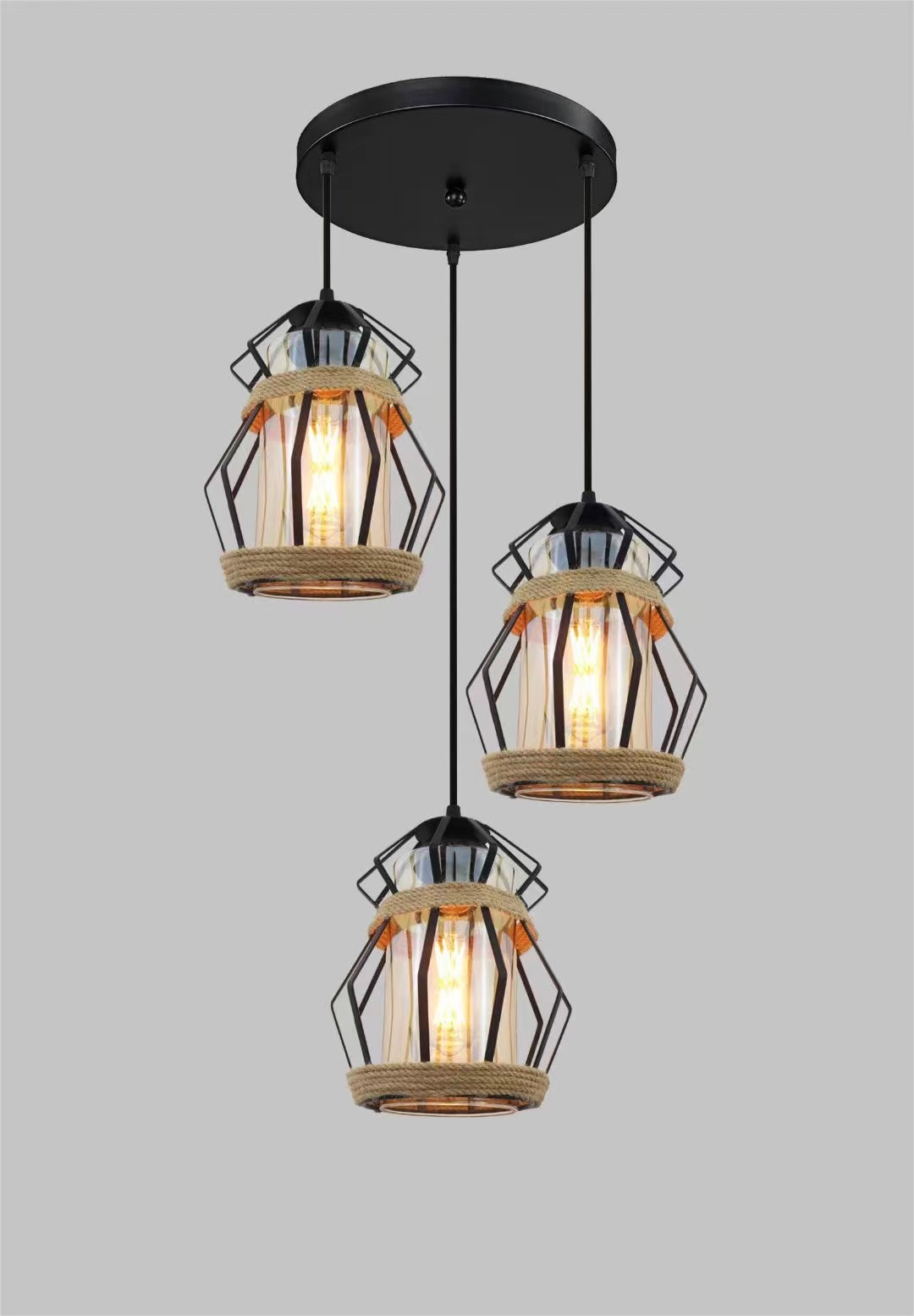 外贸专供loft怀旧工业风三头吧台灯具美式酒吧厅网咖麻绳吊灯