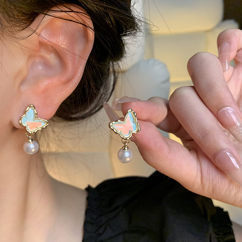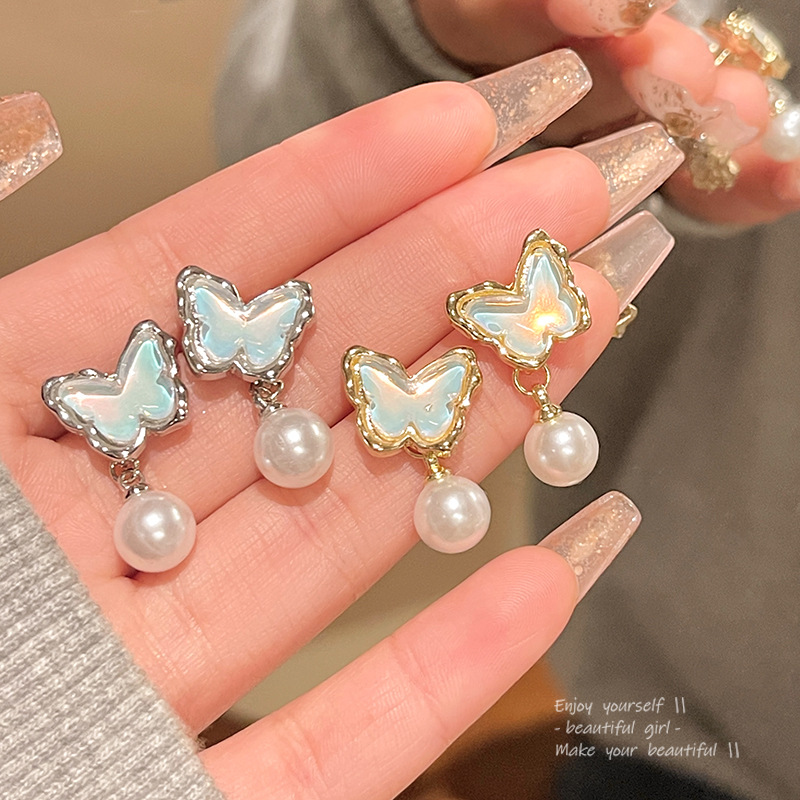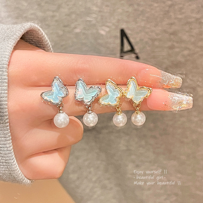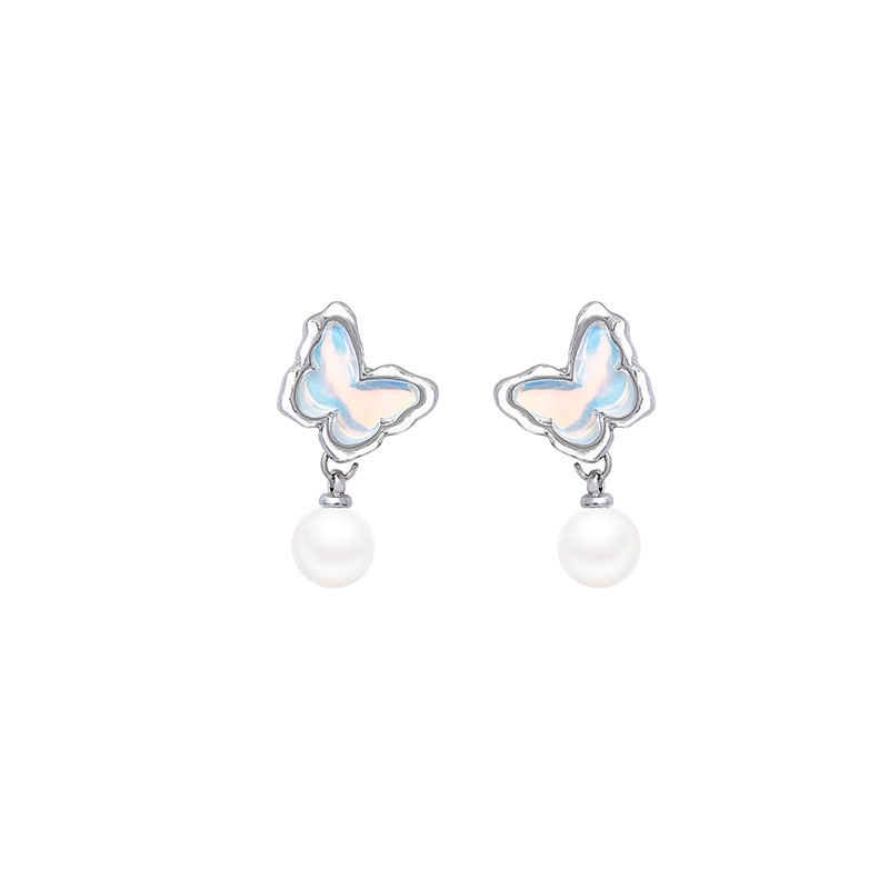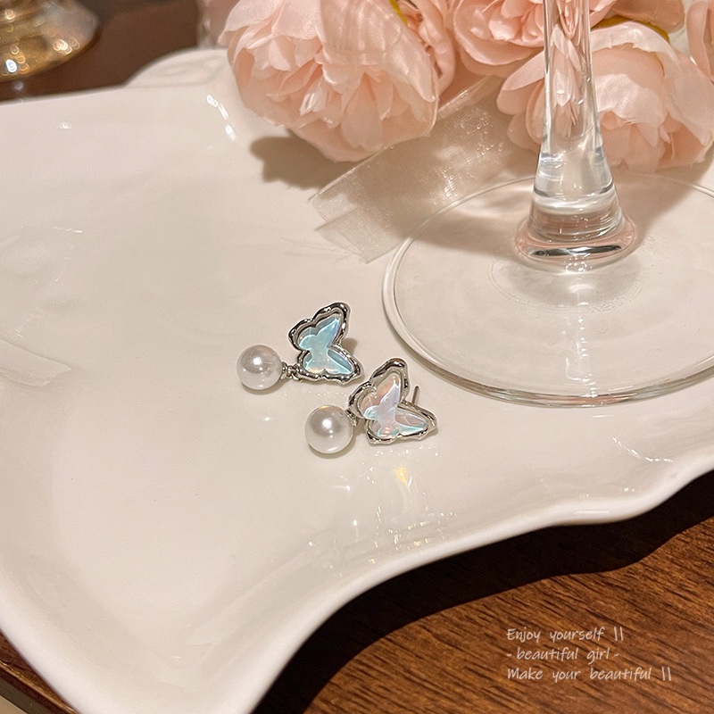 饰品S925银针小众高级感珍珠耳钉百搭气质耳饰蓝色海洋蝴蝶耳环女