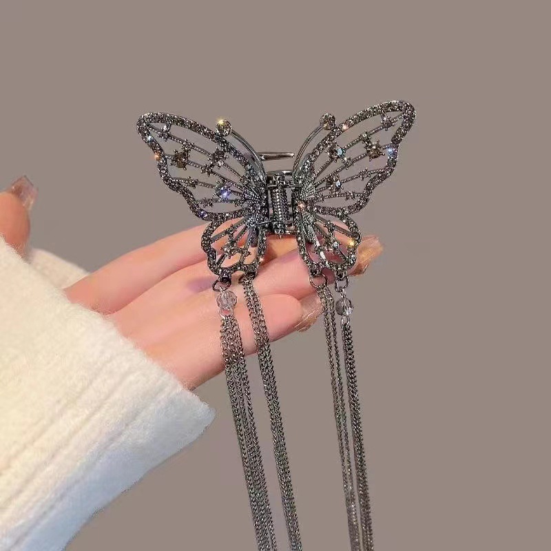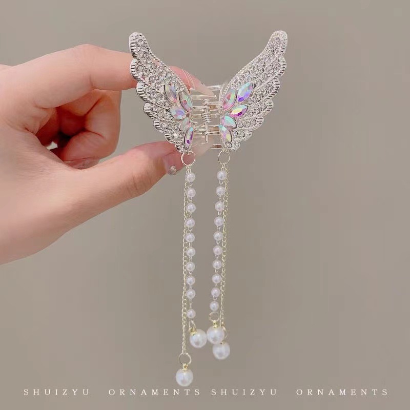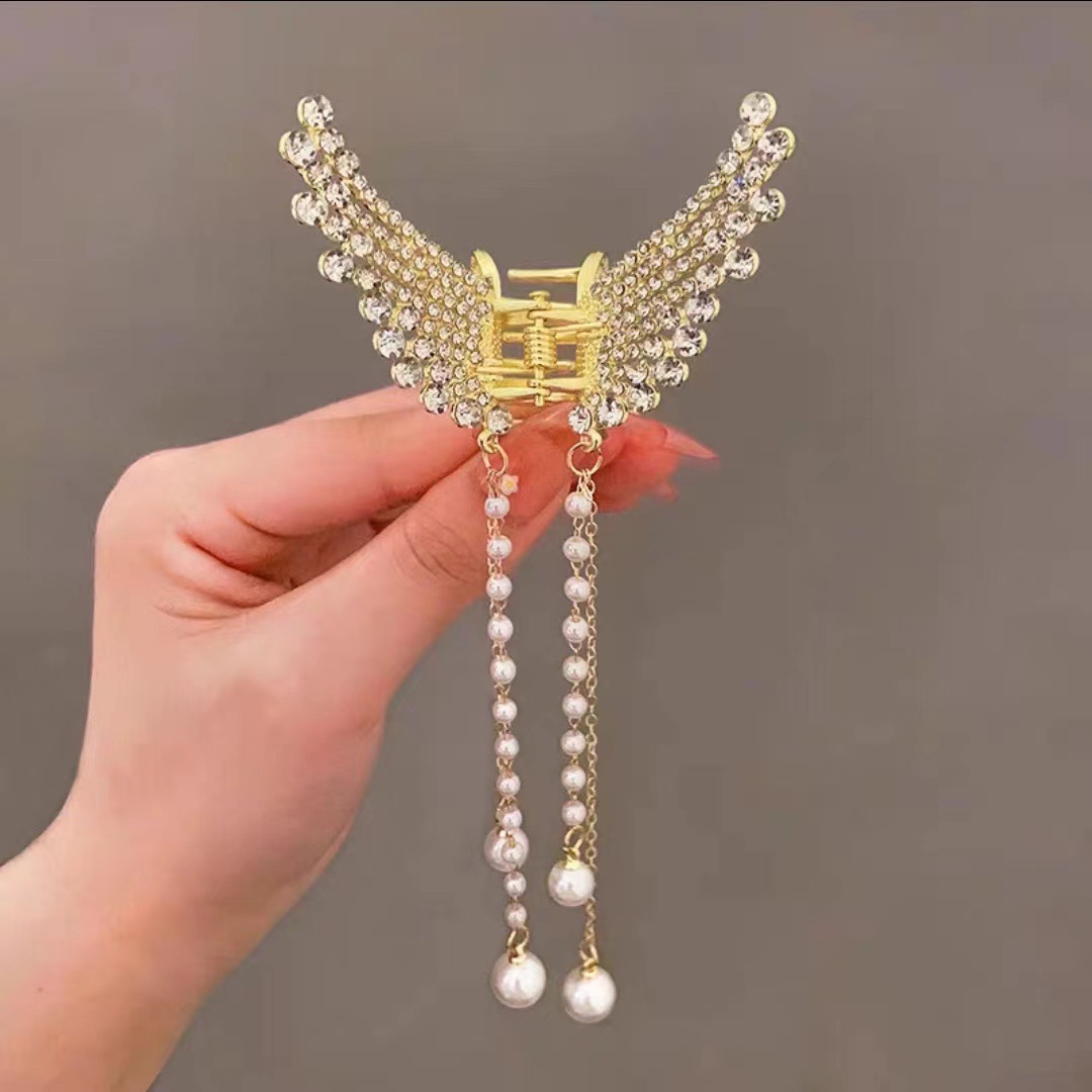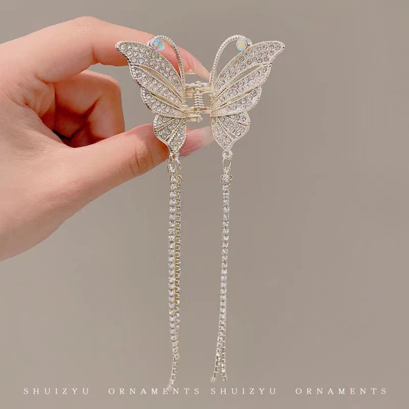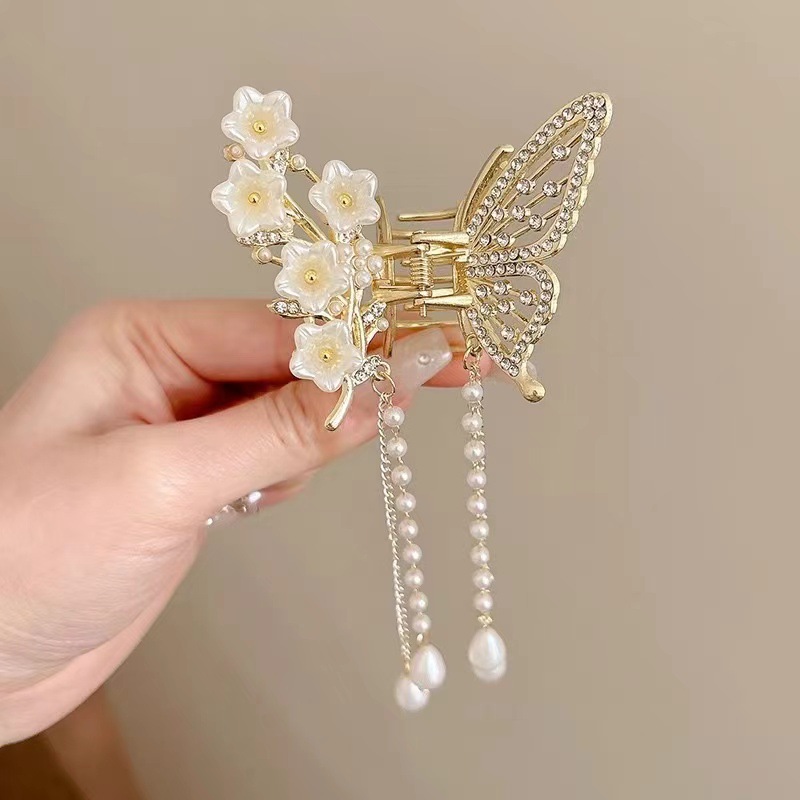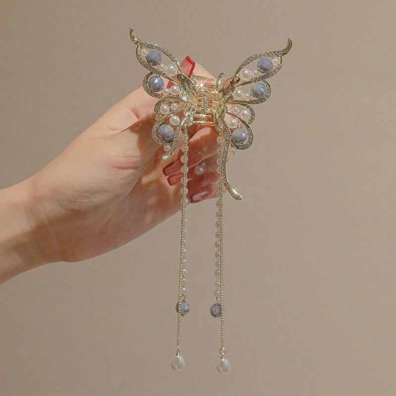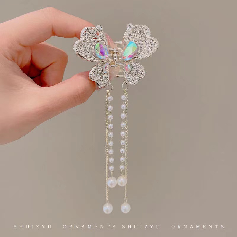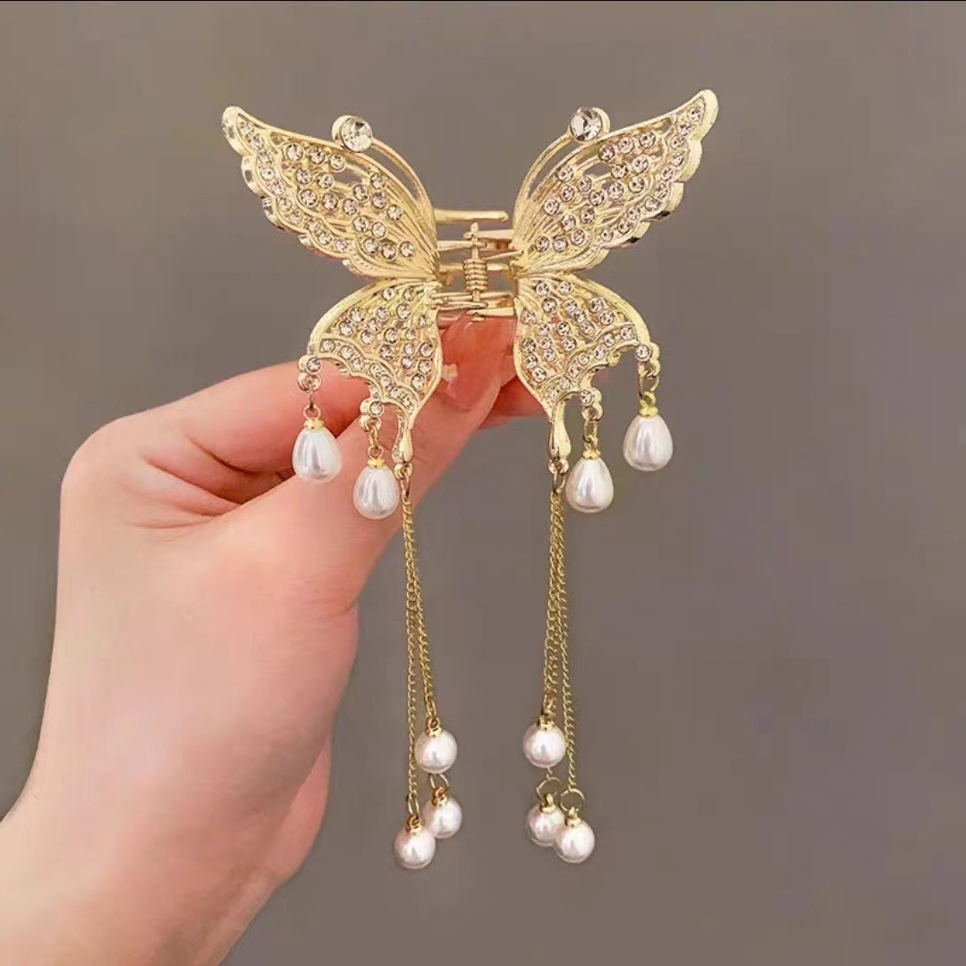饰品缕空镶钻珍珠蝴蝶流苏爪夹夏季金属发夹女后脑勺束发卡发抓夹
