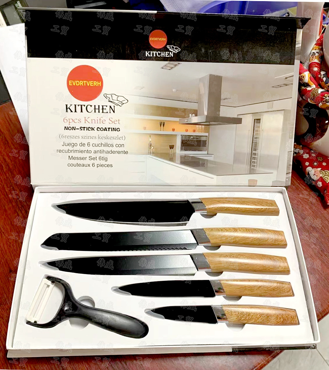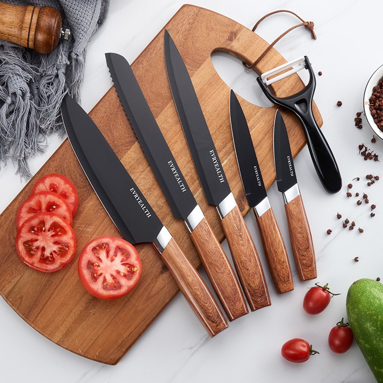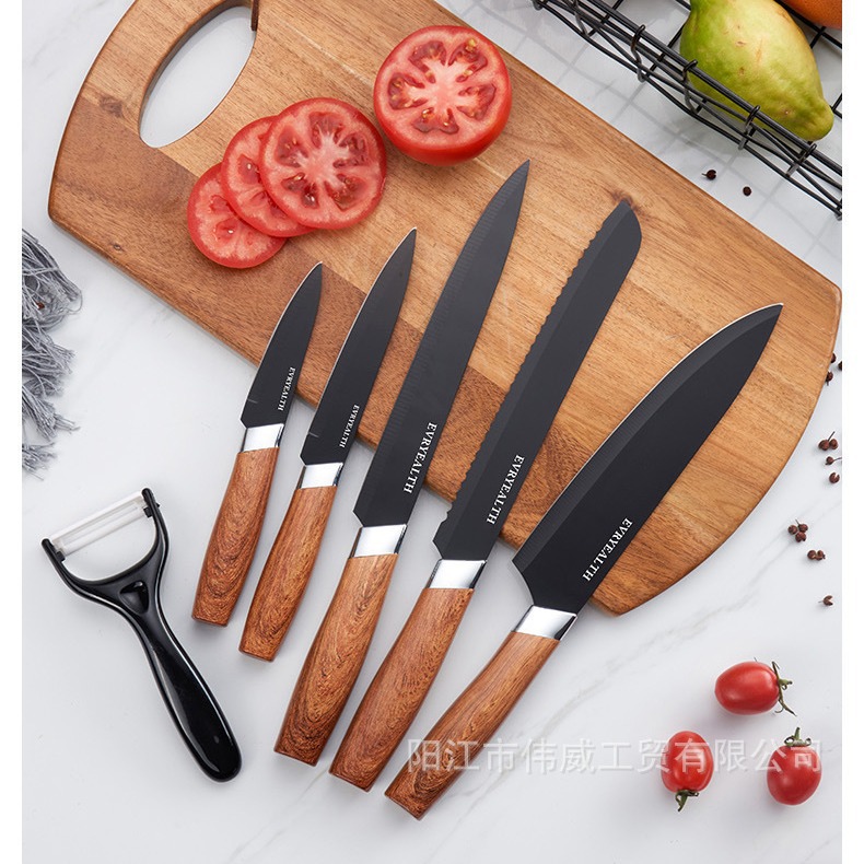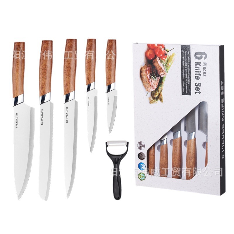 现货外贸不锈钢木纹柄厨房六件套装刀具套装厨房菜刀水果刀组合装