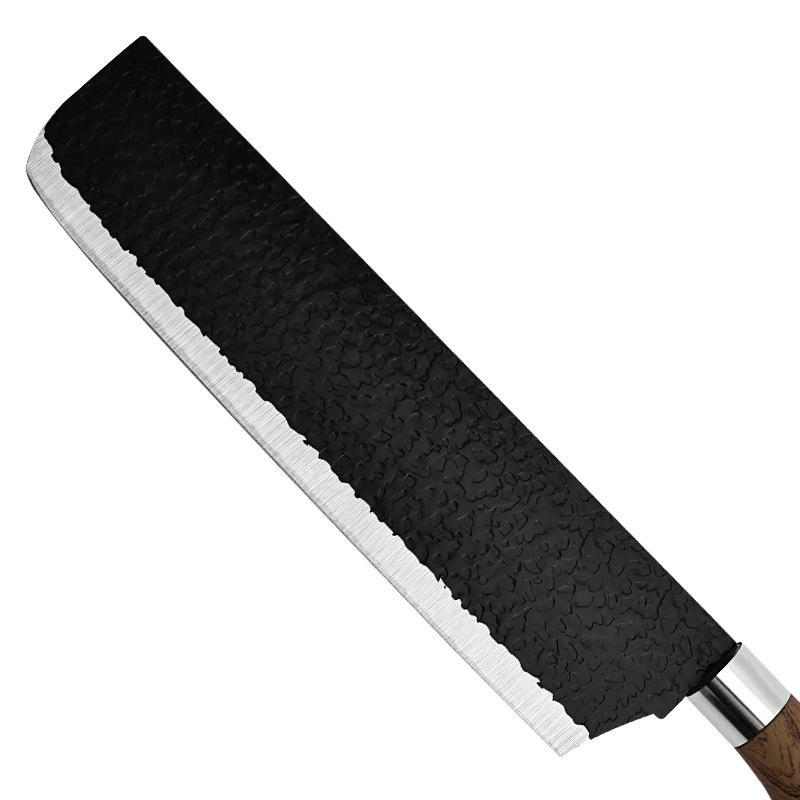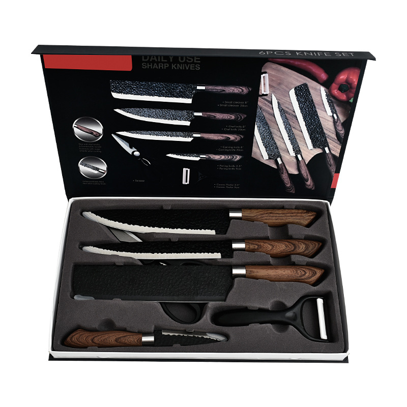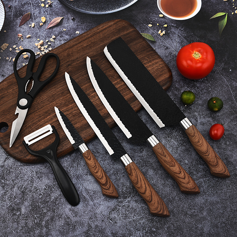 阳江菜刀不锈钢喷漆刀具木纹披覆柄锤纹锻打六件套刀商务礼品批发