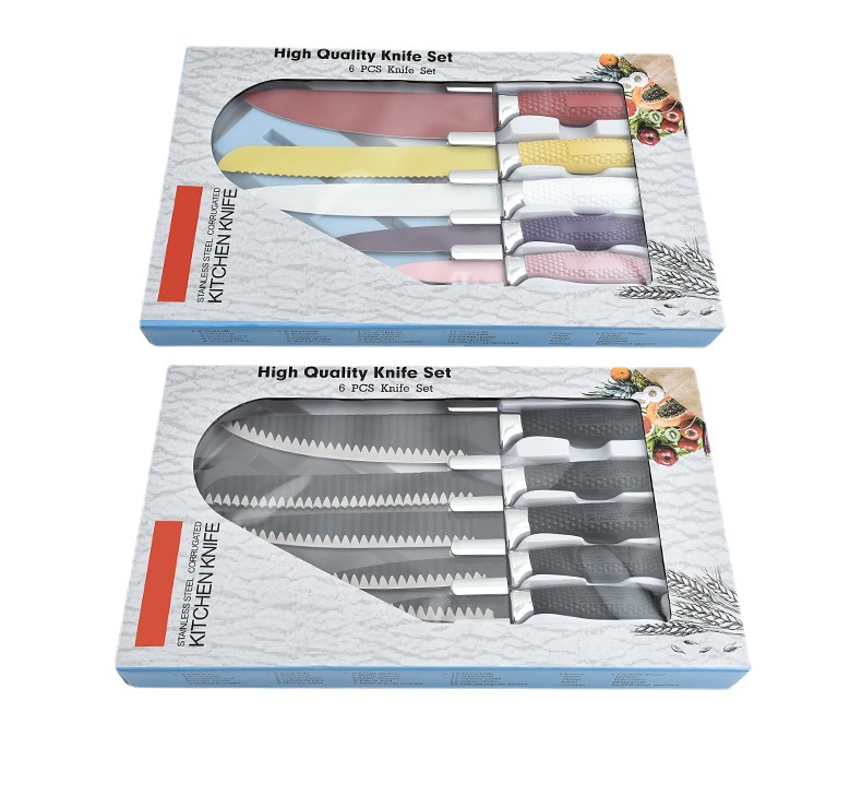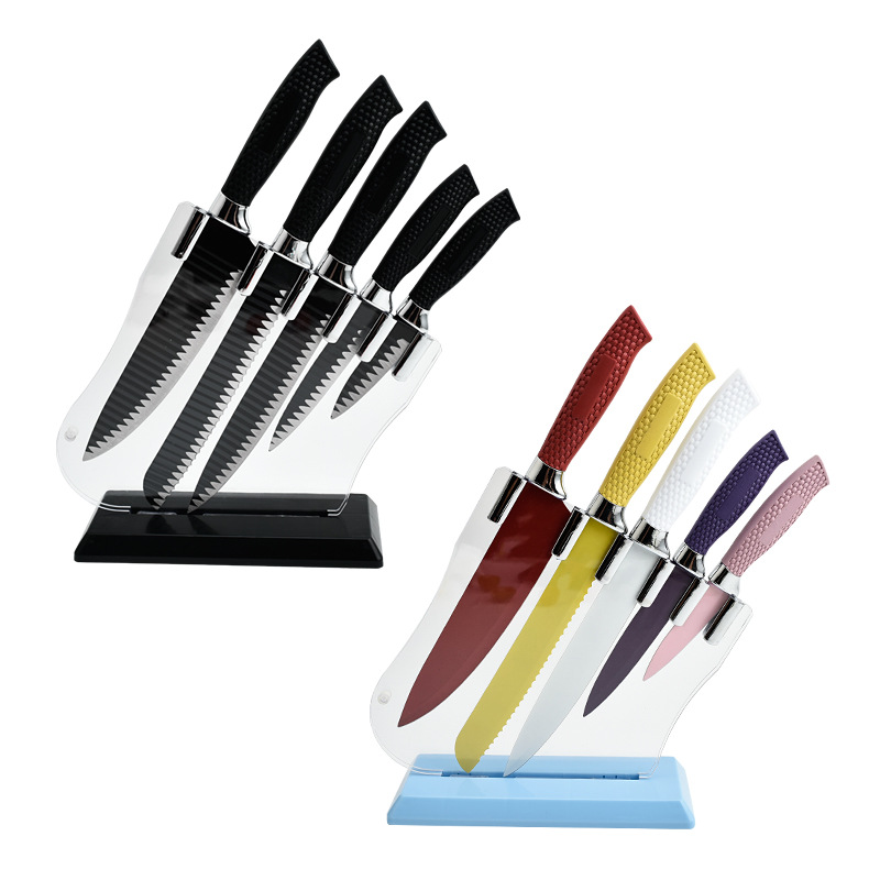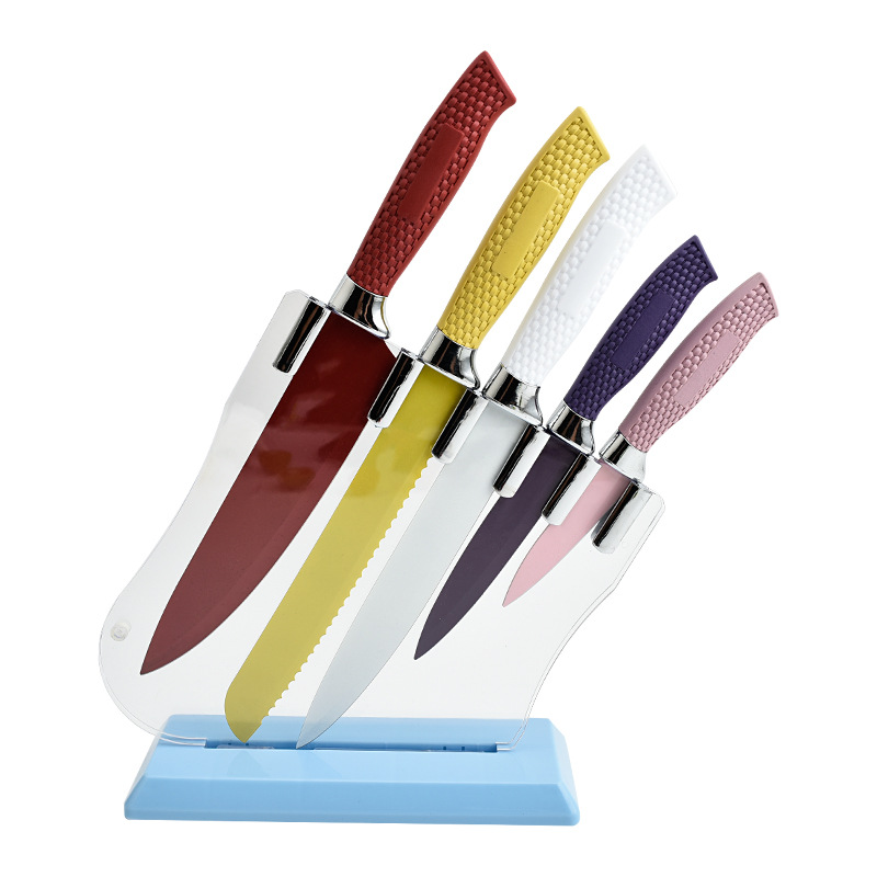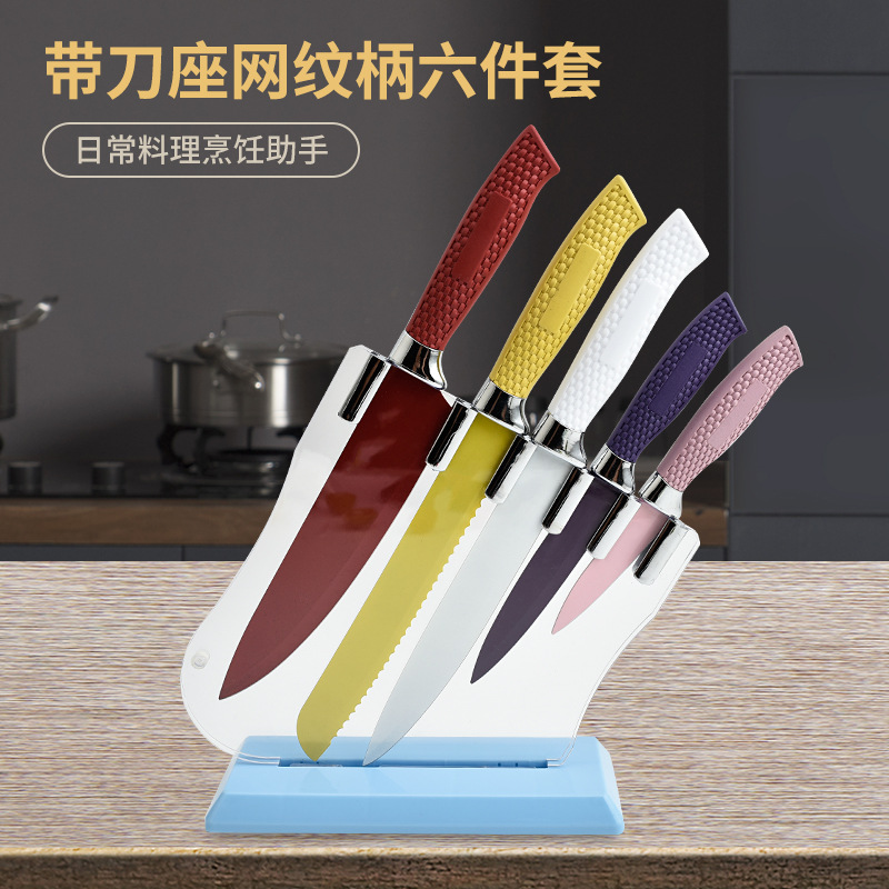 阳江菜刀不锈钢喷漆彩色网纹柄六件套带刀座商务礼品工厂加工定制