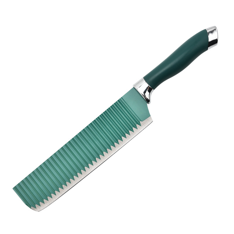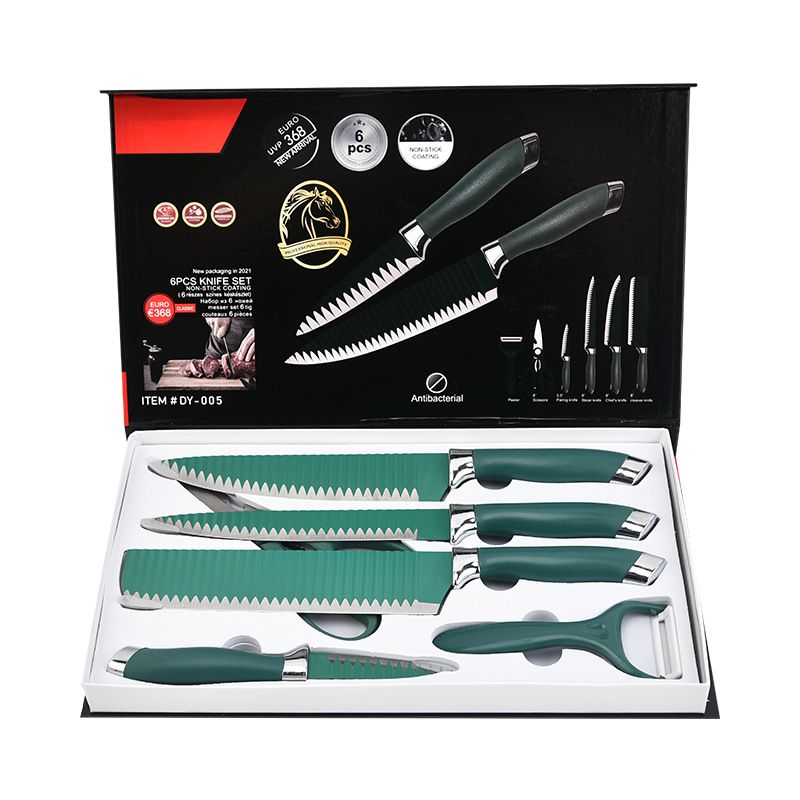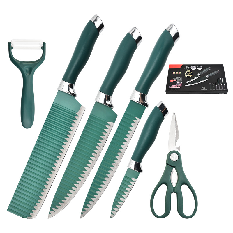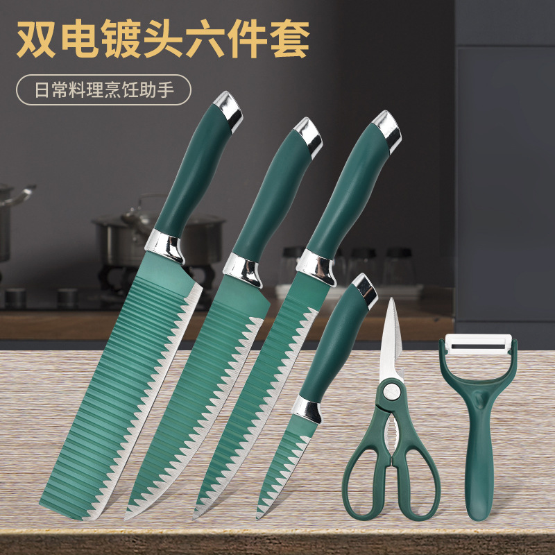 直供阳江菜刀不锈钢喷漆绿色波浪纹双电镀头六件套套刀加工定制
