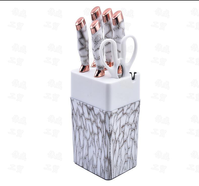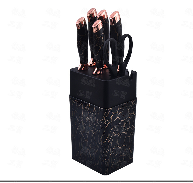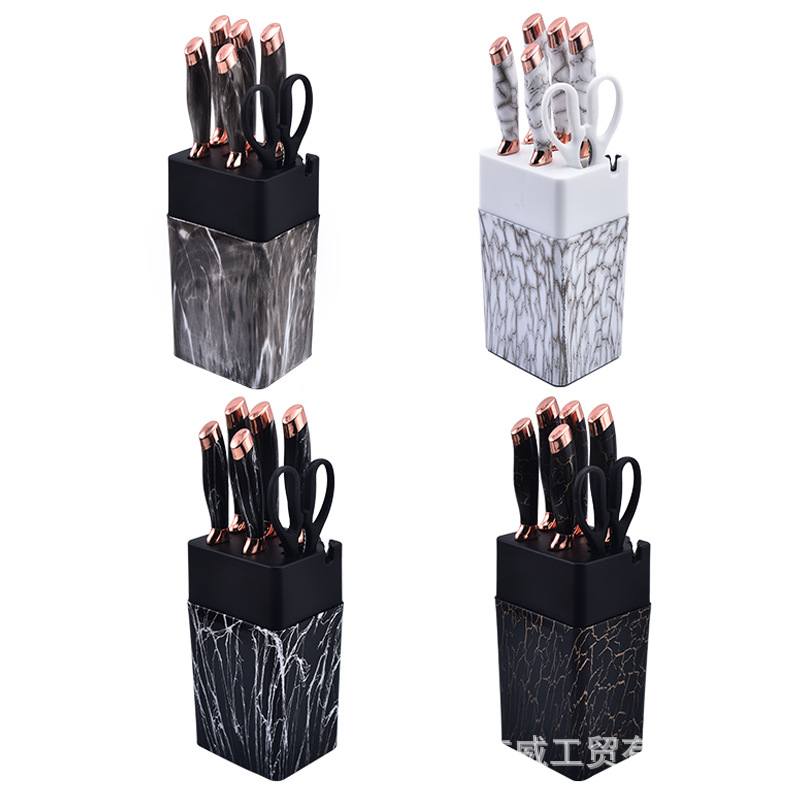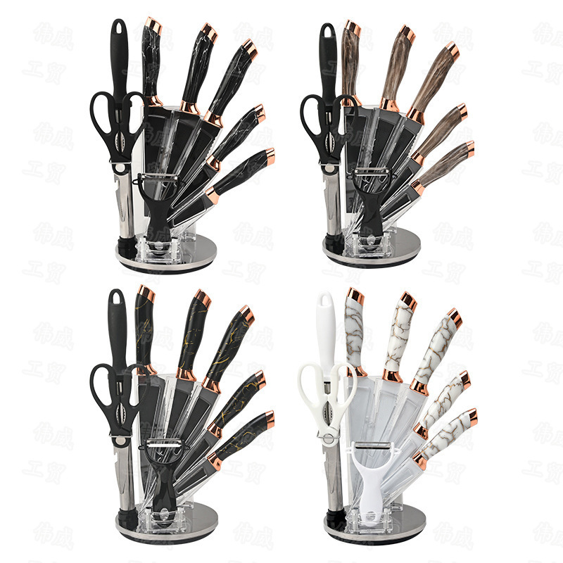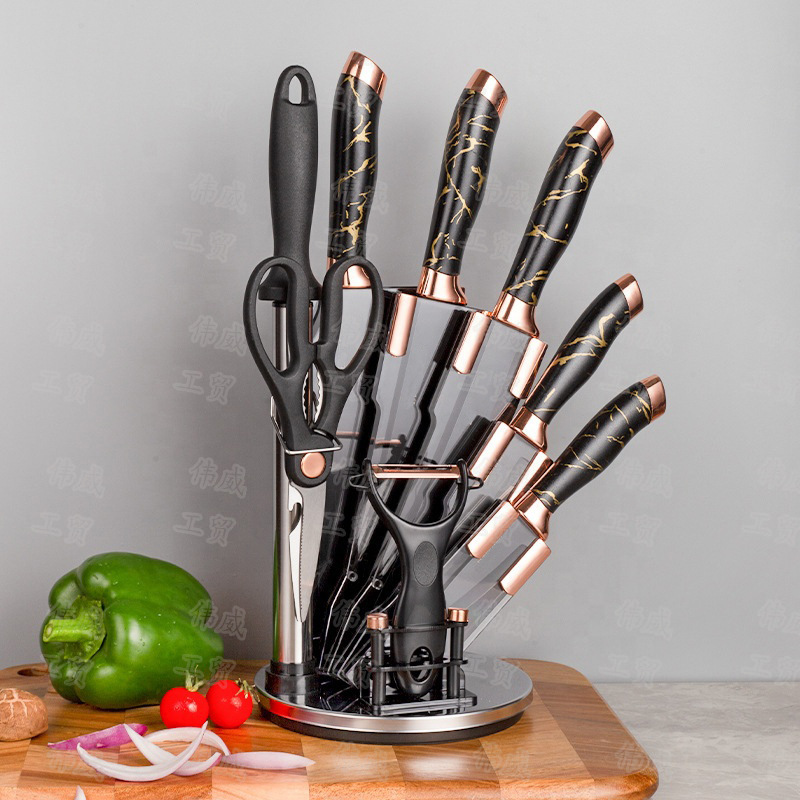 跨境电商直双电镀带旋转刀座厨房套刀批发不锈钢大理石纹喷漆刀具