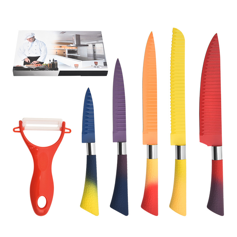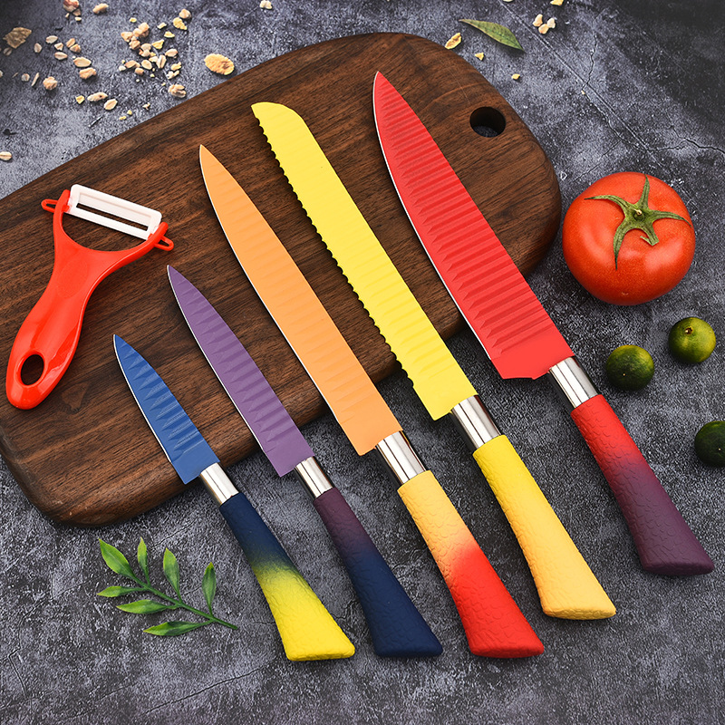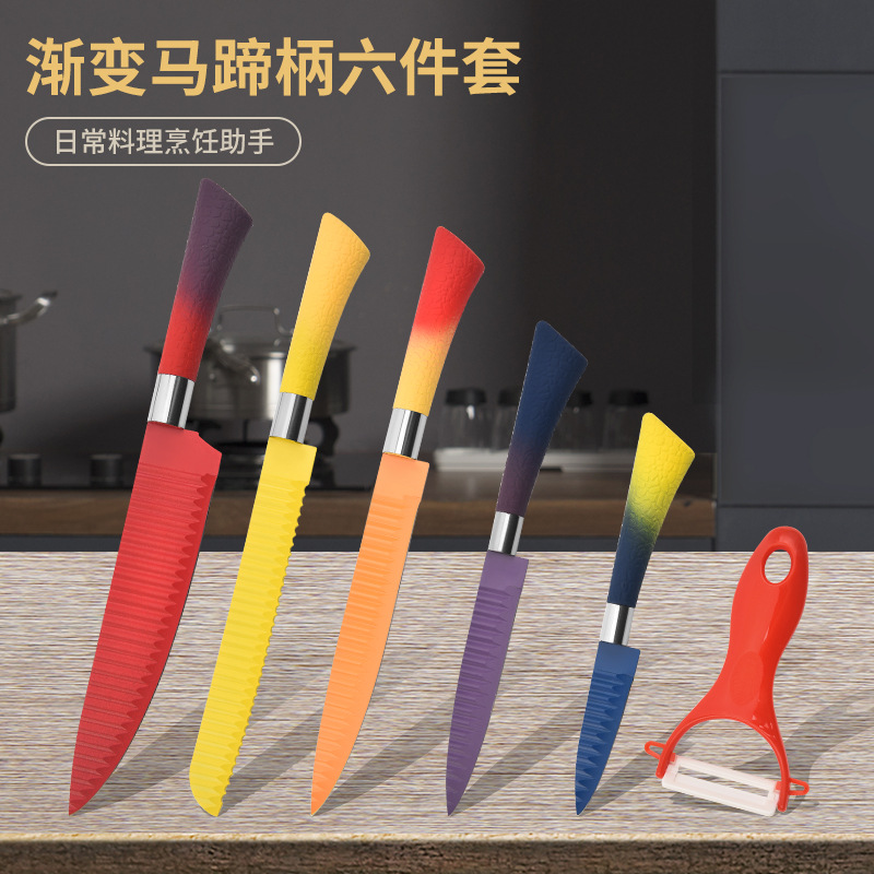 阳江菜刀不锈钢喷漆刀具彩色马蹄柄波浪纹六件套跨境直供现货批发
