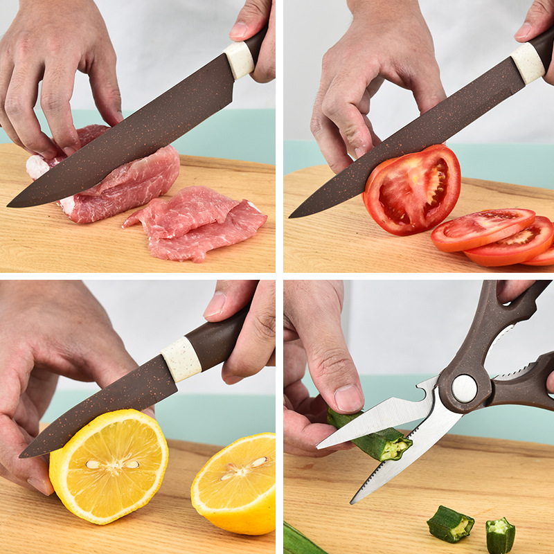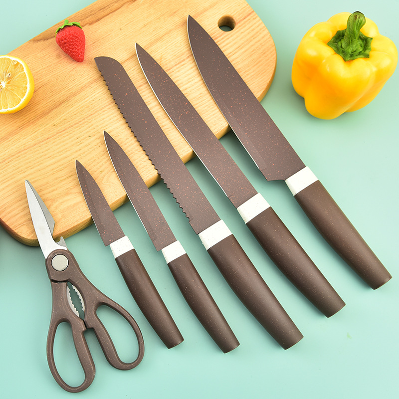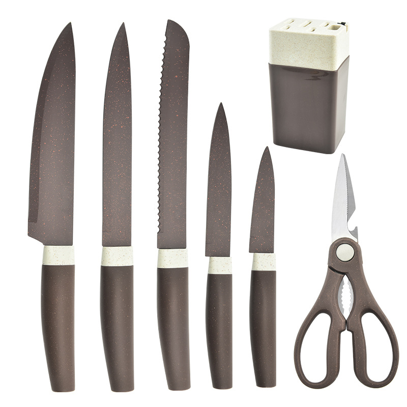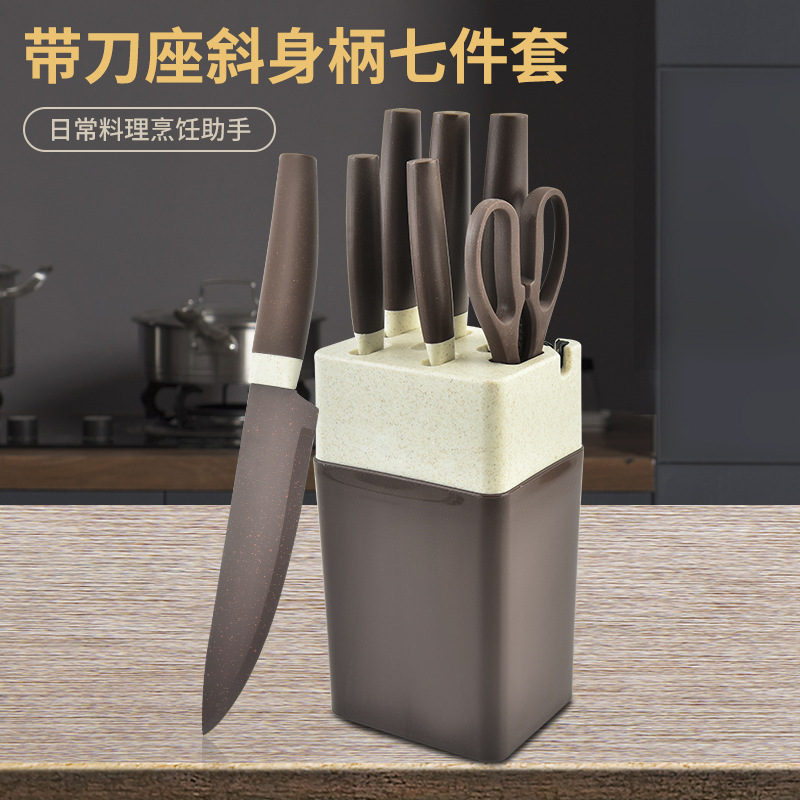 阳江菜刀 不锈钢喷漆刀具 斜身柄带四方刀座七件套刀跨境直供现货