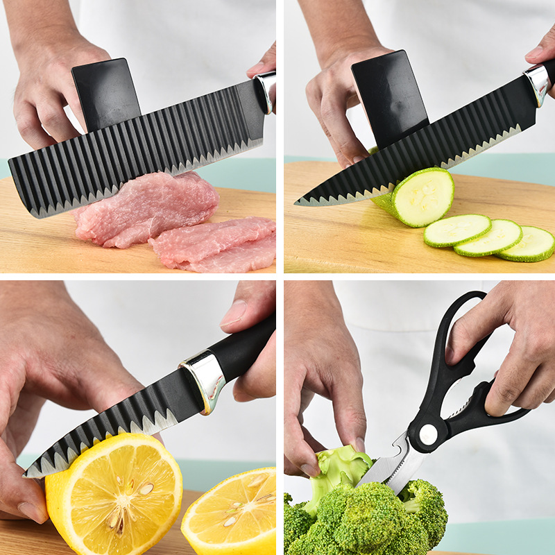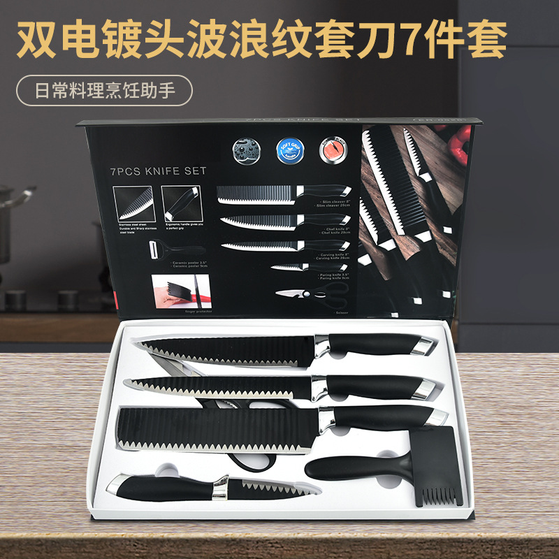 阳江菜刀不锈钢喷漆刀具双电镀头波浪纹七件套刀带护手器源头工厂