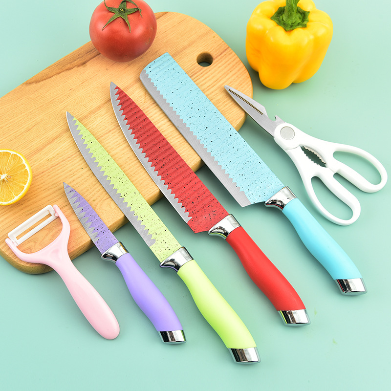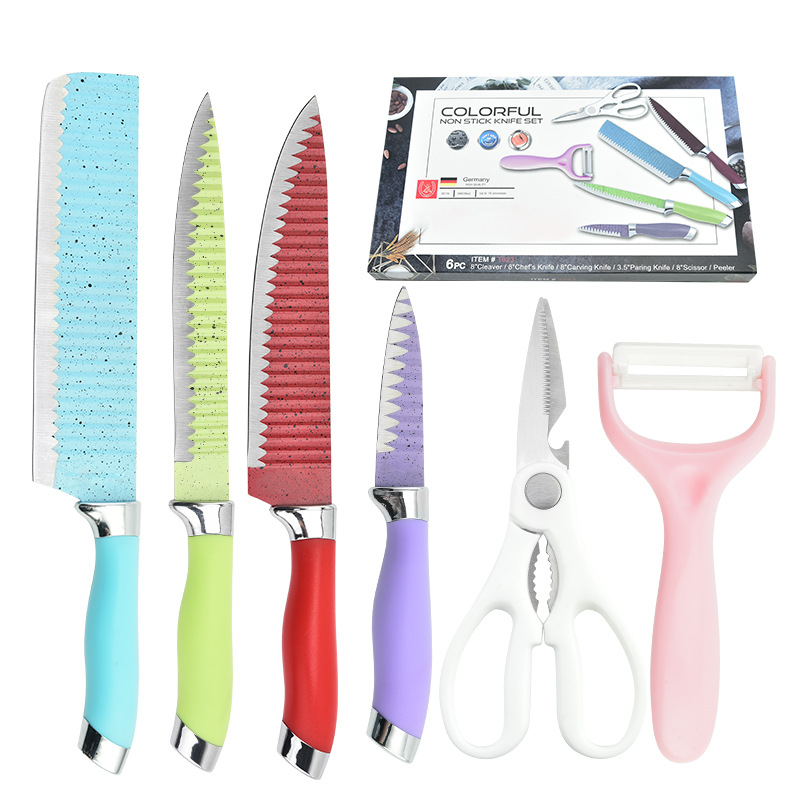 阳江菜刀不锈钢喷漆刀具彩色双电镀头波浪纹六件套刀源头工厂批发