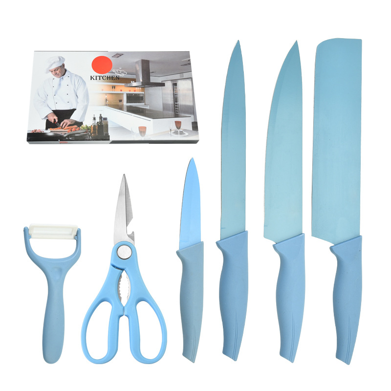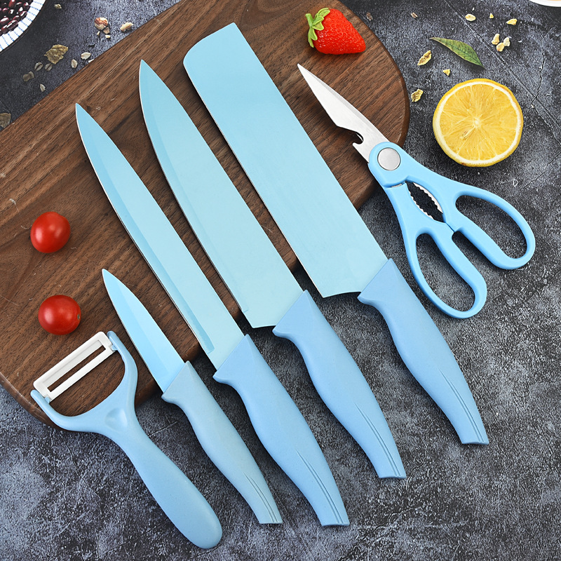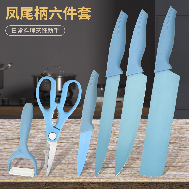 阳江菜刀不锈钢喷漆刀具蓝色燕尾柄六件套刀跨境直供源头工厂批发