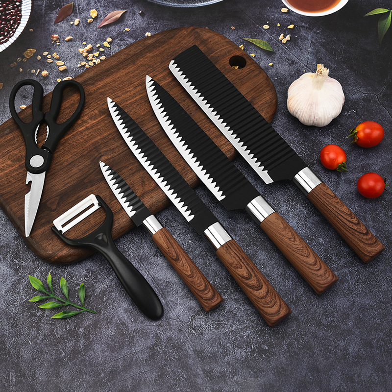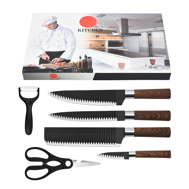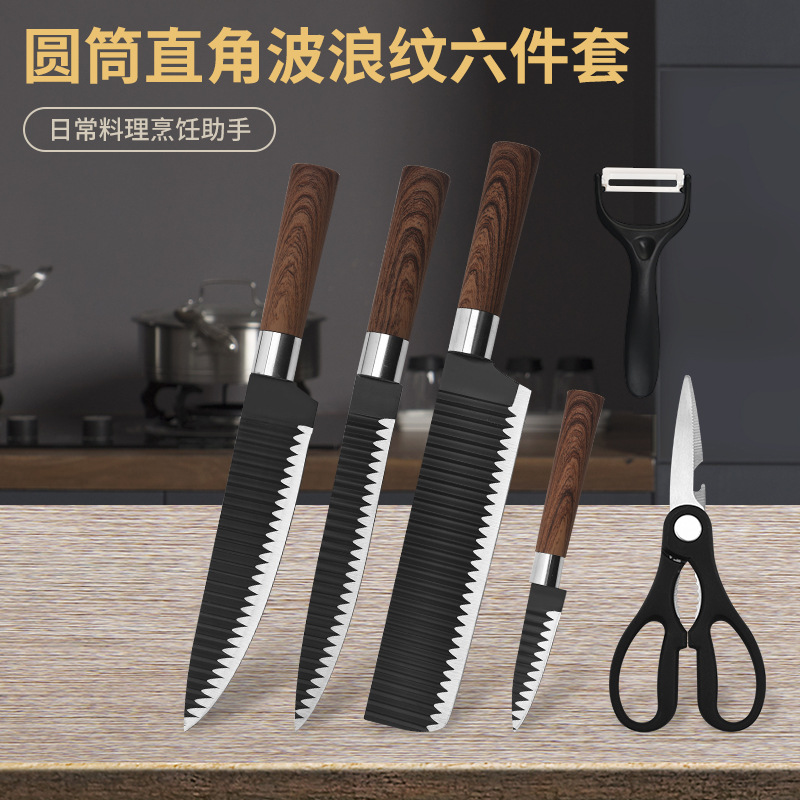阳江菜刀不锈钢喷漆刀圆筒直角柄波浪纹六件套刀商务礼品厂家批发