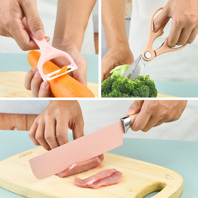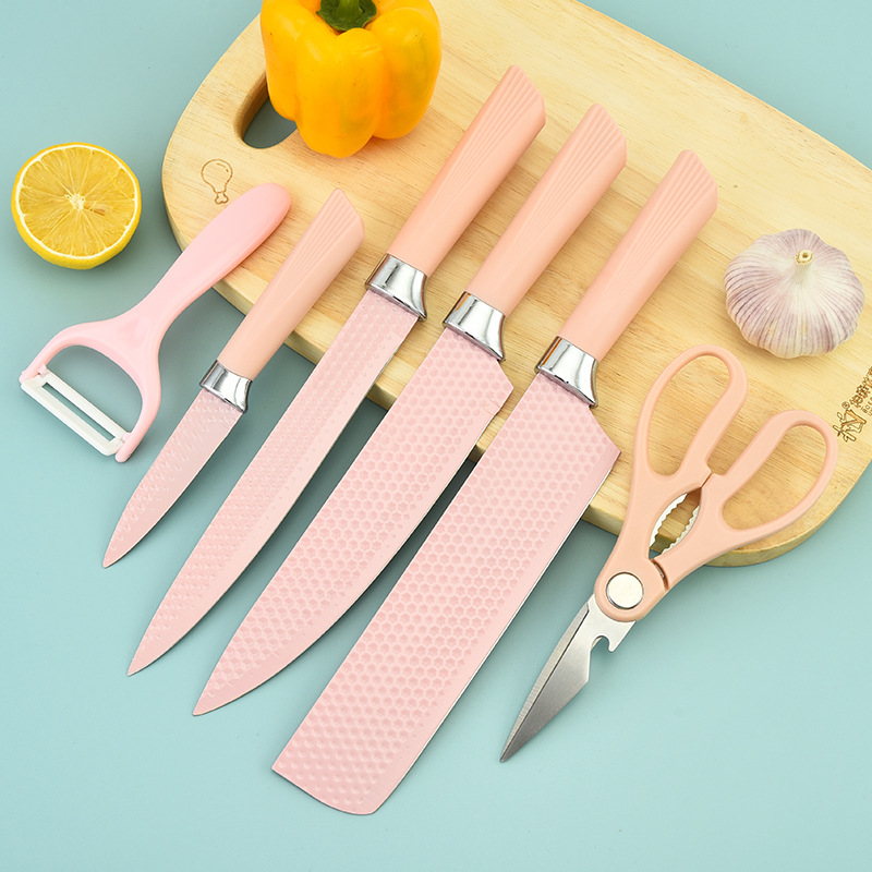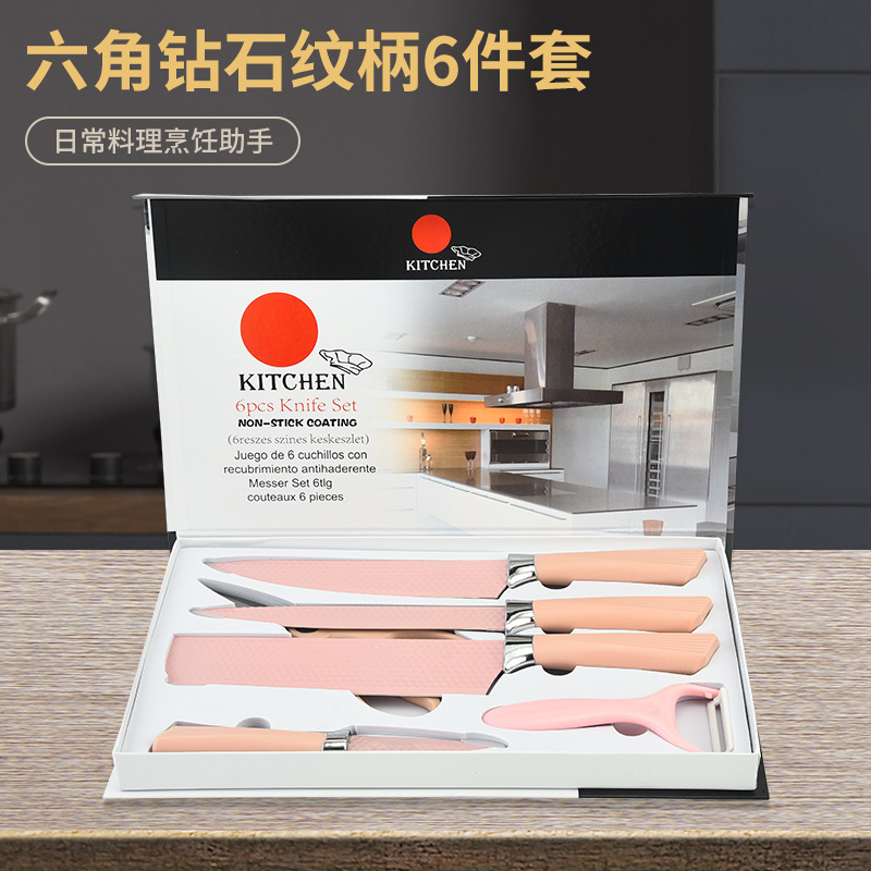 阳江菜刀 不锈钢喷漆刀具粉色六角钻石纹扇贝柄六件套刀 厨房刀具